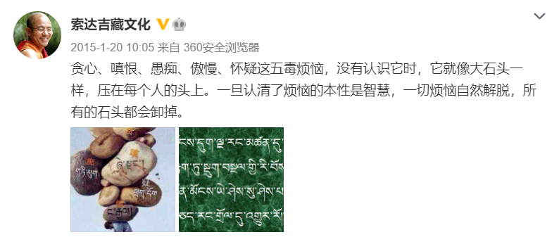 贪心、嗔恨、愚痴、傲慢、怀疑这五毒烦恼,没有认识它时,它就像大石头一样,压在每个人的头上。一旦认清了烦恼的本性是智慧,一切烦恼自然解脱,所有的石头都会卸掉。
