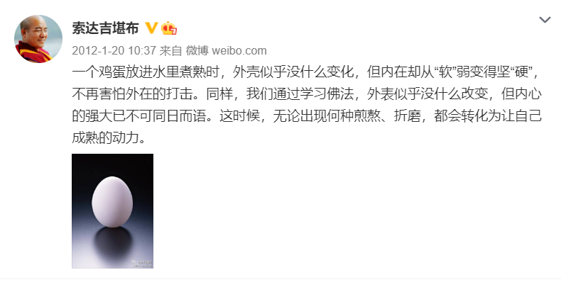 一个鸡蛋放进水里煮熟时,外壳似乎没什么变化,但内在却从“软”弱变得坚“硬”,不再害怕外在的打击。同样,我们通过学习佛法,外表似乎没什么改变,但内心的强大已不可同日而语。这时候,无论出现何种煎熬、折磨,都会转化为让自己成熟的动力。