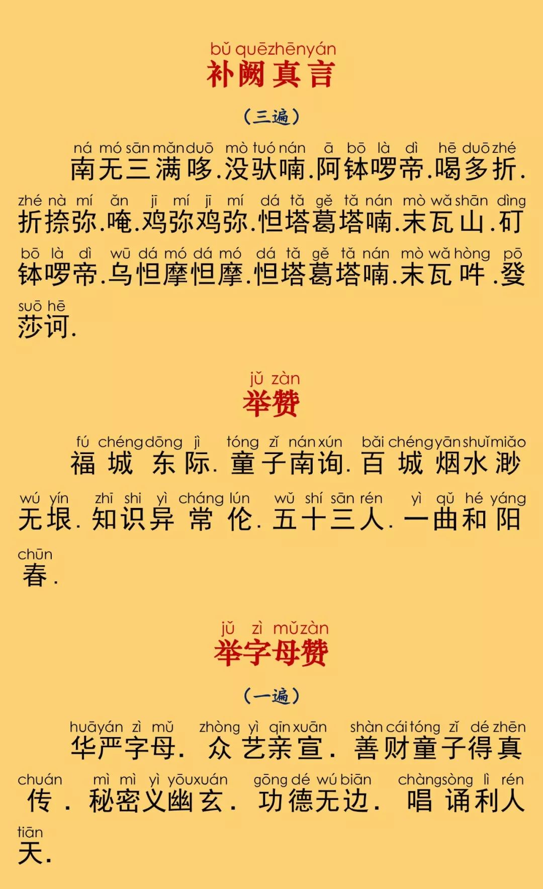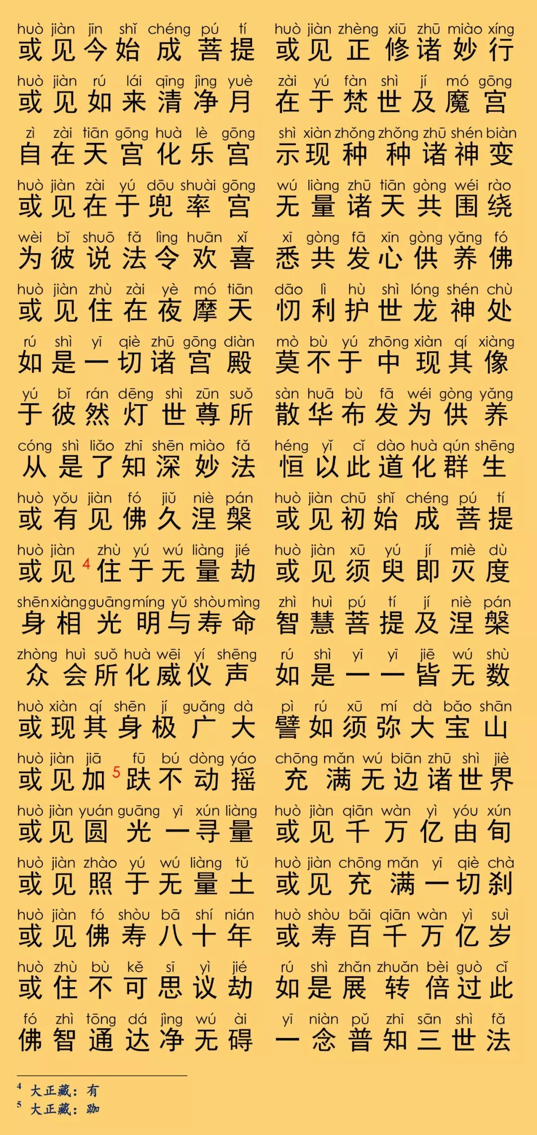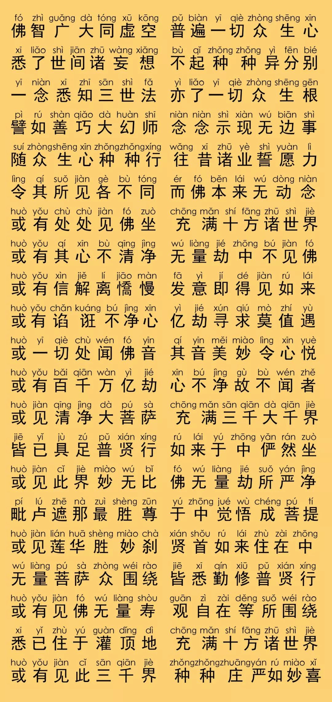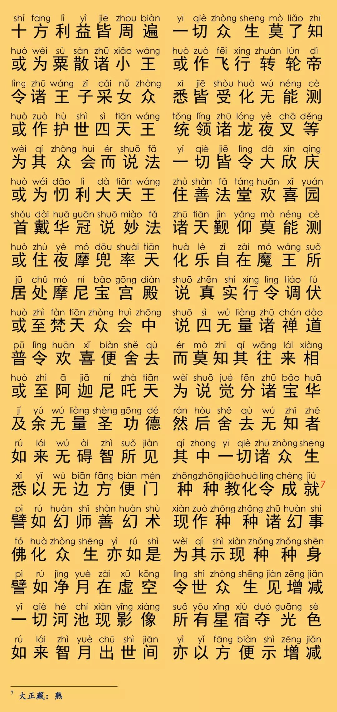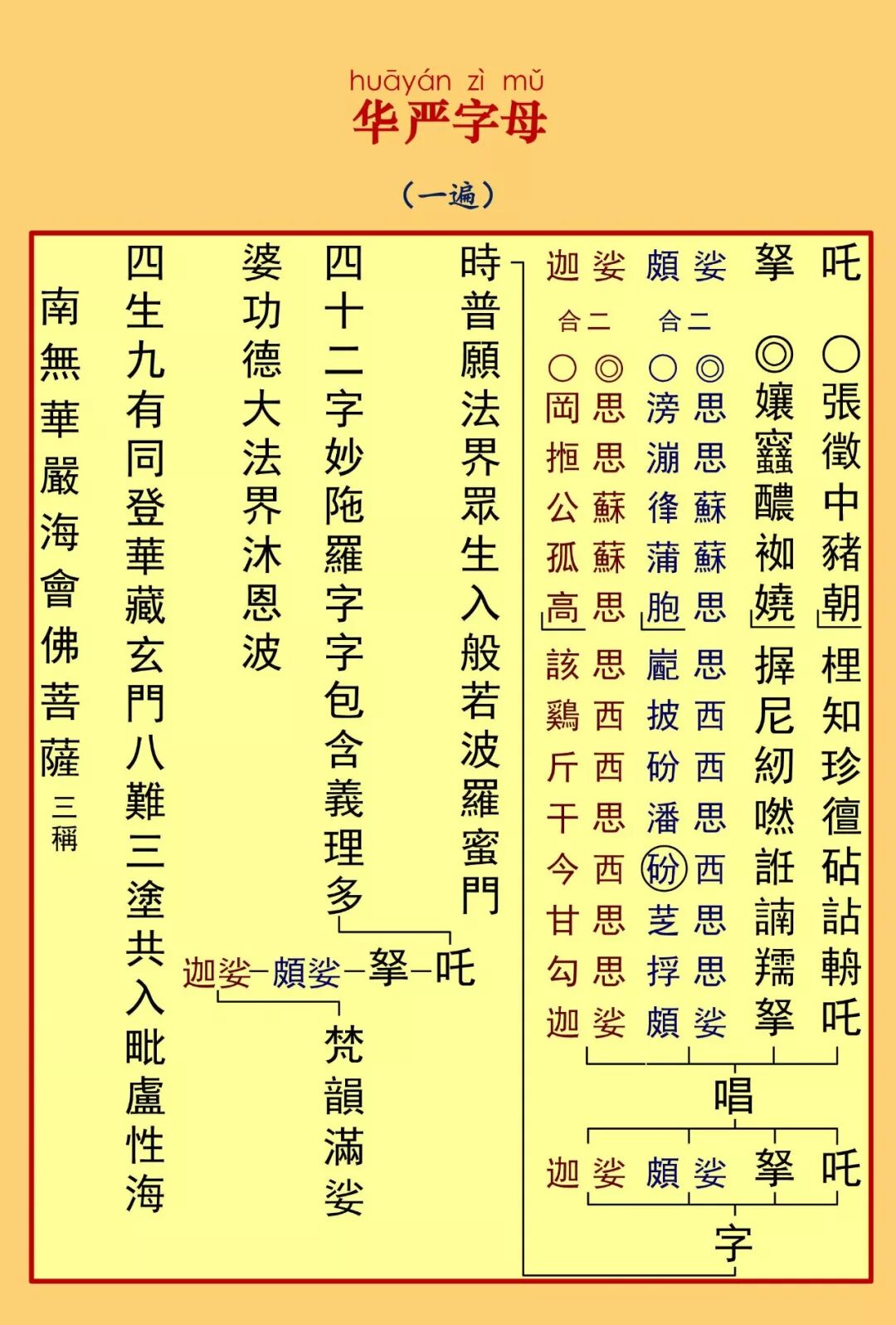 根据《乾隆大藏经》大乘华严部,第0084部,唐于阗国三藏沙门实叉难陀译《大方广佛华严经》(80卷)原藏影印本校正注音。读诵仪轨取自福建莆田广化寺《大方广佛华严经》印本,华严字母根据柏林禅寺《华严字母》印本校正,句读及注音仅供参考。每卷的三个华严字母梵唱音频与该卷的华严字母相对应,由印能法师唱诵,至七十三卷后,每卷为四个华严字母。设计排版说明:本注音佛经内容,由仁慧草堂编辑设计制作,如需转载请联系作者公众号,特此说明。