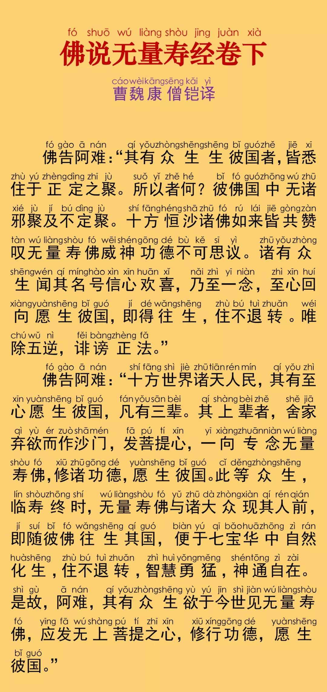根据《乾隆大藏经》大乘宝积部,第0024部,曹魏康僧铠译《佛说无量寿经》原藏影印校正注音。句读及注音仅作参考。特此说明。