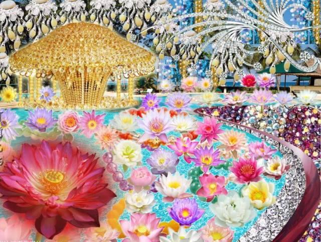 极乐世界处处分布着美丽的七宝池,大如湖泊,池底铺着金沙,池边是宝物所庄严的阶道,池中盈满味如甘露的八功德水。