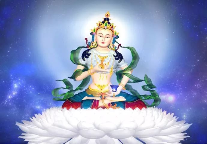 我们观想在自己前面的虚空当中,莲花和月轮之上,一切三世诸佛的总集——金刚萨埵,身色就像皎洁的月亮一样是白色的,手持铃杵,著报身服饰,智慧的光芒现于整个世界。如果自己的心性和密宗的生圆次第达到一定的成熟,你可以观想双身的金刚萨埵,如果还没有达到这种境界,你在自己的前面观想一个平时在照片当中所看到的金刚萨埵佛像。这就叫作所依对治力。我们在忏悔的时候,最好观想这样的金刚萨埵作为所依。