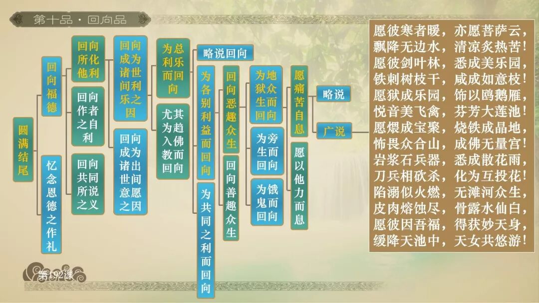 对于本课所讲的八热地狱、八寒地狱、近边地狱(剑叶林、煻煨炕、铁柱山等)、孤独地狱(五百比丘互相砍杀之公案)等(共称为十八地狱)所感受的苦果及其苦因,寿量、位置等概念需要有基本的了解,之后方能逐步体会作者以智悲双运所发之回向愿文。