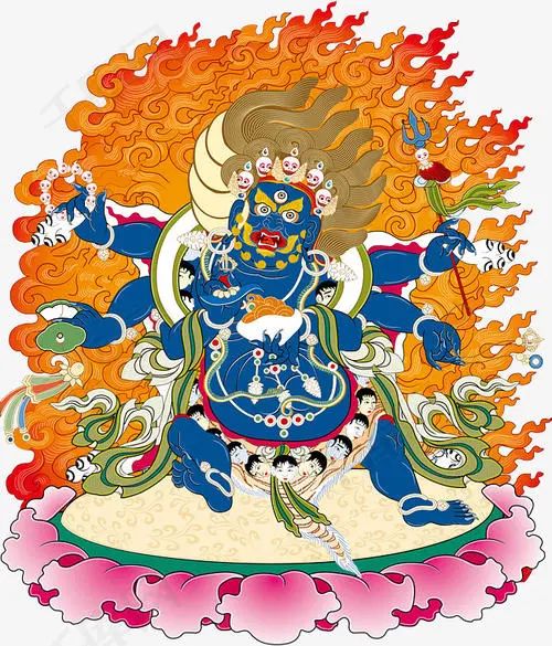 忿怒金刚的头发,都是立起来的,象征所有轮回的不清净现象都与涅槃或者佛的坛城不可分离,在法界当中都是清净的;一般的佛菩萨背后,有一圈光芒,但忿怒金刚的背后却不是光芒,而是火焰,象征证悟空性的智慧——以证悟空性的智慧摧毁三界轮回,烧掉六道众生的烦恼和痛苦。