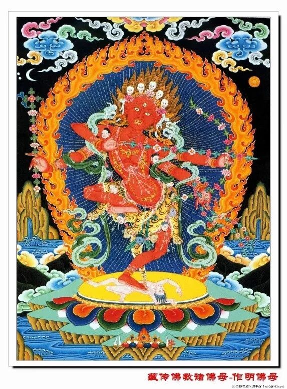为佛教密宗的本尊。四手三眼,身红色,金发怒冲,手持莲花钩斧,搭箭拉弓,作射箭姿,腰系虎皮裙,颈挂人头,头戴骷髅冠,身佩珠宝璎珞。足下踩一魔,若身居火中,具大权威势。——《诸佛图解》