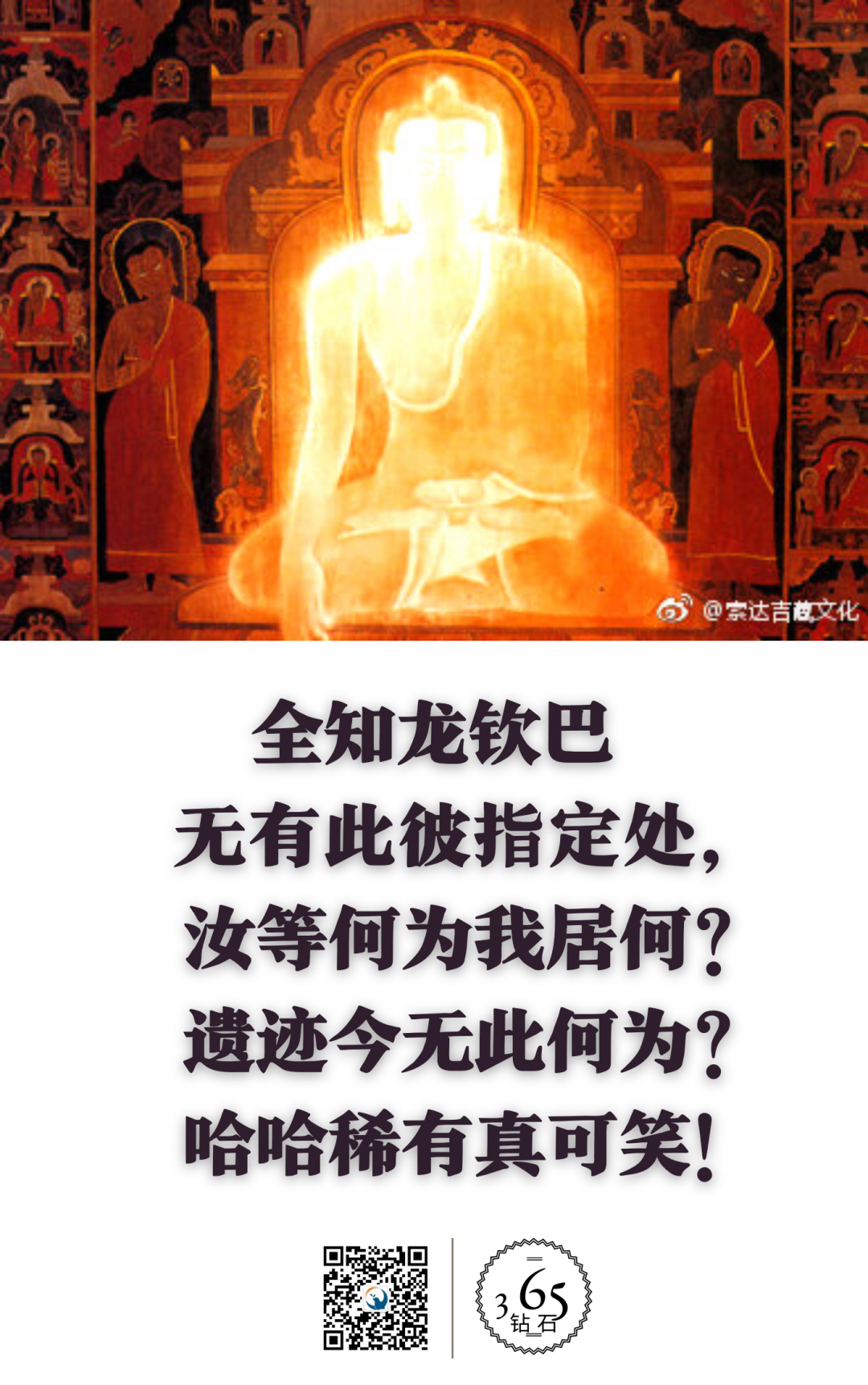 ཀུན་མཁྱེན་ཀློང་ཆེན་པས། གང་ཡིན་ཅི་ཡིན་འདི་ཡིན་གཏད་སོ་མེད།། ཁྱེད་ཅག་ཅི་བྱ་ང་ནི་གང་ན་འདུག ། སྔར་ཤུལ་ད་མེད་འདི་ལ་སུས་ཅི་བྱ།། ཧ་ཧ་འདི་འདྲ་མཚར་ཆེ་དགོད་རེ་བྲོ།། ཞེས་གསུངས།