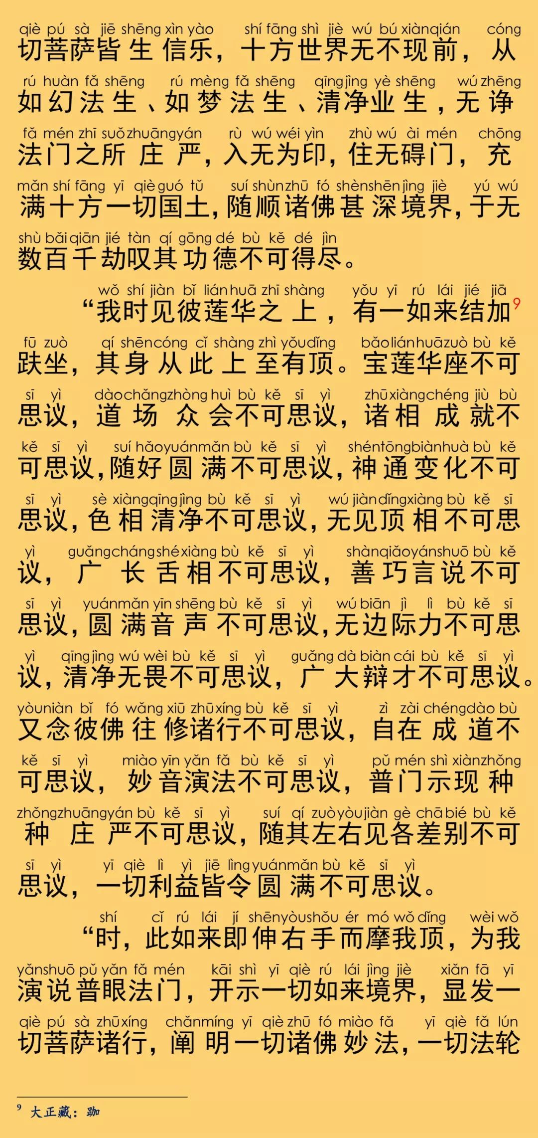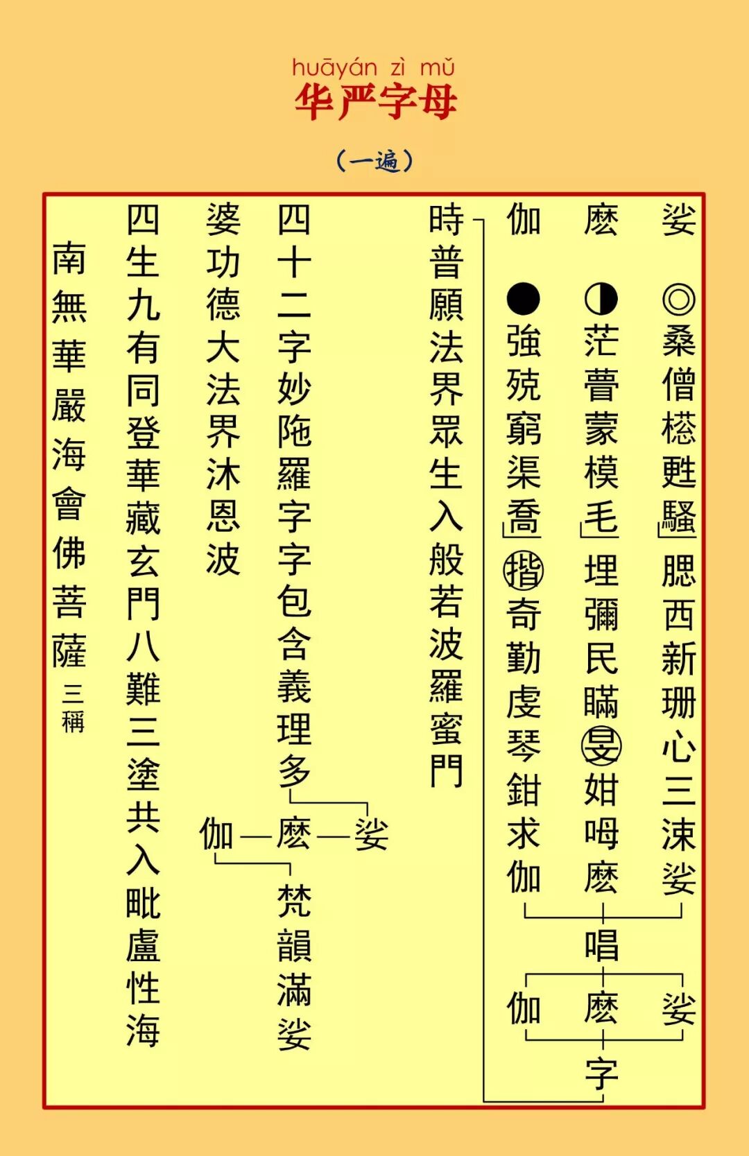根据《乾隆大藏经》大乘华严部,第0084部,唐于阗国三藏沙门实叉难陀译《大方广佛华严经》(80卷)原藏影印本校正注音。读诵仪轨取自福建莆田广化寺《大方广佛华严经》印本,华严字母根据柏林禅寺《华严字母》印本校正,句读及注音仅供参考。印能法师录有完整的四十二个华严字母的梵唱音频,请随印能法师学唱华严字母。每卷的梵唱音频与该卷的华严字母相对应,为“字母赞+三个华严字母”。设计排版说明:本注音佛经内容,由仁慧草堂编辑设计制作,如需转载请联系作者公众号,特此说明。