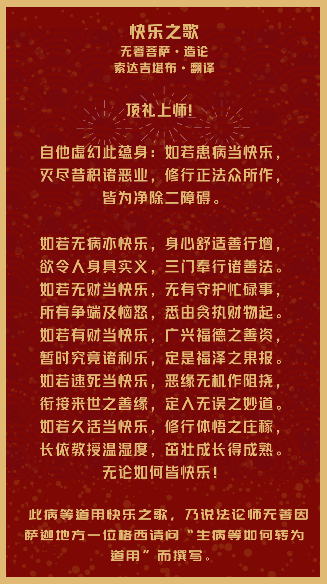 2023.12.30 S师开示:现在很多人有三个方面的痛苦,一个是生病方面的痛苦;一个是没有钱的痛苦;还有一个是害怕死亡。这三大痛苦是很多人面临的。但是在这个教言当中,死也可以值得快乐、病也可以值得快乐、穷也可以值得快乐。所以这个窍诀在世间的知识当中根本得不到的!......这个偈颂很容易背诵,如果听我的话,这几个月当中一定要把它背下来,这个是很容易的......哪怕是八十岁、九十岁的人,我今天讲的必须要背!这是给你们的作业......《快乐之歌》讲记摘录:其实你们背下来的话,对修行真的有帮助。我刚来学院的时候,就使劲地背这个,觉得:“佛教竟然有这么好的窍诀,跟自己读书时的很多心态完全不相同。” 这些传承S师的窍诀,是一切正法的醍醐精要。对我来讲,犹如摩尼宝般珍贵。《快乐之歌》是将一切苦乐转为道用的殊胜窍诀。这个修法中有很甚深的窍诀,明白此理之后,在人生旅途中遇到任何挫折不幸,都有转为道用的勇气和方法。因此,现代人一定要懂得这些道理。