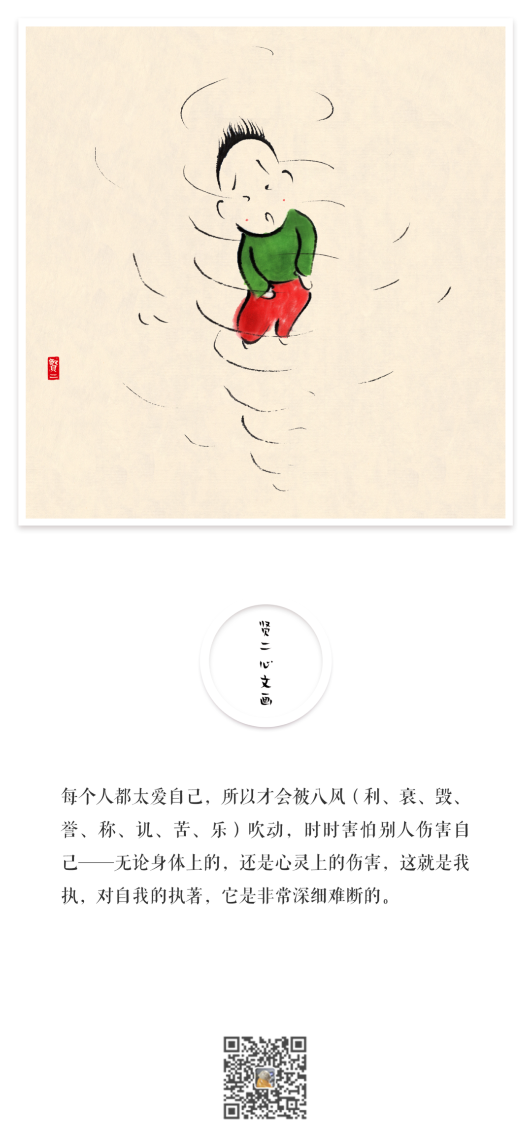 每个人都太爱自己,所以才会被八风(利、衰、毁、誉、称、讥、苦、乐)吹动,时时害怕别人伤害自己——无论身体上的,还是心灵上的伤害,这就是我执,对自我的执著,它是非常深细难断的。