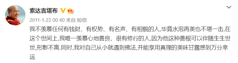 我不羡慕任何有钱财、有权势、有名声、有相貌的人,毕竟水泡再美也不堪一击,在这个世间上,我唯一羡慕心地善良、很有修行的人,因为他这种善根可以伴随生生世世,形影不离.同时,我对自己从小就遇到佛法,并能享用真理的美味甘露感到万分幸运。