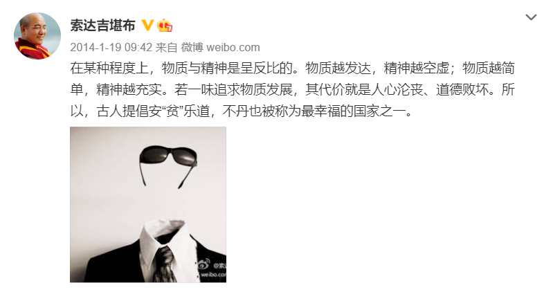 在某种程度上,物质与精神是呈反比的。物质越发达,精神越空虚;物质越简单,精神越充实。若一味追求物质发展,其代价就是人心沦丧、道德败坏。所以,古人提倡安“贫”乐道,不丹也被称为最幸福的国家之一。