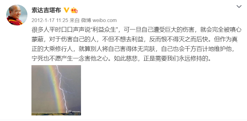 很多人平时口口声声说“利益众生”,可一旦自己遭受巨大的伤害,就会完全被嗔心蒙蔽,对于伤害自己的人,不但不想去利益,反而恨不得灭之而后快。但作为真正的大乘修行人,就算别人将自己害得体无完肤,自己也会千方百计地维护他,宁死也不愿产生一念害他之心。如此慈悲,正是需要我们永远修持的。