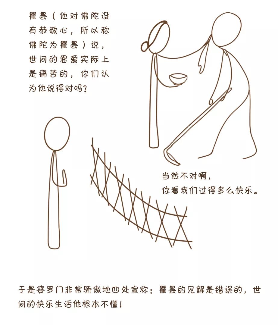婆罗门路过一个村庄,那里有一对恩爱夫妻,正过着美好的生活。婆罗门问道:“瞿昙(他对佛陀没有恭敬心,所以称佛陀为瞿昙)说,世间的恩爱实际上是痛苦的,你们认为他说得对吗?”这对男女说:“当然不对啊,你看我们过得多么快乐。”由于得到了当事人的印证,婆罗门对自己的看法更有信心了。于是他非常骄傲地四处宣称:“瞿昙的见解是错误的,世间的快乐生活他根本不懂!”