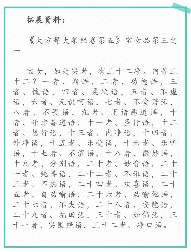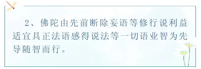 语言上,佛陀因为以前断除了妄语、恶语、绮语、离间语等语言的各种过失,而且长期修行,为了利益众生而应机说法,以这个原因,他所有的这些语言也是不离开智慧的。他说出来的语言是欢喜语、不热语、真实语、不妄语、不贪语,还有不高不下的语言。有些人声音特别高,我对一个发心人员说,“你可不可以把声音放低一点?”他声音越来越高,在会议室又高,然后在外面呢……“你可不可以不要放在高音,中音可以的,低音你可能做不到。”有些太高了,有些又太低了,有一个发心人员每次汇报的时候,我说:“你声音高一点。”也不行。可能我也有这样的。我们有些语言太高了也不行,就像一个小小的房间里面有个高音喇叭一样;如果太低了,怎么样听也听不清楚。但佛陀的语言不是这样的,真的是很温和、很平和,而且高低音特别适度。还有就是不急语,佛陀不会急躁。我讲课的时候特别想讲,有些人说话特别着急,别人反而听不清楚了,佛陀的语言不急不缓,速度特别好,而且可以给每个众生种下善根等等。佛陀的语言是这样的。