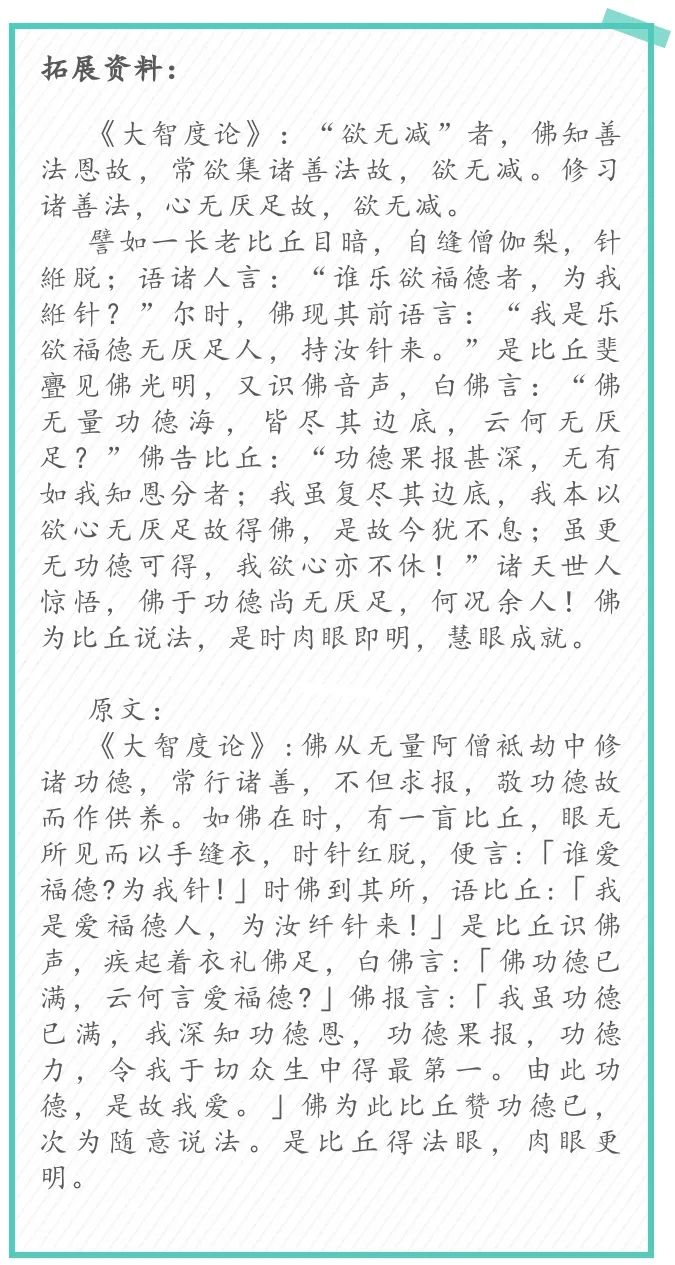 欲乐不退:欲乐是一种追求或者需求。佛陀以前在因地的时候,求得了甚深和广大的法门。因为以前求得了甚深的智慧,今生当中不会断三宝种姓,会继承三宝种姓,弘扬空性方面的思想;因为以前求广大的法门的原因,即生当中利益有情方面的欲望或者希求心非常大,而且永远不会退失,求善的意乐不会退。佛因地时在三个阿僧祇劫中一直不断地行持善法,因为如是串习,即使得佛果以后,善的意乐不会退的。世间人在一段时间中特别有信心,做任何善事没有任何问题,但是遇到一些事情的时候,就可能没有那么大的希求心,尤其遇到一些大的事情,意乐很容易退;但是佛陀完全不同。《大智度论》当中也讲过,有一个比丘当时眼睛不好,不能出去。有一次,他准备自己缝衣服,因为要将线穿过针眼,但是看不见,没办法。这个时候,他高声地喊:“谁求福德,能帮我穿线?”这个时候佛陀来了,他说:“我来做这个事情培福报。”比丘听到是佛陀的声音时,又害怕又不好意思,说:“佛陀是无量无边功德的来源,您早已成佛,各种资粮已经积累圆满,您现在还要来增福德,这是什么原因呢?”他有点不理解。当时,佛陀一边帮他穿线一边说:“虽更无功德可得,我欲心亦不休。” 佛陀说,虽然我在究竟意义上没有什么功德可得,功德已经全部圆满,但我还是愿意做善事,这种欲心不休息、不退。所以,我们知道,佛陀已经到了最究竟的果位的时候,还要行持善法,那我们有些人可能觉得“我现在已经当法师了、我现在出家了、我现在学了五部大论了、我现在修完加行了,那我现在应该可以休息了,不用再希求善法”,其实是不合理的。《大智度论》里还有一个比喻,在骏马当中有一种叫马宝,到了目的地的时候,它的去心、继续前往别的地方的心还不退转。同样的道理,佛陀已经到达究竟的果位,他求善的意乐仍然不会间断。每一个人在因地时多做善事、多求善法,一旦得到佛菩萨的果位时,我们的意乐还有,当然这种意乐在那个时候不一定非常需要,只是告诉我们,实际上,佛陀已经获得这样果位的时候,他的欲心还是不会退的。