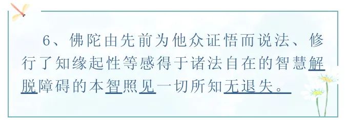 解脱知见不退:佛陀以前为令其他众生得到证悟宣说了许多佛法,自己也修行了一些缘起空性的法门等等,因为这个原因,佛陀今生得到什么呢?有解脱一切障碍、照见一切诸法的智慧,这种智不会退失,主要是从知见方面、从智慧方面讲的。