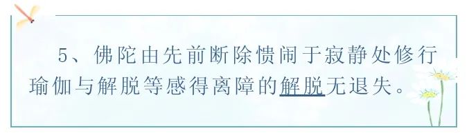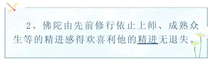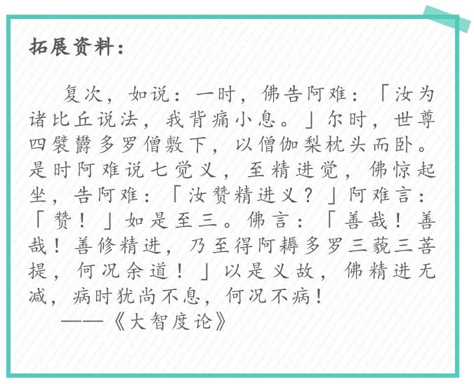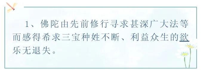 精进不退:佛陀因为以前依止过很多善知识、供养过诸佛、听过法,在因地的时候成熟过许许多多的众生。因为这个原因,佛陀获得了佛果以后,还特别喜欢利益众生,显现上还要不断地、非常精进地行持善法。在我们看来,已经得佛果以后还需要精进吗?佛陀在显现上也有。《大智度论》当中有一个公案,佛陀有一次显现上有点背痛,他告诉阿难尊者:“今天你替我传讲佛法,我有点背痛需要休息。”佛陀把袈裟叠成四块,卧着休息。就像我们世间人一样,“我今天有点不舒服,要休息一下,你帮我传传法”,阿难也答应了,他开始给有缘的弟子传七觉支。到了精进觉支的时候,佛陀马上把头抬起来了,问阿难:“你是不是正在讲‘精进’?”连续问了三次。阿难说:“是,我在讲精进。”佛陀说:“这样的精进一定会得到阿耨多罗三藐三菩提,更何况其他的道。”