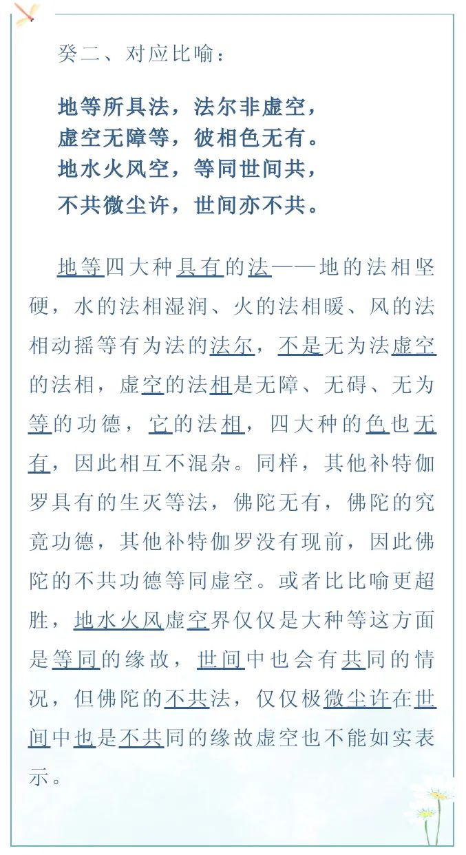 此处,十八不共法用虚空来比喻。为什么用虚空来比喻十八不共法呢?其实,我以前讲什么法的时候用过这个教证,不知道大家记不记得。地等所具法,法尔非虚空,虚空无障等,彼相色无有:首先这里以比喻来讲,就像世间当中的四大——地水火风,四大的法相是什么呢?地的法相是坚硬的、坚韧的,水的法相是湿润性的,火的法相是温暖的,风的法相是动摇的、轻飘的,这是四大的法相。它们都是有为法,四大的本性与虚空的法相不同,为什么呢?因为虚空的法相是无有阻碍的、无有障碍的,是一种无为法,所以虚空无障等,是它的法相。虚空的法相是无为法,四大与虚空两者之间的关系是什么呢?这是很有意思的。佛在世间当中一定要用虚空来比喻才比较清楚。虚空与四大是什么样的关系?大家都知道,四大是有为法,虚空是无为法,它们之间的关系不同,互相不混杂,虚空肯定不是四大,四大肯定不是虚空。我们其他的世间凡夫人是生灭性的,就像刚才四大一样。佛陀显现上有生灭,但实际上没有。佛陀的这些究竟功德、恒常不灭的功德,凡夫人没有。为什么世间的人用四大来比喻,佛陀用虚空来比喻?首先不同点是这样的,先可以这样了知。我们有时候觉得佛陀在这个世间当中跟我们一模一样,不能这样说。比如,他认为地大跟虚空一模一样,不行的,因为地大毕竟是有为法,而虚空是无为法;虽然你们在大种当中是一样的,但是你们的性质完全不同,因此不能说一个凡夫人跟佛陀一样,“我也是在世界上的人,他也是世界上的人”,虽然相同的地方,都是世界上的人,但不相同的地方,他已经超离了生死,我们凡夫人没有超离生死,相当于将地大与虚空相比较一样。我自己感觉,我们作为一个世间人,用自己的法相来衡量佛陀是不对的,就像地大、水大用它自己有为法的法相来衡量无为法的法相,那懂道理的人会笑他的。有些不懂佛教的人,尤其是对佛一无所知的人,“你们佛陀不也是义成王子吗?他在印度,我去过印度,他以前在那里居住的时候怎么怎么样”。佛陀和我们有些相同的地方,但有些地方超越了我们。地水火风空,等同世间共,不共微尘许,世间亦不共:我们知道,地水火风是属于四大当中,虚空是无障碍的,也可以说五大。从大众的角度来讲,有共同的地方,就像释迦牟尼佛也来到南赡部洲,我们也来到南赡部洲;他当时是一个王子,我们也是世间当中的一个人类。有相同的地方,但是不同的地方,佛陀有这些不共的功德,前面讲的十八不共法,在世间当中连一个微尘许共同的也没有。虚空只是某一个地方相同而已,但实际上根本不相同,真正来讲连一个微尘许相同的地方也没有,虚空也没办法比喻,佛陀完全超越一切世间的。佛和我们之间的关系,也有相同的地方,但是也有完全不同的地方;而且不仅是不同,甚至我们没办法将佛陀的每一个功德一一去描述,佛陀这些无与伦比的功德,一个凡夫人在恒河沙数劫当中用幻化出千百万的舌头来进行演说都是说不尽、说不完的。这里的很多人应该是有智慧的人,但是我们大多数的智慧好像用在吃喝玩乐上面,自己观察自己的每一天,智慧真正用在研究上面有多少时间?在自相续当中生起信心和智慧方面用了多少?我们自己来衡量自己的时间,有时候可能大多数的智慧用在一些没有意义的、或者造恶业的,或者是一些无记的状态当中。声闻阿罗汉也有无记的状态,我们也理解,更何况凡夫人,但佛陀没有无记的、没有不善的忆念和状态。我们处在这个世间当中,大家也要经常观察,观察佛陀与自己之间有没有什么样的差别?从方方面面可以比较。这次讲了《宝性论》以后,很多人应该能比较有深度地、进一步地了解佛陀的本来面目,这样的话,我们的信心也会不断地增加、稳固,不会飘来飘去,对自己的本师佛陀的信念、信心,比以前更加坚实,更加稳固。否则,今天是佛教徒,看到佛陀、看到佛像、看到上师们,特别激动、生欢喜心、泪流满面……但是将来遇到一点点事情的时候,因为相续当中没有深刻的定解,很容易被世间各种各样的事磨掉、会被吹走,所以我们要不断地学习。作为佛教徒,要以学习为主,要成为一个理性的佛教徒,成为一个真正懂得佛教的佛教徒,将来弘扬佛法、自己修行都不会有障碍。总体上讲,佛教徒应该有进步,这一点我们也看得出来,比如前后的念诵,大多数的居士也会念。我刚才也看了,除了极个别人,大家前后的念诵都拿转经轮,很多方面跟学院常住的有些道友一样,对善事方面还是有串习,花了功夫、下了决心。否则任何一件事情,没有下功夫、没有精进,不可能得到一个比较满意的结果。所以我们还是要不断地、长期地精进,佛陀都那么精进,我们为什么不需要精进?我们要不断地精进。今天把十八不共法讲完了,再下一堂课开始讲异熟果的功德。