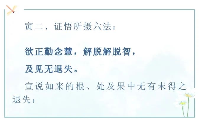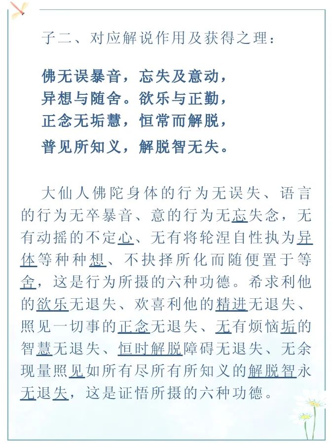 佛无误暴音,忘失及意动,异想与随舍:前面讲佛的身体没有失误,语言没有暴音,心没有忘失,没有动摇的、不确定的心,轮回涅槃分开的种种想也没有,不抉择所化、随意放弃的心也没有。意思就是说,只要是因缘成熟的众生,佛陀一定会去度化他们。我们世间人本来是该度化他,但是因为“我忙了,因为我当时没有猜准”,有各种原因,我们有放弃他的这种情况,但是佛陀不抉择而放弃的情况没有,就像《毗奈耶经》中说:“假使大海潮。或失于期限。佛于所化者。济度不过时。”怎么说?好长时间没有念藏文,好多都是慢慢、慢慢都退失了。佛陀是没有忘失,我们是以前能背的很多教证现在都不行了……以前也讲过,就像大海不离开海潮一样,佛陀从来不会不度化众生,只要因缘成熟,他会度化的。随舍,跟前面的用法有点不同,但是不同经典里面也有这样的讲法。欲乐与正勤,正念无垢慧,恒常而解脱,普见所知义,解脱智无失。刚才讲了,利他的欲乐不会退失,喜欢善法的精进也不会退失,照见一切万法的正念也不会退失,没有任何烦恼的智慧也不会退失,恒时解脱一切障碍的解脱智也不会退失,能照见所有尽所有、如所有的法的解脱智慧见也不会退失,这就是所谓的六种证悟所摄的六种法。