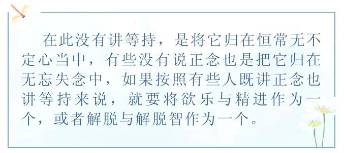 六根当中有一个专门叫念——等持,这里没有讲,也可以包括在正念不忘失中。在这里,如果也讲正念、也讲等持,那前面的欲乐和精进两个作为一个,或者解脱和解脱智见作为一个,也完全可以说是佛的不共证悟所摄的六种法,也可以这样解释。这是不同的解释方法。