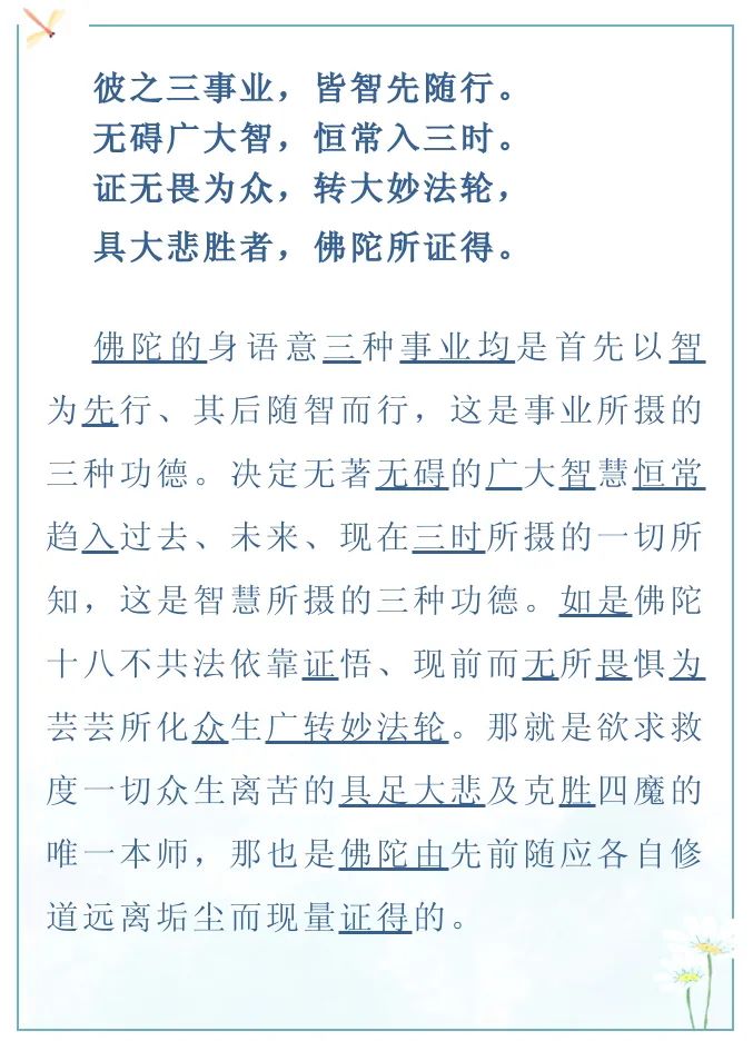 彼之三事业,皆智先随行:刚才前面讲到佛陀身体、语言、意三事业,也就是智慧为先行、后随智而行,这是三种皆智先随行,这是三种智慧所摄的功德。无碍广大智,恒常入三时:佛陀无著无碍的广大智慧能了知过去、未来、现在三时的一切所知,这是智慧所摄的三种功德。证无畏为众,转大妙法LUN:因为佛陀已经有十八不共法的证悟,那么他无有畏惧地对芸芸众生转大的法LUN。我们对转大法LUN有时候有畏惧,有时候没有安全感等等;佛陀因为有这样十八不共法的证悟无有畏惧。如果我们也有这样的功德肯定不怕,转大法LUN、转小法LUN都没问题。具大悲胜者,佛陀所证得:佛陀具有救度一切众生的大慈大悲心,他是胜者,胜过所有天魔、蕴魔等四魔为主的一切魔众,这就是世界上唯一的、远离一切垢染的佛陀,这就是一切众生的真正的导师。《大庄严论经》中云:“世界佛独悲,心意无秽恶,为一切众生,作于最亲友。”在这个世界上佛陀是无与伦比的,他是所有的众生最至亲的、真正的怙主。所以,有一些其他的你的朋友、你的亲人,你对他好的时候,他对你很好;如果你对他不好,他不一定完全对你好。但佛陀完全不同,佛陀的亲怀、包容的心、怨憎平等的心,世间凡夫人确实没办法相比。