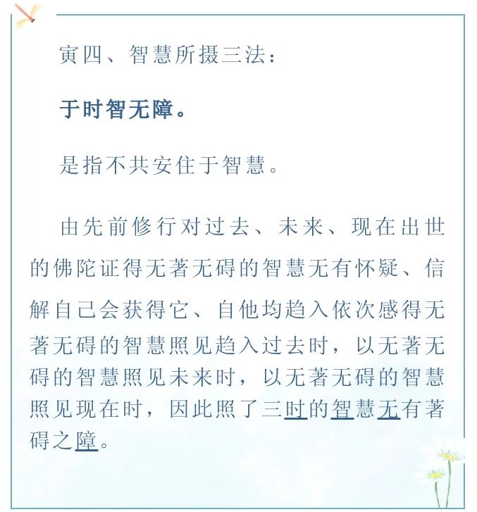 佛陀以前对过去、未来、现在佛的无著无碍的智慧深信不疑,相信自己也会得到这样的功德,而且自他众生因为趋入三世佛的境界,他们无著无碍的智慧也是能照见一切。佛陀对过去的一切,不管当时的刹土、当时的众生,当时粗和细的、清净和不清净的所有状况,就像庵摩罗果放在手上一样,无著无碍地照见,这是佛陀的智慧;无著无碍的智慧能照见现在各个世界的如来的刹土、众生以及他们的福报、罪业等等,全部也是如庵摩罗果放在手上一样能照见;无著无碍的智慧对于未来的人和世界、佛刹、众生,包括这里面所有众生的状况,也是如庵摩罗果放在手上一样,一五一十全部能照见,所以佛陀能了知三世如实不共的智慧,于时智无障。