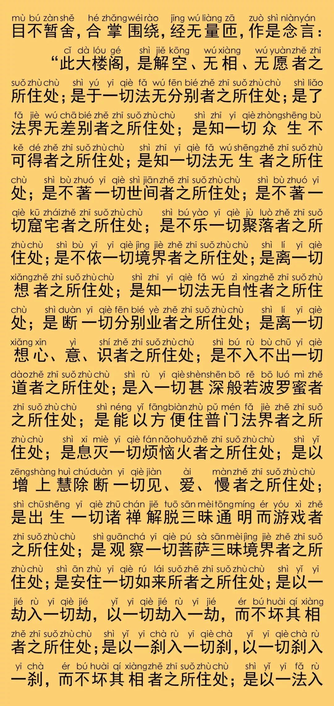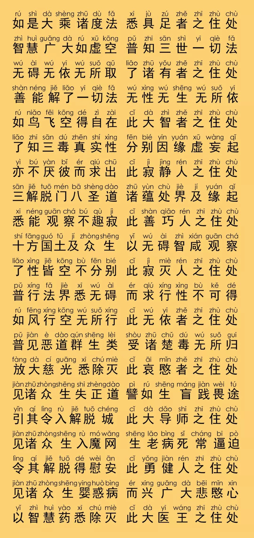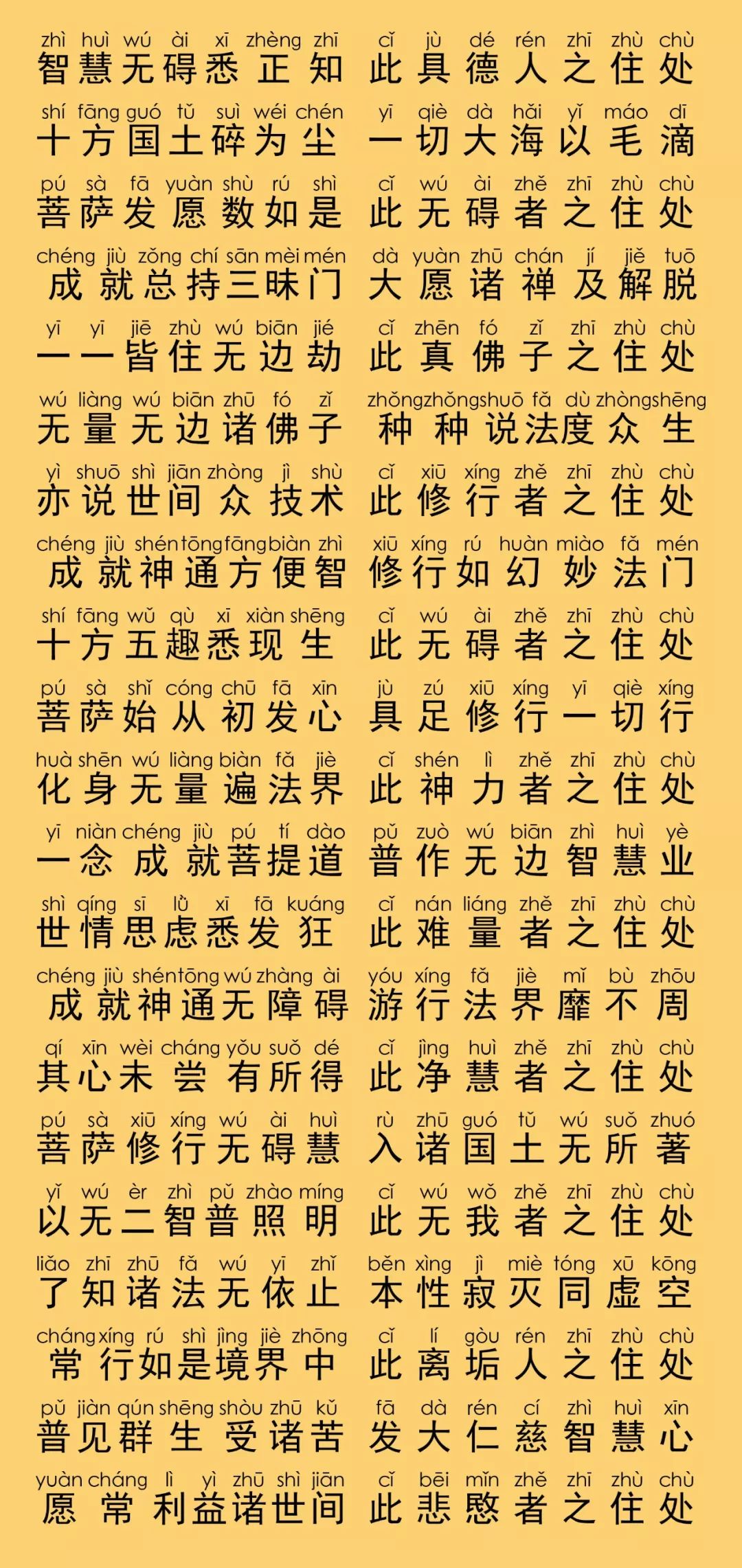 根据《乾隆大藏经》大乘华严部,第0084部,唐于阗国三藏沙门实叉难陀译《大方广佛华严经》(80卷)原藏影印本校正注音。读诵仪轨取自福建莆田广化寺《大方广佛华严经》印本,华严字母根据柏林禅寺《华严字母》印本校正,句读及注音仅供参考。每卷的三个华严字母梵唱音频与该卷的华严字母相对应,由印能法师唱诵,至七十三卷后,每卷为四个华严字母。设计排版说明:本注音佛经内容,由仁慧草堂编辑设计制作,如需转载请联系作者公众号,特此说明。