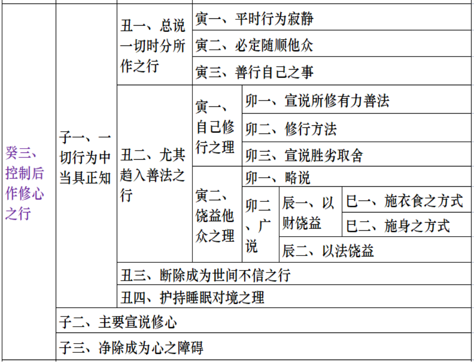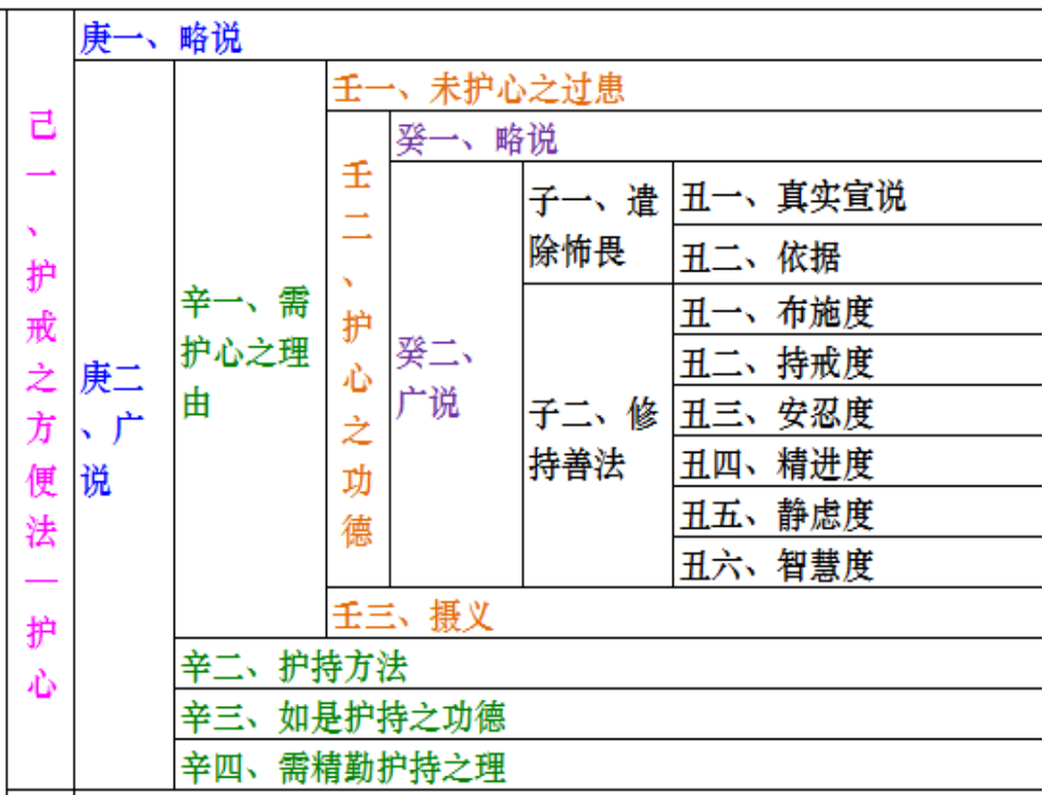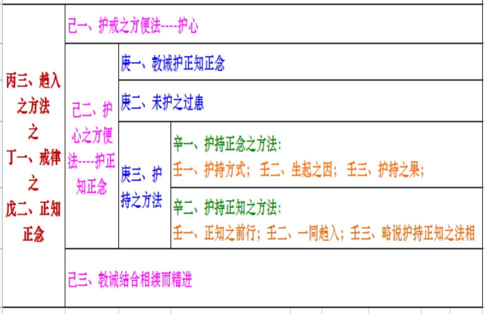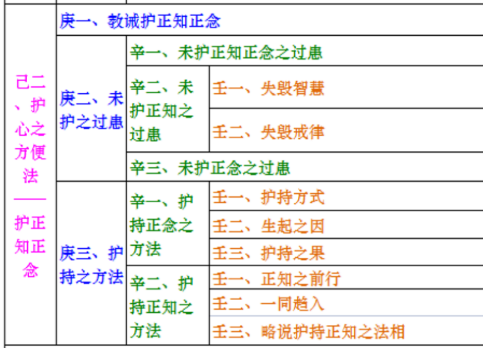 Nicholasldf 注---此篇学习笔记为个人基于讲记+法师辅导的内容总结,包含了这几个方面:科判注释、颂词注释、讲记内容要点。。但愿通过此篇内容,能够从整体上去学习第五品,以便做到前后联系,融会贯通。。由于智慧有限,内容仅供参考,难免错漏之处,三宝师前忏悔!戒律:趋入方法中的戒律度用“不放逸和正知正念”两品来宣说。不放逸:对三门小心翼翼、谨慎取舍。正知:知道自己在干什么,以智慧观察三门。正念:知道自己该干什么,念念不忘善法。比喻:高僧大德们常将自心比喻成马,正念喻为拴马之索,正知喻为马的主人,经常看护马。必要:发了菩提心后,为了令其不退失,接着要修持不放逸、正知正念、安忍。本品内容:主要是如何守持菩萨戒。心意是一切行为的先导,护好自心者方能守住菩萨学处,而护心必须要有正知正念。自心保持清净,不为烦恼所染,则心行言语自然不会触犯禁戒,行持善法。戊二(正知正念)分三:一、护戒之方便法---护心;二、护心之方便法---护正知正念;三、教诫结合相续而精进。科判分析---本品从三方面进行阐述,即三大要诀:护持戒律的方便方法是护心;护持内心的方便方法就是护持正知正念;教诫结合自心相续而精进的实践护持正知正念。正知正念与戒律度:戒律是修行人的行为规范,持戒是否清净圆满,并不观待于外在的形象,唯一安立于自心,而护心又需要具足正知正念。正知正念的定义:正念就是念念不忘善法,正知就是经常用智慧来观察三门行持善法。无著菩萨说:“正念是指忆念自己承诺的所断与所修,正知是指精通该断该修的一切事宜。”(比喻:)以前高僧大德们常将自心比喻成马,正念喻为拴马之索,正知喻为马的主人,经常看护马)。(注:“知”有观察之意,“念”有惦记、念念不忘之意,“正”字,它代表佛法。)所谓的正念,就是于过去之事不忘而心不散乱。它的对境是过去之事,形相是不忘,作用是心不外散,正念应该具足这样的条件。所谓的正知,《般若经》中是这样定义的,在行住坐卧等一切威仪中,时时刻刻观察自己的三门,知道自己在坐着、在说话、在做事、在睡觉……,知道自己到底在干什么。“了知”和“正知”的区别:反复观察三门就一定是正知吗?比如小偷偷东西的时候,他也可以观察:三门的状态?但是这不能称为正知,可以说只是“了知”,如果我们只是了知自己的状态,虽然知道自己在做什么,却根本不具足佛法的见解和对治能力,则依旧无法对治烦恼。“正知”不仅是具足了知自心状态的能力,还有一个前提---观察自己的身、语、意是否符合佛法的见解(正念)。正知和正念都是缘善法的心所,讲正知时,是专指善心的状态,是指经常观察三门看自己是否处于善法的状态。无正知绝对不是无记,无正知就是指烦恼状态。正知正见和正知正念的差别:正知正见是指正确的定解,属于见解方面,而正知正念则是护持戒律的一种方法。己一(护戒之方便法---护心)分二:一、略说;二、广说。科判分析---护持戒律的方便方法就是护心。一切万法唯心所造,如果把心守护好,就能守护一切戒律。所以,守护戒律一定要懂得善巧方便,懂得了善巧方便、抓住了核心,护戒就比较容易,如果不懂的善巧方便,即使花很多的精力,但收效也甚微。(戒律的目的就是行为规范,断恶行善,离苦得乐。而万法唯心,一切善恶都是由心所生,所以要护好戒,就必须要护好心。)科判分析---总说护戒的方便就是护心,想要护持菩萨学处,应该谨慎地防护自心,如果不严谨守护此心,就不能护持好菩萨学处。颂词:欲护学处者,策励当护心,若不护此心,不能护学处。颂义:一个想要护持菩萨学处的人,应该谨慎地防护自心,如果不严谨守护此心,就不能护持好菩萨学处。众生无始以来随分别念漂泊于轮回中,心散乱于色声香味等五欲,导致了如今这样的轮回痛苦。一个想要获得解脱的人,在学习大乘行为的过程中,必须要守持应守的学处,而想要护持这些菩萨戒,作者在这里一再要求大家:应集中精力、一心一意地护持自己的心。不论是大乘小乘,都会有一些学处需要护持(如别解脱戒、菩萨戒、密乘戒)。假如不违越这些学处而如理如实护持,必定会获得暂时或究竟的解脱。相反,倘若没有调伏自心,随随便便地轻贱学处,则会招致不好的结果。佛在《华严经》中说:“于自心建立一切菩萨行故……,应守护心城。” 所以凡是要行持菩萨六度万行的修行人,务必要护持自己心的城门。大慈大悲的佛陀在《妙臂请问经》中说,我们的心非常不听话,犹如闪电、云雾、暴风、海浪一样瞬息万变,随外境而转,因此一定要善于调伏。如果不能调伏的话,就不能护持好菩萨学处。庚二(广说)分四:一、需护心之理由;二、护持方法;三、如是护持之功德;四、需精勤护持之理。科判分析---广说护持戒律的方便方法就是护心。分四个方面:需要护心的理由;护持自心的方法;护心的功德(纵处恶境,戒律也不会失坏);为何需要精勤护持自心,理由是什么。辛一(需护心之理由)分三:一、未护心之过患;二、护心之功德;三、摄义。科判分析---需要护心的理由。分三个方面:没有护心会有严重的过患,最严重的就是堕入无间地狱受苦受难;护持内心具有遣除怖畏和修持善法获得福善的功德;摄义,归纳总结需要护心的理由,从而可知心为护戒的关要,一定要善护这颗道心。科判分析---了知没有护心会产生怎样