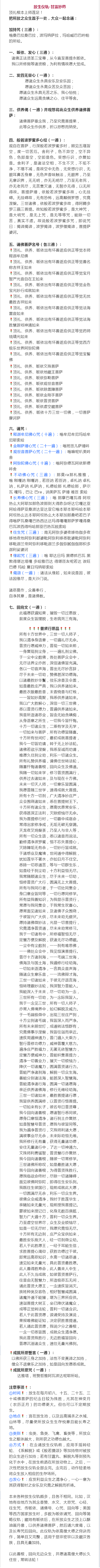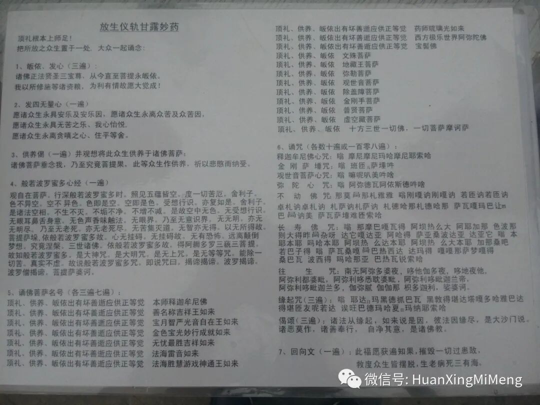 嗡桑巴ra桑巴ra,波玛纳萨ra,玛哈臧巴巴吽帕的所哈。观自在菩萨,行深般若波罗蜜多时,照见五蕴皆空,度一切苦厄。舍利子,色不异空,空不异色,色即是空,空即是色。受想行识,亦复如是。舍利子,是诸法空相,不生不灭,不垢不净,不增不减,是故空中无色,无受想行识,无眼耳鼻舌身意,无色声香味触法,无眼界,乃至无意识界,无无明,亦无无明尽,乃至无老死,亦无老死尽,无苦集灭道,无智亦无得,以无所得故。菩提萨埵,依般若波罗蜜多故,心无挂碍。无挂碍故,无有恐怖,远离颠倒梦想,究竟涅槃。三世诸佛,依般若波罗蜜多故,得阿耨多罗三藐三菩提。故知般若波罗蜜多,是大神咒,是大明咒,是无上咒,是无等等咒,能除一切苦,真实不虚。故说般若波罗蜜多咒,即说咒曰:揭谛揭谛,波罗揭谛,波罗僧揭谛,菩提萨婆诃。那莫ra那札雅雅 嗡刚嘎讷刚嘎讷 若匝讷若匝讷卓札讷卓札讷 札萨讷札萨讷 札德哈那札德哈那 萨瓦嘎玛巴让ra巴ra讷美萨瓦萨埵难匝索哈嗡 那摩巴嘎瓦得 阿坝热么大 阿耶加那色波那 则大得昨ra杂呀达它嘎达亚 阿哈得萨亚桑波达亚 达亚它 嗡 本耶本耶 吗哈本耶阿坝热 么达本耶 阿坝热 么大本耶 加那桑吧若巴子得 嗡 萨瓦桑嘎ra巴热西达 达玛得嘎嘎那萨梦嘎得 桑巴瓦 波西得 吗哈那亚 巴热瓦锐索哈南无阿弥多婆夜 哆他伽多夜 哆地夜他阿弥利都婆毗 阿弥利哆悉耽婆毗 阿弥利哆毗迦兰帝 阿弥利哆毗迦兰多伽弥腻 伽伽那 枳多迦利娑婆诃嗡耶达日玛黑德抓巴瓦 黑敦得堪达塔嘎多哈雅巴达 得堪匝友呢若达 诶旺巴德玛哈夏日玛纳耶索哈①时间:放生在每月初八、十五、二十五、三十或佛菩萨的纪念日较为殊胜,尤其在神变月(农历正月)的功德更大。但也可以不定期放生。②地点:宜在放生池,以及远离捕杀之水域、山林等,尽量使所放众生生存悦意且能长寿之地。③类别:虫类、鱼类、飞禽、畜类等,所放众生之躯体越大,则所获之功德也越大。④方式:在念诵放生仪轨前,应用手摇转经轮、《系解脱》或《般若摄颂》等加持物对被放的众生进行加持;若有甘露丸、解脱丸等则预先化于水中,在放生前洒在所放动物上。之后,一次性把放生仪轨全部念完。念完后,动作轻柔地将众生放入相应的生存场所。⑤发心:应发利益众生之清净心,一心一意为其获得暂时之安乐及究竟之解脱而祈祷。本来各种放生仪轨颇多,且各不相同。比如,汉地有些地方为其念香赞、水文、大悲咒、心经、往生咒、传皈依、诵佛号、心咒、回向等;美国等西方国家放生时,多数为皈依诵咒、回向等简略仪轨;藏地有皈依后,在所放众生之顶上以酥油画月像,以供养诸佛菩萨,然后诵六度偈,以及长寿咒后回向。此仪轨为依高僧大德之窍诀而作,简单且又完整,适用于显宗密宗以及藏汉各族,且具无量加持。以此善根,回向无边众生,并愿诸高僧大德长久住世,常转法轮!