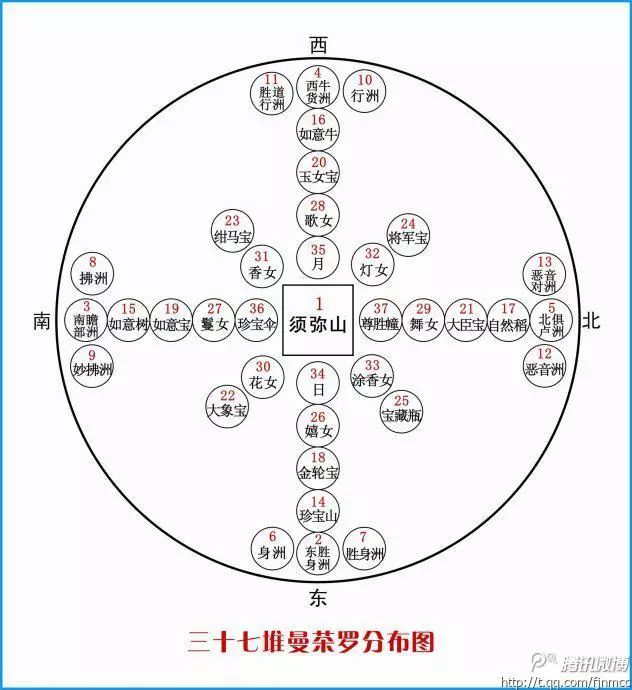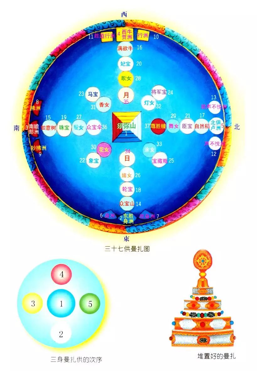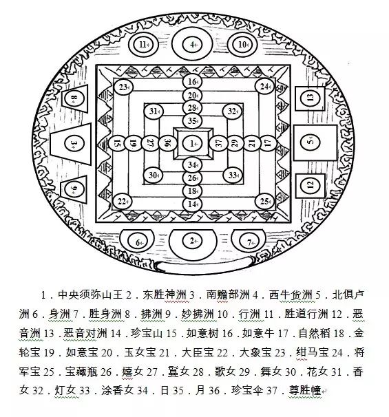 安置东胜身洲[2]、南赡部洲[3]、西牛货洲[4]及北俱卢洲[5]等四大洲,无论将自己一方或供养对境方向作为东方皆可,并从旭日升起的东方依次顺时针右旋而放;在放置每一洲东西方各有的两个附洲时,仍然按东、南、西、北大洲的顺序顺时针放置,但针对各大洲而言,则应该按先西后东的顺序放置表示附洲的供堆。即东胜身洲的西侧身洲[6]、东侧胜身洲[7];南赡部洲的西侧拂洲[8]、东侧别拂洲[9];西牛货洲的西侧行洲[10]、东侧胜道行洲 [11];北俱卢洲的西侧恶音洲[12]、东侧恶音对洲[13]。其后再放置东方珍宝山[14]、南方如意树[15]、西方如意牛[16]、北方自然稻[17];然后将轮王七宝及宝藏瓶供堆依照从东方顺时针右旋的顺序依次置于四方四隅。即东金轮宝[18]、南如意宝[19]、西玉女宝[20]、北大臣宝[21]、东南大象宝[22]、西南绀马宝[23]、西北将军宝[24]、东北宝藏瓶[25];再将嬉女[26]、鬘女[27]、歌女[28]、舞女[29]等外供四天女;花女[30]、香女[31]、灯女[32]、涂香女[33]等内供四天女分别置于四方四隅,其顺序仍然是从东方顺时针右旋(同上);之后的东、西、南、北,依次为日[34]、月[35]、珍宝伞[36]、事业尊胜幢[37]。放置顺序及观想内容,可以参照下面所附的“三十七堆曼茶罗分布图”。下面一边按照顺序观想,一边放置供堆,并一边念诵: