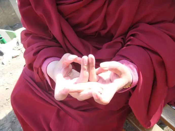 供修的时候,首先用左手执持曼茶罗基盘,右手持念珠,(虽然平时我们要用左手持念珠,但供修曼茶罗的时候,则应放在右手计数。)一边念诵百字明,一边用右手腕擦拭曼茶罗基盘。之所以要擦拭曼茶盘,并不是因为曼茶盘上有什么不干净的东西,而是为了以苦行的方式,净除自相续中二障的垢染,开发我们内心潜在的智慧。密宗认为,人的手腕上有智慧脉,通过供修曼茶罗不断地擦拭,就可以使原有的智慧迸发而出。所以,曼茶罗盘要用手腕来擦,而绝不能用毛巾、纸张来擦。擦的时候先顺时针擦三圈,再反时针擦三圈,如果念诵百字明的时间较长,就可以反反复复地旋转。