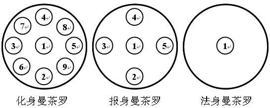 接下来就是三身曼茶罗,三身曼茶罗非常重要,其中的化身曼茶罗要放置九堆供品,报身曼茶罗要放置五堆供品,法身曼茶罗要放置一堆供品,具体顺序见图。