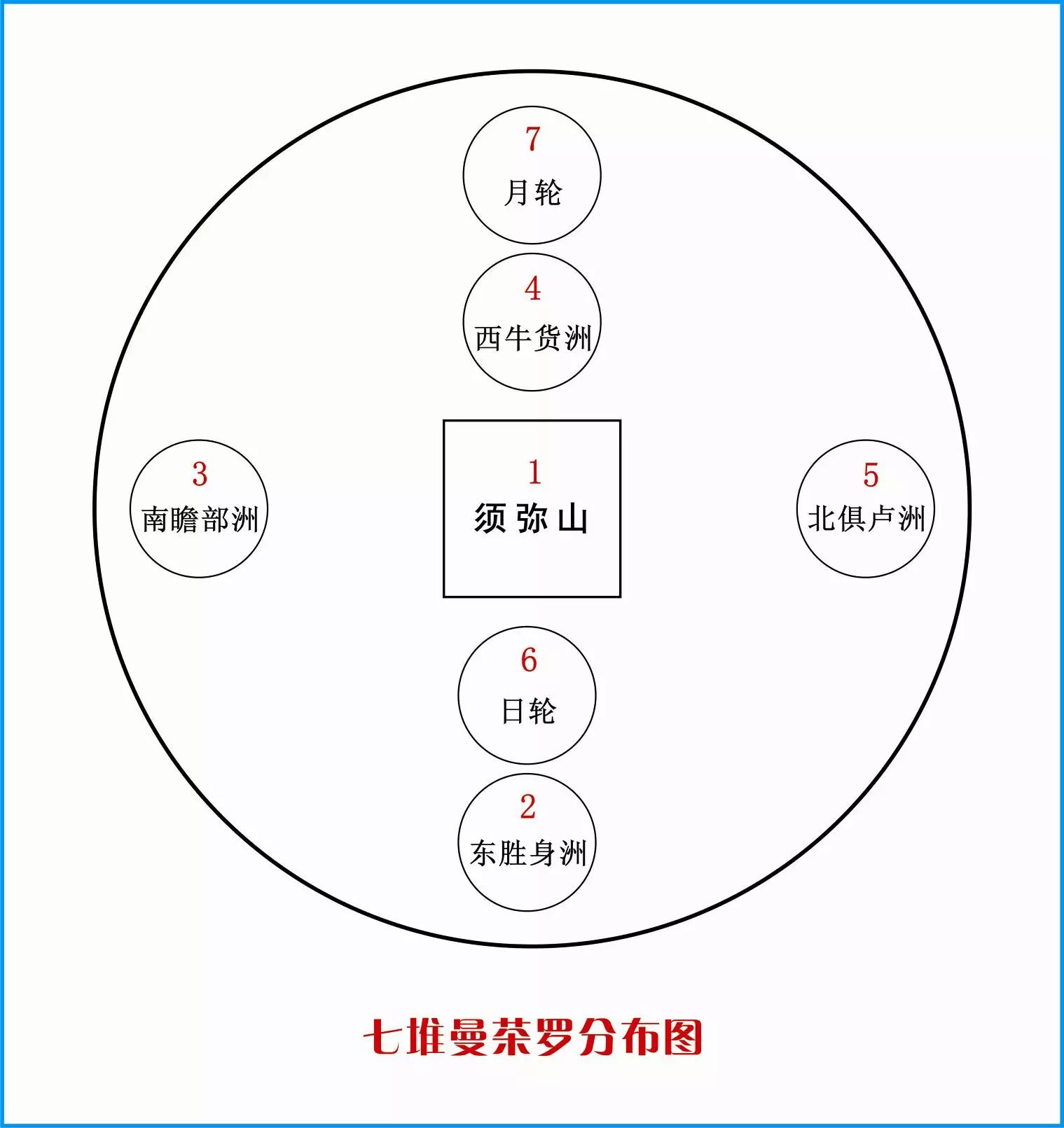 这是七堆曼茶罗的外在曼茶罗,内在的曼茶罗是什么呢?是三千大千世界。中央的一堆是须弥山,其次的四方分别是四大洲,最后的东边是太阳,西边是月亮。观想将日月山河大地等所有三千大千世界中的供品,和自己的一切功德,供养给诸佛菩萨。这就是七堆曼茶罗的修法。