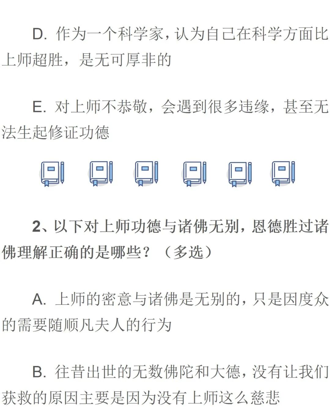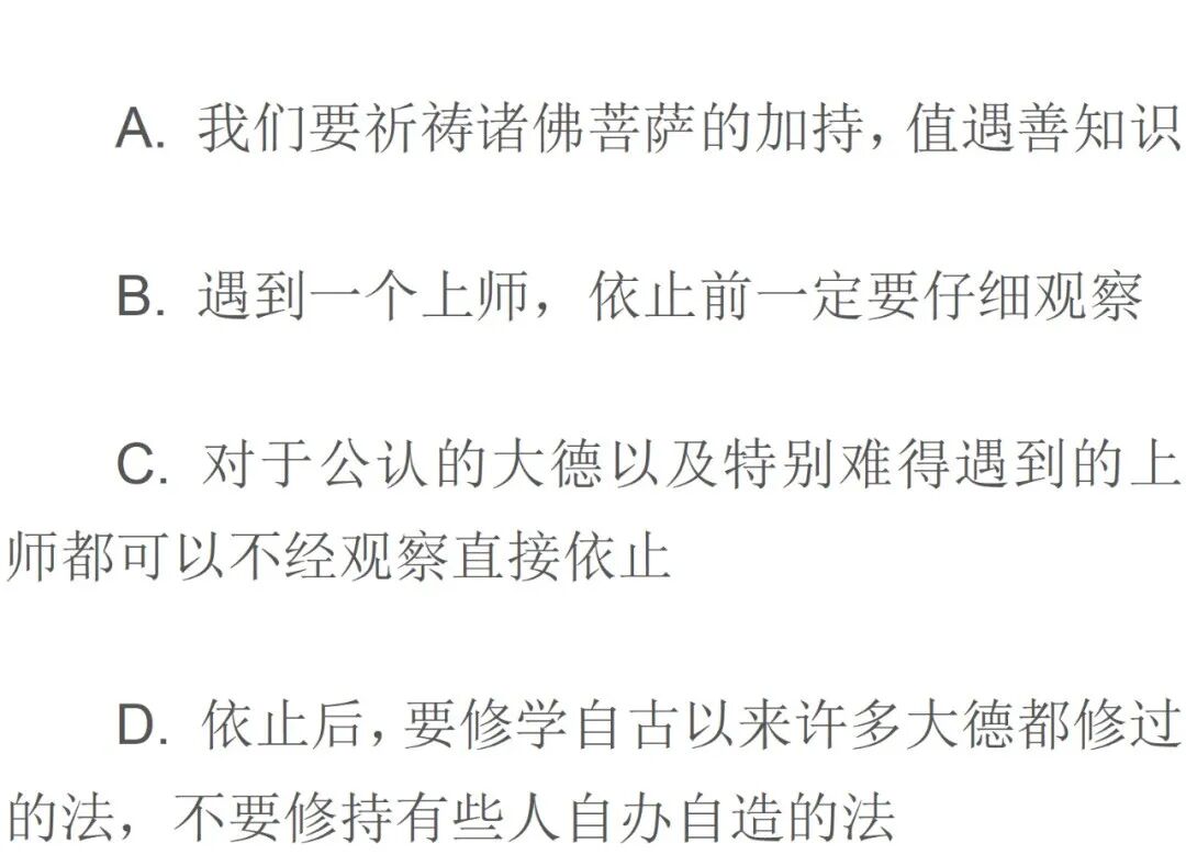 A.于此时代得师摄受,上师恩德不可思议:如今佛法已到了末期,五浊横流,许多人随不善业而转,不明取舍之理,犹如无依无靠的盲人漂泊在荒野中一样。此时,上师以无量悲心垂念我们,相应众生的不同缘分,以不同的身相现于世间,恩德不可思议。