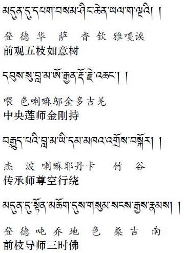 中央一枝安坐着邬金莲花生大士,这里没有要求观想双身像。一般来说,观想皈依境时,如果你对密法没有生起坚定的信心,那么观单身像也可以。形象是莲花生大士,他的所有特征在《大圆满前行引导文》中讲得比较清楚;本体是与三世诸佛无二无别的根本上师,自己的根本上师显现为莲花生大士,这样观想。五枝中央这一枝邬金莲花生大士的观想是最重要的。
