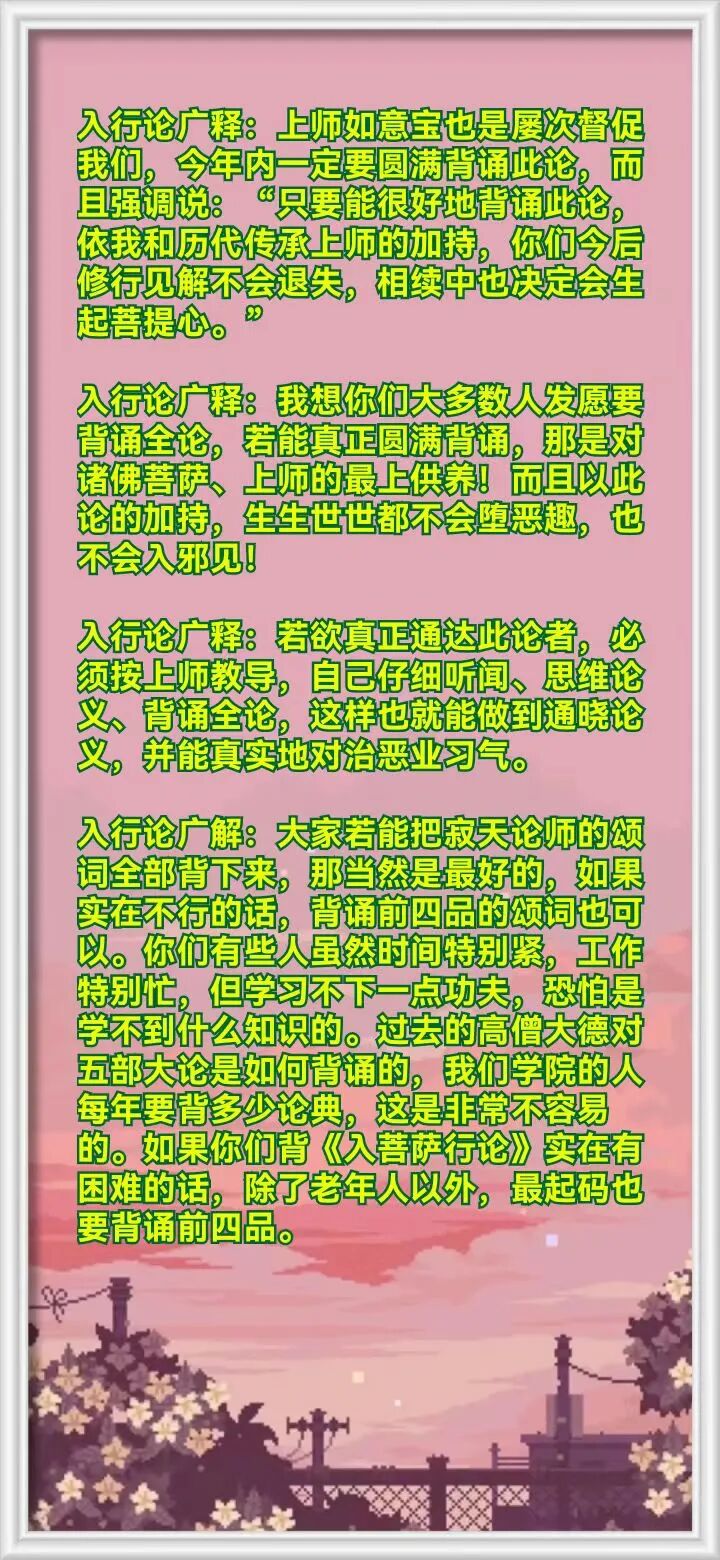 恩师开示:《入行论》不仅仅是讲一个大乘菩提心的修法,做人、生活、精进的方法、修证的验相等方方面面都包含其中,若能圆满通达本论,很多人的学佛境界会得以提升。恩师开示:在座的人很多都学过《入行论》,可能学一遍不一定有特别深的感觉,在学两三遍后,印象就会比较深。这次我遇到了很多学过三、四遍的人,他们越学越觉得里面的内容非常珍贵,而且对治烦恼、遣除障碍的能力,也比以前大有进步。入行论广释:若能真正圆满背诵,那是对诸佛菩萨、上师的最上供养!而且以此论的加持,生生世世都不会堕恶趣,也不会入邪见!上师如意宝也是屡次督促我们,一定要圆满背诵此论,而且强调说:“只要能很好地背诵此论,依我和历代传承上师的加持,你们今后修行见解不会退失,相续中也决定会生起菩提心。”大老师:现在有很多人在背《入菩萨行论》,背完之后感觉也很好。。你们不能太着急,背开始的颂词感觉很好,但背最后几个颂词的时候,你们是不是还感觉很好呢? ?学习佛法需要耐心,刚开头的几个颂词谁都会背,我们这里大多数的人都能背第一品,但有些人在第二品时退下去了,有些在第三品时退下去了,有些在第八品时退下去了。。所以背书并不是很容易,背一两个颂词不难,最难的是全部背完,如果到了最后一个颂词,你还是觉得很好的话,那我确实非常高兴。大恩上师