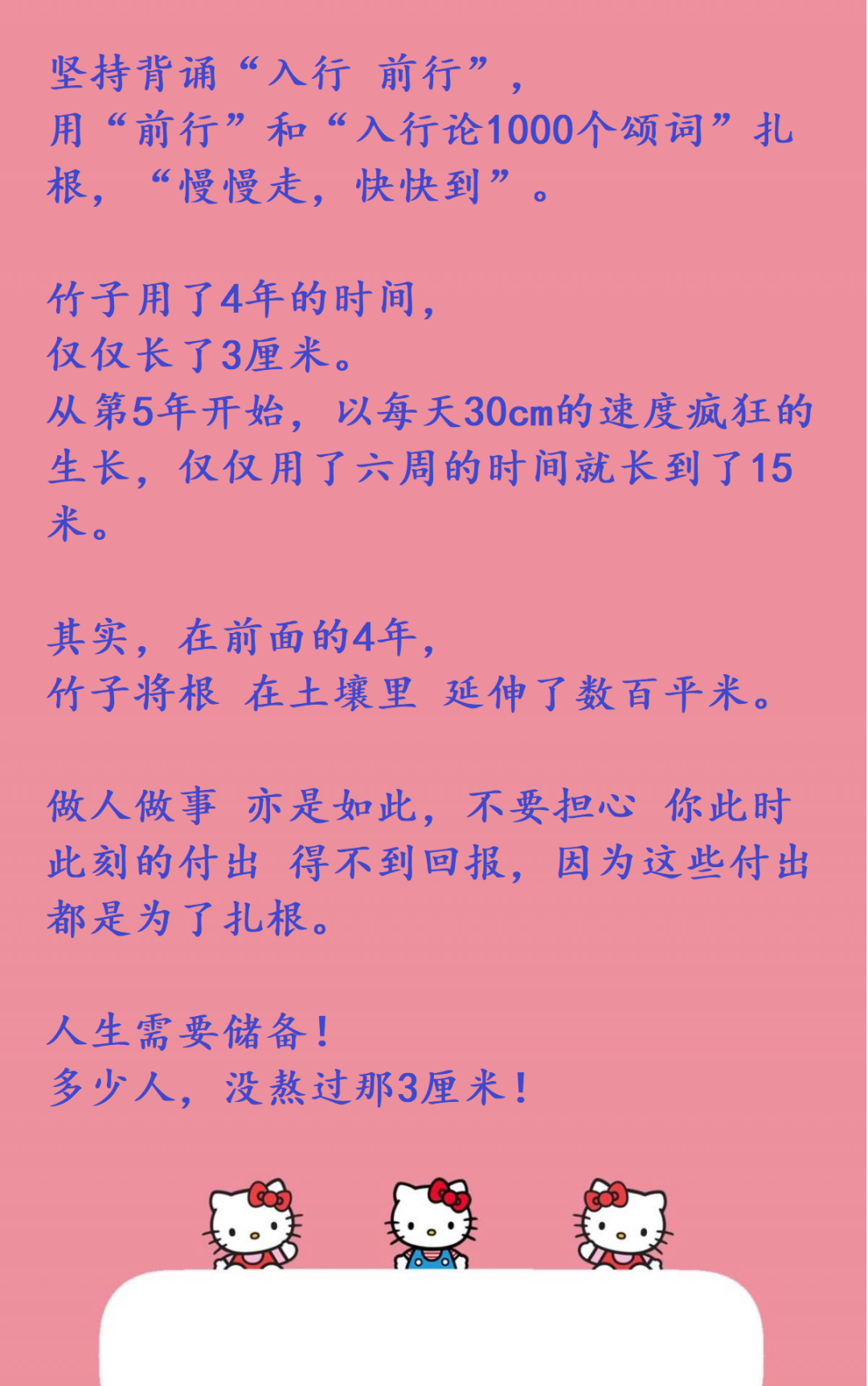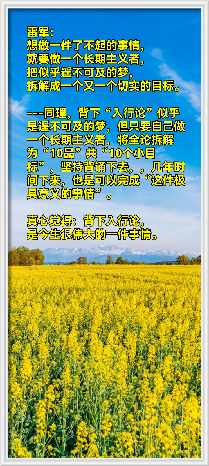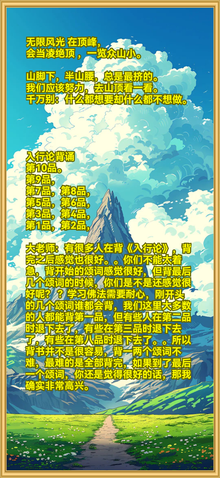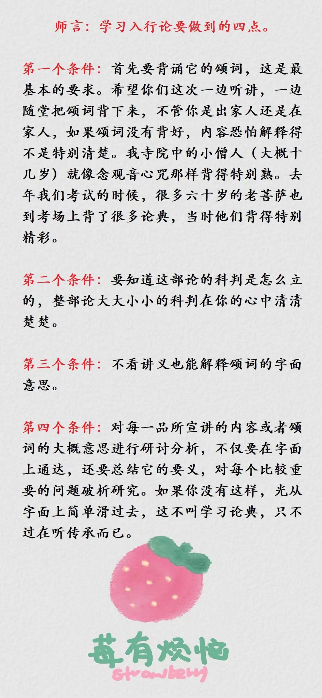 (1)一是不能离开颂词的原意,倘若离题万里,乱讲一气,那没有多大意义。(2)其次要掌握科判的安立,科判大家一定要搞明白。(3)科判和颂词的意义要结合起来,在此基础上进行发挥、辨别、分析,这是很重要的。【心语】不管做什么,都不要急于回报,因为 播种 和 收获 不在同一个季节,中间隔着的一段时间,叫做坚持!我们背诵也是如此,背下“入行论”似乎是遥不可及的梦,但只要自己做一个长期主义者,将全论拆解为“10品”共“10个小目标”,坚持下去,也是可以完成的“这件极具意义的事情”。将 背下整部入行论 的伟大梦想,分解为“10品”的“小”目标,,一年365天,每天坚持,每天将 “梦想” 实现一点点。