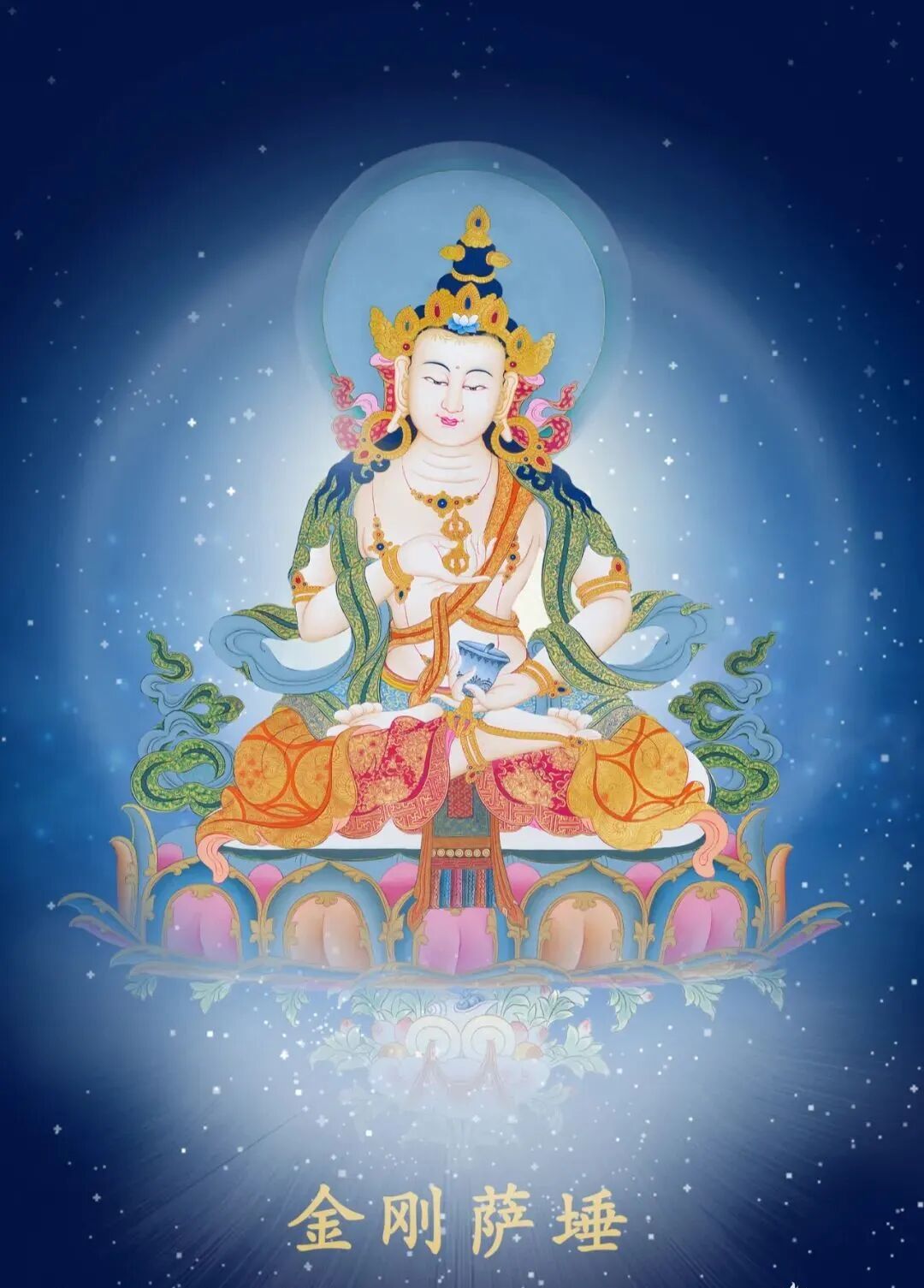 《金刚顶经瑜伽文殊师利菩萨法》云:“于心上诵百字真言加持自身,假使过去世中造种种恶业、五无间等一切罪障,由此百字真言加持故,一切罪障悉皆消灭。”世间人都喜欢买保险,但你买医疗保险,不能保证不生病;你买养老保险,也不能保证不衰老……即使是今生的畏惧处,也得不到保障。而念百字明,却为今生来世上了最有保障的“保险”。进入密宗金刚乘以后,无论失毁了根本誓言还是支分誓言,如果每天观想金刚萨埵而念诵二十一遍百字明,就能令堕罪的异熟果不会越来越增长,这叫加持堕罪。如《庄严藏续》中说:如果念诵十万遍百字明,那么一切堕罪都能从根本上得以清净。此续中云:“妙观白莲月垫上,上师金刚萨埵尊,依百字明之仪轨,倘若念诵二十一,即将加持堕罪等,使其不复得增长,诸成就者所宣说,故当恒时而修持,倘若已诵十万遍,必成清净之本性。”如果一心专注所缘境、不掺杂庸俗语言,一次性念诵一百零八遍百字明,往昔所造的一切罪障及所失毁的戒律,一定会得以清净。这是上师金刚萨埵亲口允诺的。《无垢忏悔续》中说:“百字明是一切善逝的智慧精华,能够净除所失毁的戒律与分别念的罪障,堪称为一切忏悔之王。倘若一次性念诵一百零八遍,便可酬补一切所失之戒,不会堕入三恶趣。任何一位瑜伽行者如果能发誓念诵,不但此人今生会被三世诸佛视为胜妙长子而加以护佑,而且命终之后,也无疑会成为诸佛的长子。”这是一次性念一百零八遍百字明的功德。学院好多道友这样发愿了,每天一百零八遍,能这样发愿,既被诸佛视作长子,又不堕恶趣,利益是不可思议的,而诸佛的承诺,也是最好的保证。如果明明知道自己造过很多恶业,也担心果报现前,那为何不赶紧忏悔呢?临死前,每天念一百零八遍百字明,今生来世都好,何乐而不为呢?如《庄严藏续》中说:如果念诵十万遍百字明,那么一切堕罪都能从根本上得以清净。此续中云:“妙观白莲月垫上,上师金刚萨埵尊,依百字明之仪轨,倘若念诵二十一,即将加持堕罪等,使其不复得增长,诸成就者所宣说,故当恒时而修持,倘若已诵十万遍,必成清净之本性。”何谓百尊之尊?大家知道,闻解脱里有寂猛百位本尊,其实一切佛菩萨、空行、护法,皆可包括于这百尊之中,而百尊又可包括于金刚萨埵一尊。简言之,就是十方如来可以摄于金刚萨埵,而金刚萨埵也可以幻化十方如来。这个关系,就如同太阳与阳光,太阳可以散射无量的阳光,而阳光又摄于太阳。所以,只要你修成了金刚萨埵,也就成就了百尊功德。尤其是,对于忏悔,金刚萨埵有不共愿力。阿弥陀佛的愿,侧重于摄受往生,让听闻其名号的众生往生极乐世界。而金刚萨埵,则是侧重于清净罪业,他曾于因地发愿:“凡闻我名号、凡观想我、凡念诵我心咒的众生,无始以来之罪业悉得清净,若不能者,我不取正觉。”如今,金刚萨埵已现前佛果,所以不论是谁,只要肯观修,就必定能净除一切罪业。而他的不共愿力,也是我们要着力观修的缘由。