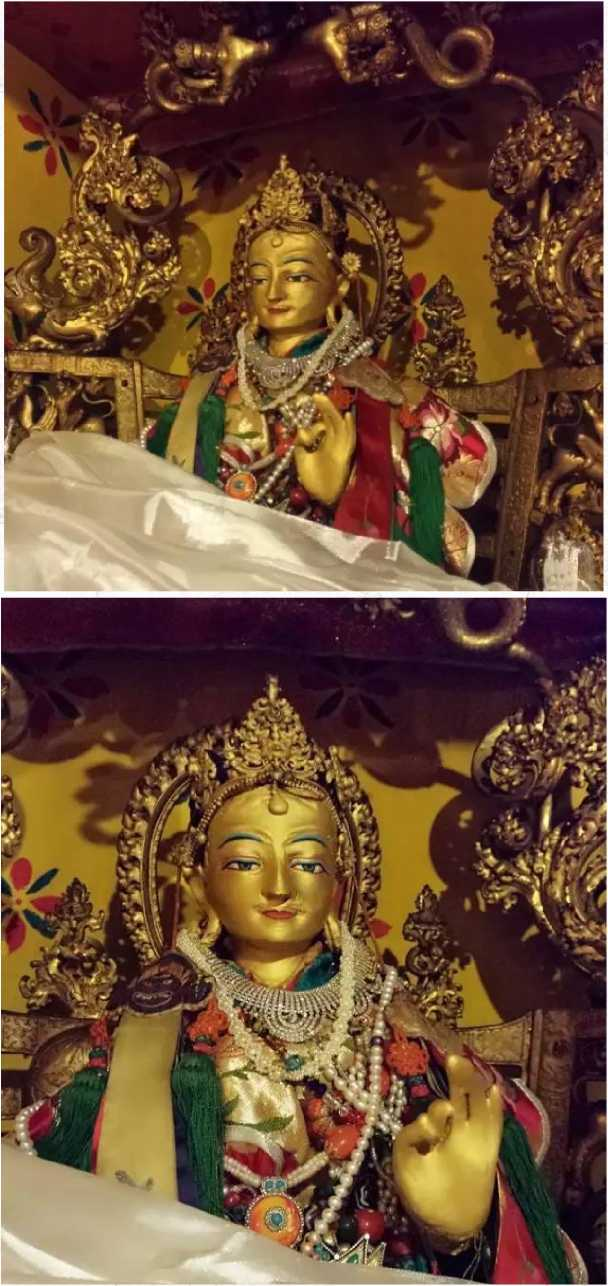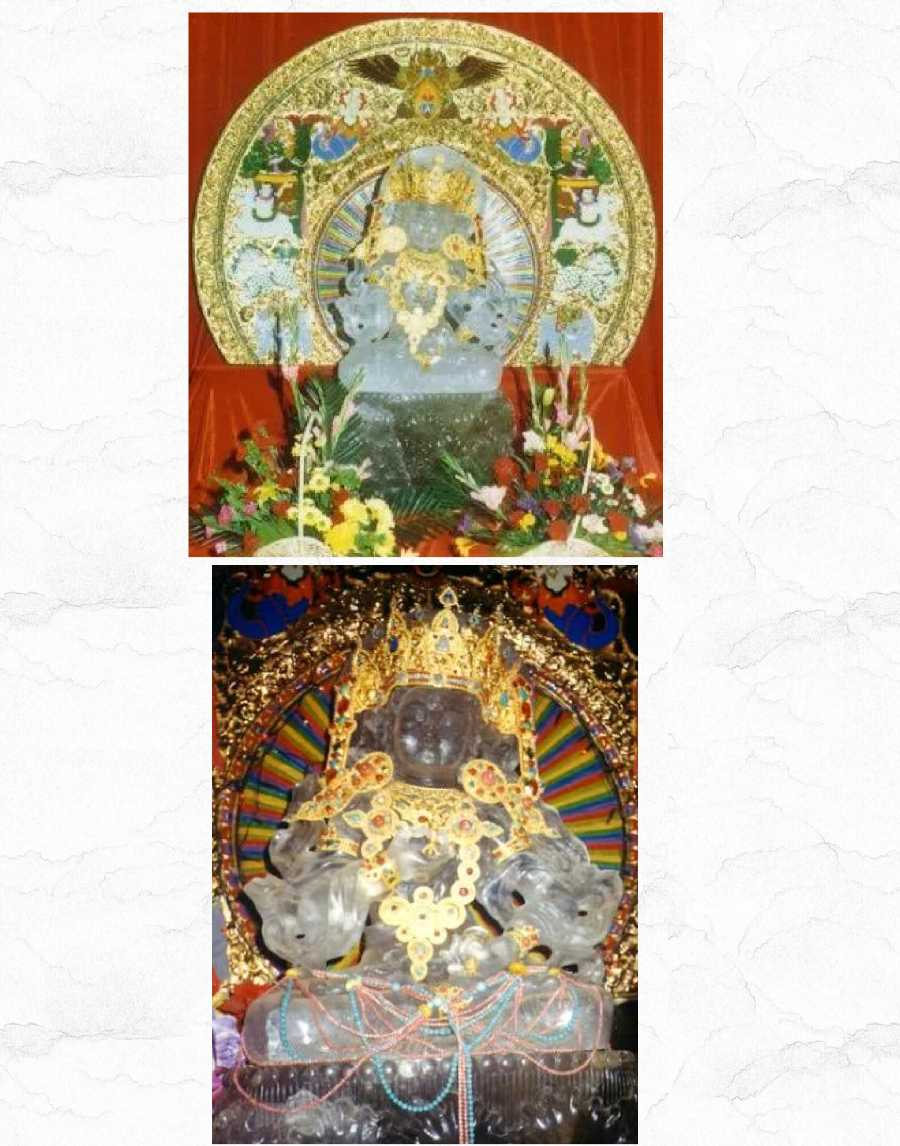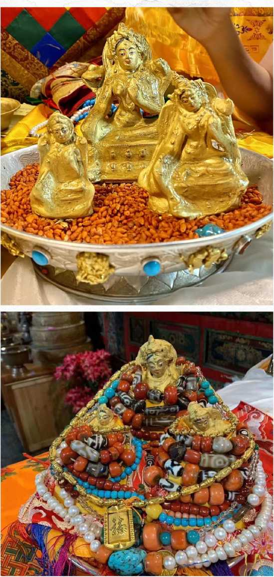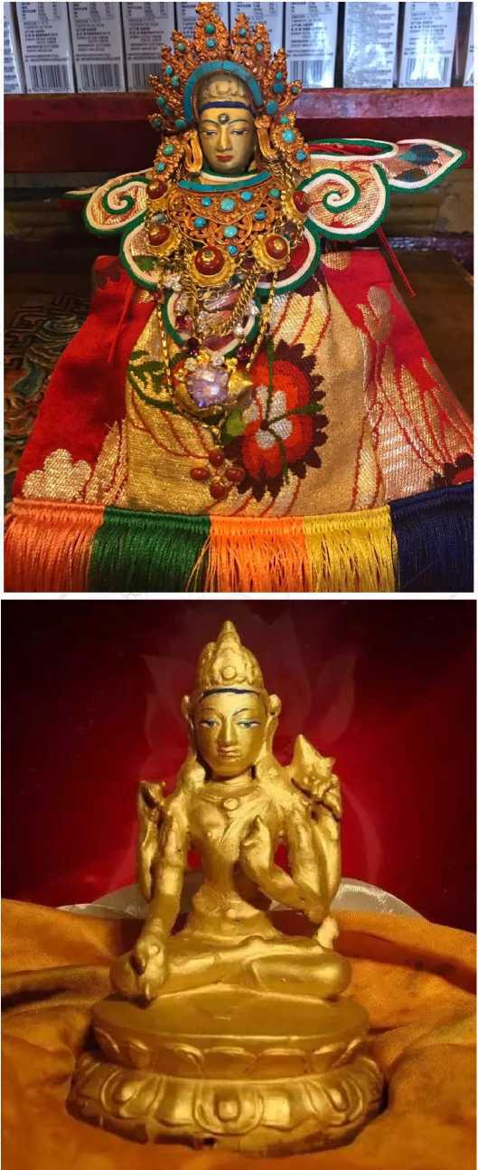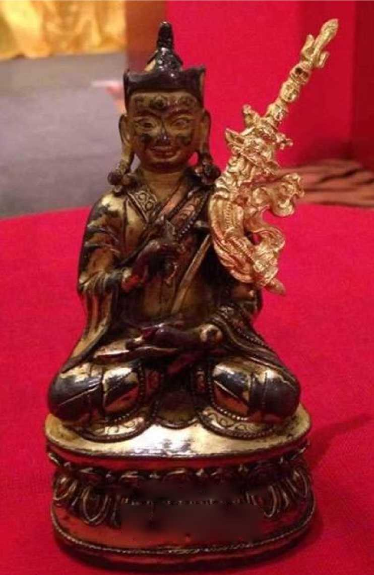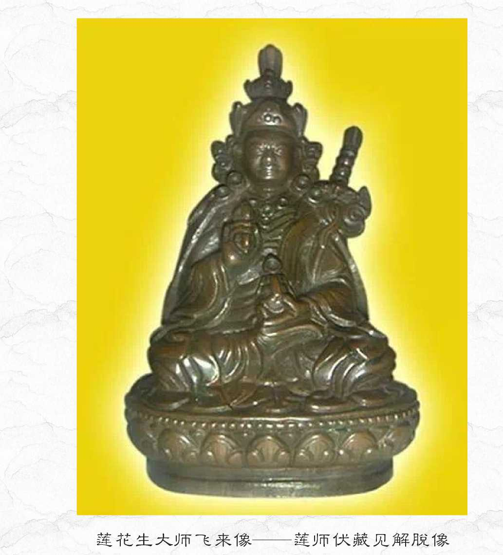 莲花生大师亲自伏藏的五尊莲师像之一,加持力巨大,佛像手杖为新造。"莲师如等我像"(雅砻歇扎莲师像),供奉于拉萨山南昌珠寺。在色达喇荣举办的一次长寿法会的第七天早上,在晋美彭措法王的法桌上有一尊8厘米左右高的莲师像。法王说:"这是刚才护法送过来的,是伏藏品。伏藏品有两种,一种需要个人亲自去开掘,一种则是由护法送过来的"。法王举起莲师像说:"给你们看看,见到的人必定能够解脱!这是咱们共同的福报"。这尊佛像非人工打凿,形象生动,栩栩如生,内有舍利。列绕朗巴尊者的伏藏莲师像,此像此前只在木猴年,每60年对外展示一次。为利益末法时期众生特开许发布。法王如意宝装藏开光,供奉于五台山菩萨顶祖师殿,是藏传佛教在汉地弘扬的重要缘起。莲师亲手制成此像,如同莲师的拇指太小。是不共加持的圣物,凡能见到、幷持大士心咒、恭敬礼拜者,均能得莲师慧光加持,将诸灾障消除,増长福慧,行者必能灭障解脱,毕竟成佛。莲师离开藏地时,亲塑此像赠予赤松德赞王之子穆赤赞普,由宗萨钦哲旺波取藏,现存放于印度比尔。"对此祈祷与我不分离,若无怀疑速疾获加持,与此殊胜替身结缘众,今生来世大利无勤生,是故诸众此意记心间。"——摘自莲师伏藏文百位伏藏王之初祖一咕鲁却旺伏藏大师自伏藏取出之莲师二十五替身之一,过去葛陀总寺上师密集金刚坛城之主尊、见卽解脱身宝。莲师在印度萨哈尔国时,被国王哲拉捆绑活活焚烧,历经七天七夜后莲师金刚之身竟然毫发无伤,此时一位美少年如如安坐在大火中自生莲花的花蕊上,当时国王惊奇不己,顿时生起广大信心,于是马上下令,打开皇家宝库,取出无数珍宝及国王宝冠,连同国政大臣和眷属等一并供养给了珍贵的师尊莲师,当时国王所献上的那顶宝冠,就是现在所知的"见卽解脱帽"。是眞正的"金刚萨垛"降临人间,供奉于喇荣五明佛学院。金刚萨垛百字明是忏悔王,金刚萨垛心咒是百字明之精华,以信心认眞修持一切罪障咎可淸净。凡见此像者即同现量观见观音圣颜及布达拉淸净剎土之无量宮殿, 仅睹一面既能彻底解脱包括无间地狱在内八大地狱之苦及八种怖畏乃至五无间罪。一见此像既可淸净舍法罪,谤佛菩萨等太小一切罪业,并积累如百千大梵天之福德且获致世间所有之善根。临命终时,现量目睹观音慈面,并得殊胜心之安宁,死后顿生极乐界,又远离一切障难,且能忆念五十百千宿世之事,直至菩提果间,今生乃轮回之最后一世。这尊度母心间有白宝石,对之祈祷有求必应,非常灵验,也称为满愿度母。尊者终生修持度母法门,随身携带的这尊度母佛像更常常开口话, 指导尊者弘法。供奉于拉萨卓玛拉康。文成公主出嫁将佛祖十二岁等身像带到了西藏。太宗看见佛位空着,恼于在此补供什么佛像,这时度母开口说话:"不必供奉其他像,我来代替释迦佛敎化、普度众生吧。”由此广仁寺成为汉地唯一绿度母主道场。能言度母,此尊度母建议阿底峡尊者前往西藏,当今藏传及我们能学习藏传都与她有极深的因缘。这尊能言绿度母相传是在下密院的墙壁上自然浮現,面貌身段仪态庄严、丰腴、美丽,乃下密院镶寺之宝。此度母是伏藏度母,她有三种含义:1.右肩剑,代表智慧,所以是智慧母。2.左肩宝瓶,代表事业,所以是事业母。3.度母颜色为红色,代表自在,所以是自在母。莫扎法王亲口授记:"与此文武百尊坛城及万佛结缘者,必定往生西方极乐世界!凡有缘见到此坛城,甚至是照片,起一念恭敬者,不堕三恶道,最多七世为人,第八世成佛。”是非常殊胜的伏藏品,加持力极大!顶果钦哲法王亲自为其作注,有见解脱,消除一切灾难,心想事成之功德利益安巴根特为五方文殊师利菩萨密意化现之伏藏,可淸净三业忏罪集福増慧开智的见解脱,故所有见到此瑞图的众生,都终究必将脱离苦海,归于佛道。对末法时代的众生产生不可估量的利益。系由空行文字所写,由十七世纪时大掘藏师敏久多吉上师取藏。见卽解脱咒,凡见忆,礼赞,供奉者其功德:1、五毒将被淸净。2、将不堕下三道。3、将自恶道中解脱。4、将自业果中解脱。5、将自轮回怖畏中解脱。