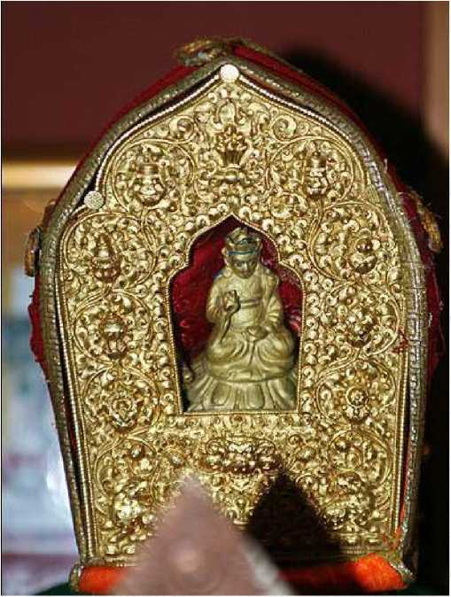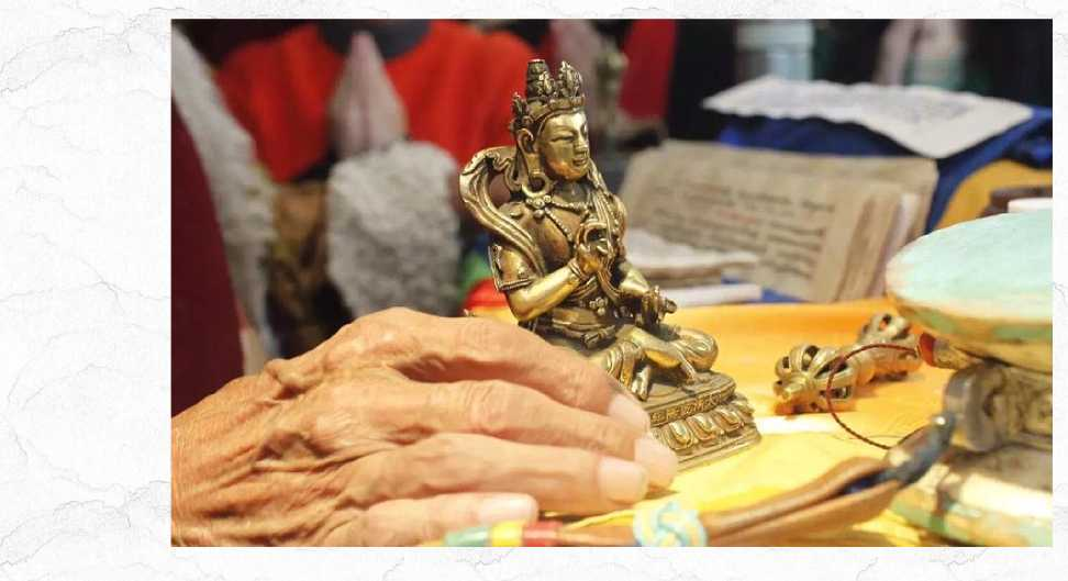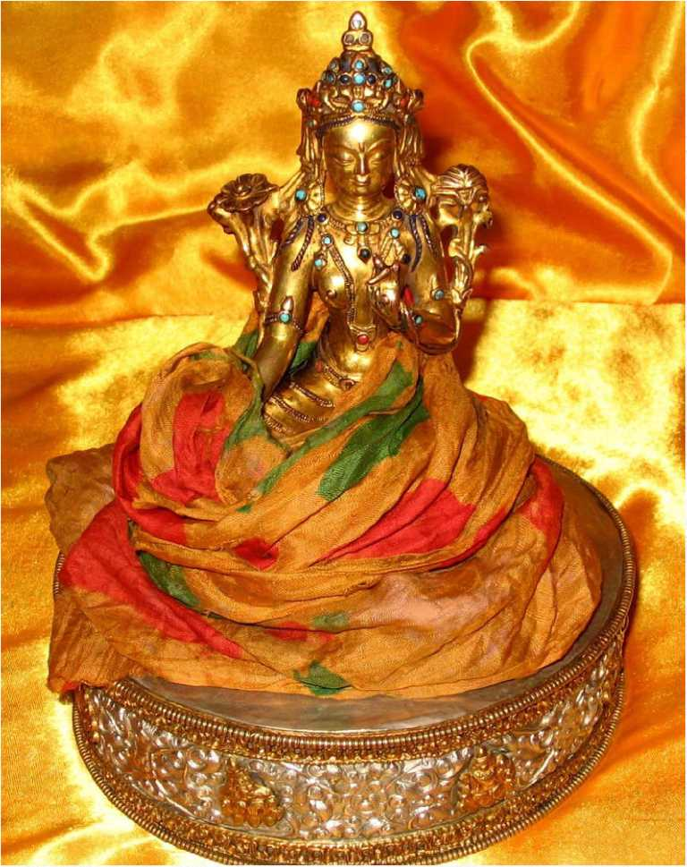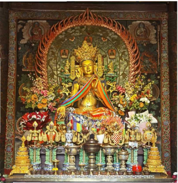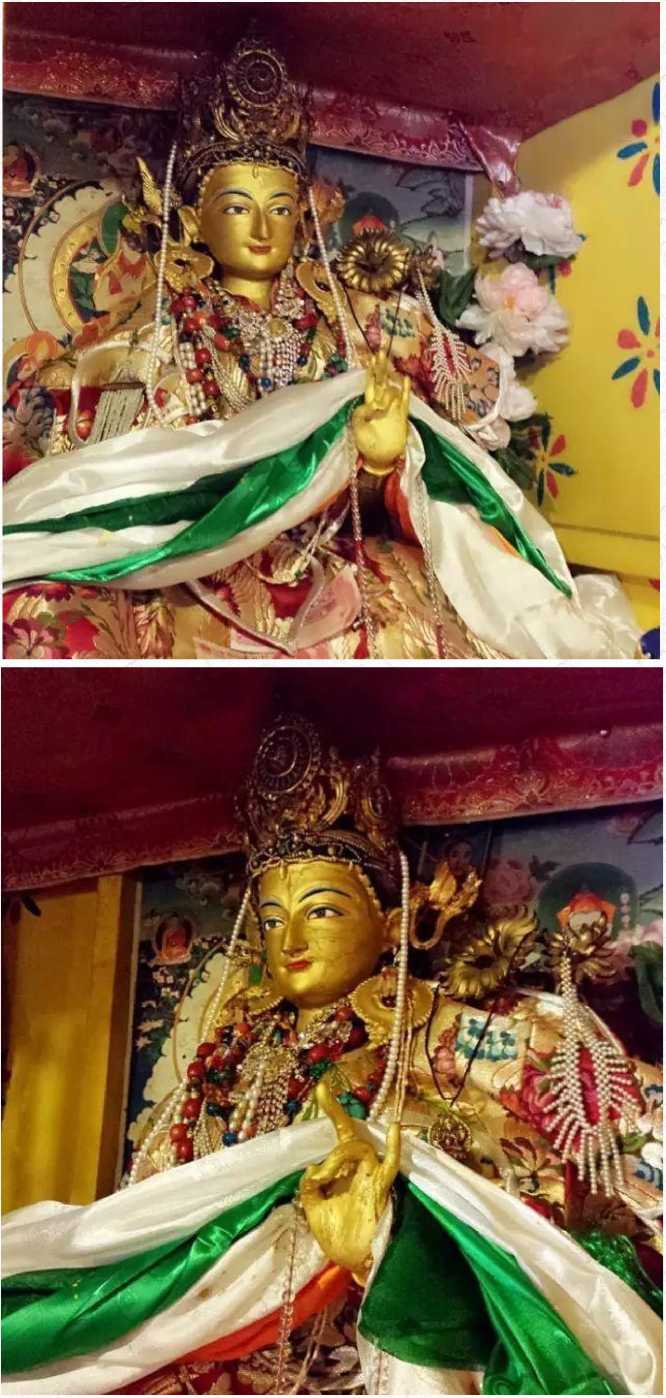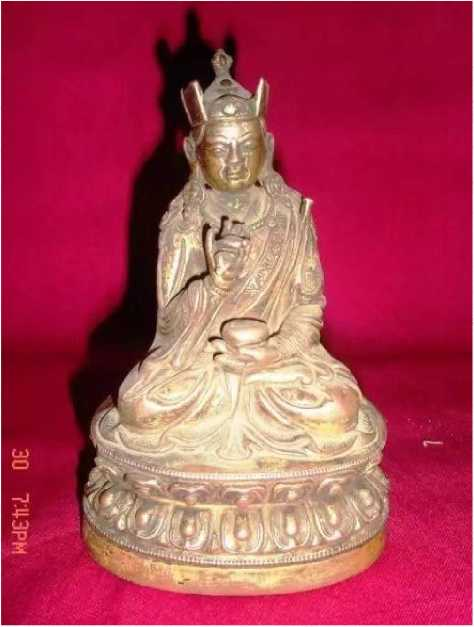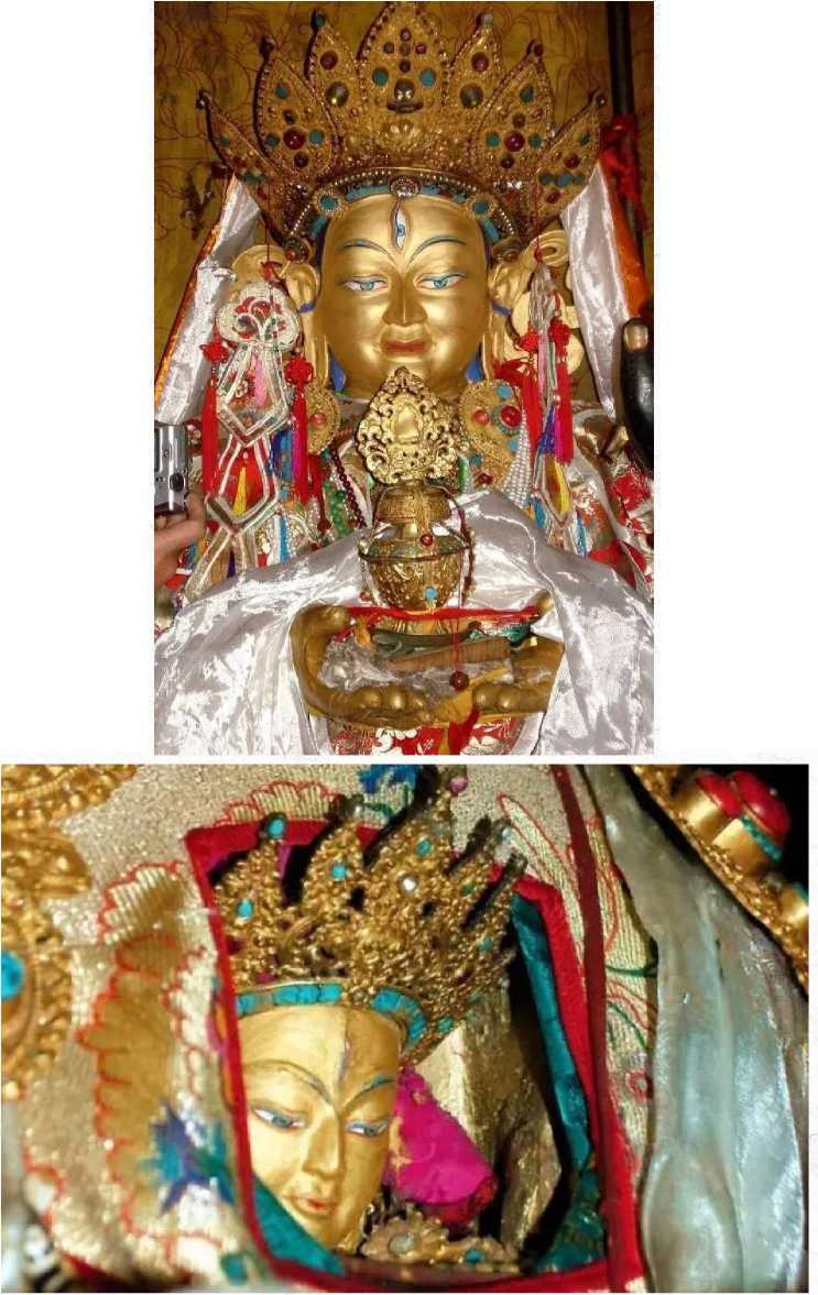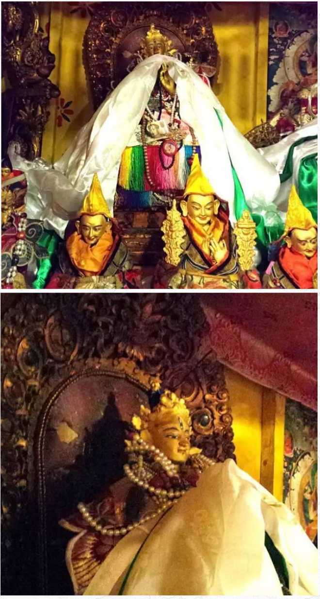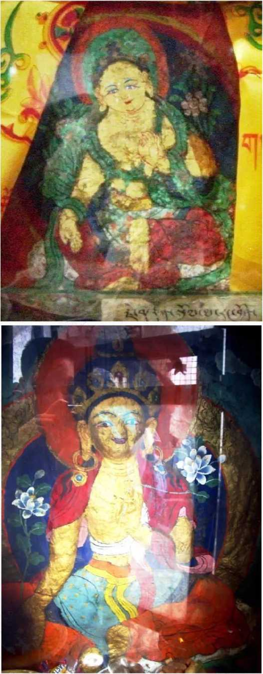 莲花生大师亲自伏藏的五尊莲师像之一,加持力巨大,佛像手杖为新造。"莲师如等我像"(雅砻歇扎莲师像),供奉于拉萨山南昌珠寺。在色达喇荣举办的一次长寿法会的第七天早上,在晋美彭措法王的法桌上有一尊8厘米左右高的莲师像。法王说:"这是刚才护法送过来的,是伏藏品。伏藏品有两种,一种需要个人亲自去开掘,一种则是由护法送过来的"。法王举起莲师像说:"给你们看看,见到的人必定能够解脱!这是咱们共同的福报"。这尊佛像非人工打凿,形象生动,栩栩如生,内有舍利。列绕朗巴尊者的伏藏莲师像,此像此前只在木猴年,每60年对外展示一次。为利益末法时期众生特开许发布。法王如意宝装藏开光,供奉于五台山菩萨顶祖师殿,是藏传佛教在汉地弘扬的重要缘起。莲师亲手制成此像,如同莲师的拇指太小。是不共加持的圣物,凡能见到、幷持大士心咒、恭敬礼拜者,均能得莲师慧光加持,将诸灾障消除,増长福慧,行者必能灭障解脱,毕竟成佛。莲师离开藏地时,亲塑此像赠予赤松德赞王之子穆赤赞普,由宗萨钦哲旺波取藏,现存放于印度比尔。"对此祈祷与我不分离,若无怀疑速疾获加持,与此殊胜替身结缘众,今生来世大利无勤生,是故诸众此意记心间。"——摘自莲师伏藏文百位伏藏王之初祖一咕鲁却旺伏藏大师自伏藏取出之莲师二十五替身之一,过去葛陀总寺上师密集金刚坛城之主尊、见卽解脱身宝。莲师在印度萨哈尔国时,被国王哲拉捆绑活活焚烧,历经七天七夜后莲师金刚之身竟然毫发无伤,此时一位美少年如如安坐在大火中自生莲花的花蕊上,当时国王惊奇不己,顿时生起广大信心,于是马上下令,打开皇家宝库,取出无数珍宝及国王宝冠,连同国政大臣和眷属等一并供养给了珍贵的师尊莲师,当时国王所献上的那顶宝冠,就是现在所知的"见卽解脱帽"。是眞正的"金刚萨垛"降临人间,供奉于喇荣五明佛学院。金刚萨垛百字明是忏悔王,金刚萨垛心咒是百字明之精华,以信心认眞修持一切罪障咎可淸净。凡见此像者即同现量观见观音圣颜及布达拉淸净剎土之无量宮殿, 仅睹一面既能彻底解脱包括无间地狱在内八大地狱之苦及八种怖畏乃至五无间罪。一见此像既可淸净舍法罪,谤佛菩萨等太小一切罪业,并积累如百千大梵天之福德且获致世间所有之善根。临命终时,现量目睹观音慈面,并得殊胜心之安宁,死后顿生极乐界,又远离一切障难,且能忆念五十百千宿世之事,直至菩提果间,今生乃轮回之最后一世。这尊度母心间有白宝石,对之祈祷有求必应,非常灵验,也称为满愿度母。尊者终生修持度母法门,随身携带的这尊度母佛像更常常开口话, 指导尊者弘法。供奉于拉萨卓玛拉康。文成公主出嫁将佛祖十二岁等身像带到了西藏。太宗看见佛位空着,恼于在此补供什么佛像,这时度母开口说话:"不必供奉其他像,我来代替释迦佛敎化、普度众生吧。”由此广仁寺成为汉地唯一绿度母主道场。能言度母,此尊度母建议阿底峡尊者前往西藏,当今藏传及我们能学习藏传都与她有极深的因缘。这尊能言绿度母相传是在下密院的墙壁上自然浮現,面貌身段仪态庄严、丰腴、美丽,乃下密院镶寺之宝。此度母是伏藏度母,她有三种含义:1.右肩剑,代表智慧,所以是智慧母。2.左肩宝瓶,代表事业,所以是事业母。3.度母颜色为红色,代表自在,所以是自在母。莫扎法王亲口授记:"与此文武百尊坛城及万佛结缘者,必定往生西方极乐世界!凡有缘见到此坛城,甚至是照片,起一念恭敬者,不堕三恶道,最多七世为人,第八世成佛。”是非常殊胜的伏藏品,加持力极大!顶果钦哲法王亲自为其作注,有见解脱,消除一切灾难,心想事成之功德利益安巴根特为五方文殊师利菩萨密意化现之伏藏,可淸净三业忏罪集福増慧开智的见解脱,故所有见到此瑞图的众生,都终究必将脱离苦海,归于佛道。对末法时代的众生产生不可估量的利益。系由空行文字所写,由十七世纪时大掘藏师敏久多吉上师取藏。见卽解脱咒,凡见忆,礼赞,供奉者其功德:1、五毒将被淸净。2、将不堕下三道。3、将自恶道中解脱。4、将自业果中解脱。5、将自轮回怖畏中解脱。
