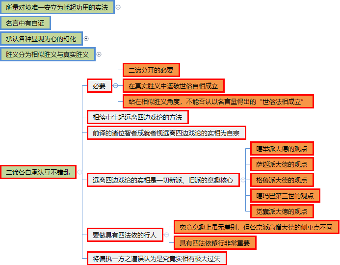 2、中观应成派着重抉择圣者根本慧定,而中观自续派主要以圣者出定的妙慧进行抉择。从最究竟来讲,中观应成派和中观自续派圆融无违;而且,通过后得的妙观察智慧,中观自续派暂时所抉择的名言中业因果、前世后世存在等也是非常合理的。此处第五个特点就是分析中观自续派承许的胜义谛和世俗谛不能混杂在一起的必要性。