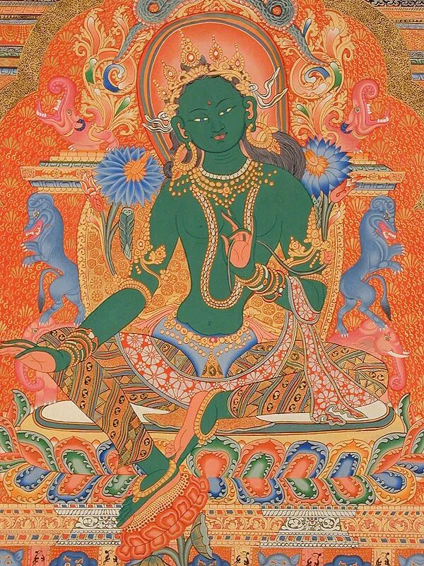 有一次,他被别人欺负了,特别伤心,就抱着石像大哭。这时绿度母像竟然动了,将他抱了起来,深深拥入自己怀中,像慈母般不断安慰着他,并开始陪他玩耍。最后在他离开时,绿度母像取下自己脖子上的珍宝项链,挂在了那小孩的颈上,以帮助他的贫困。