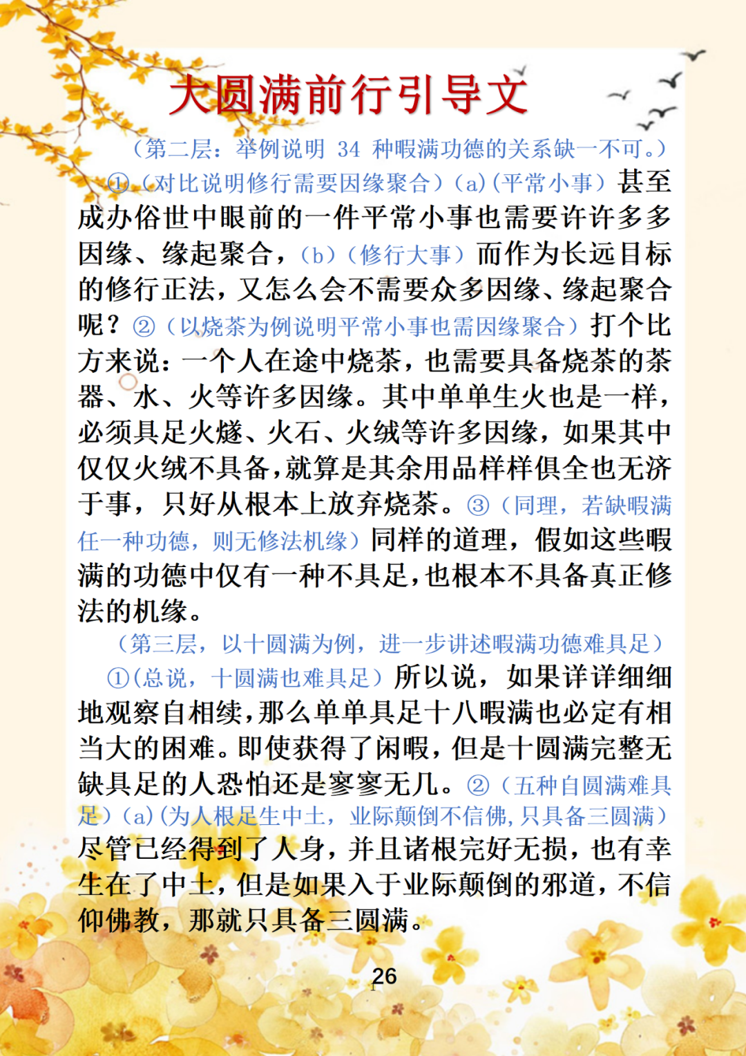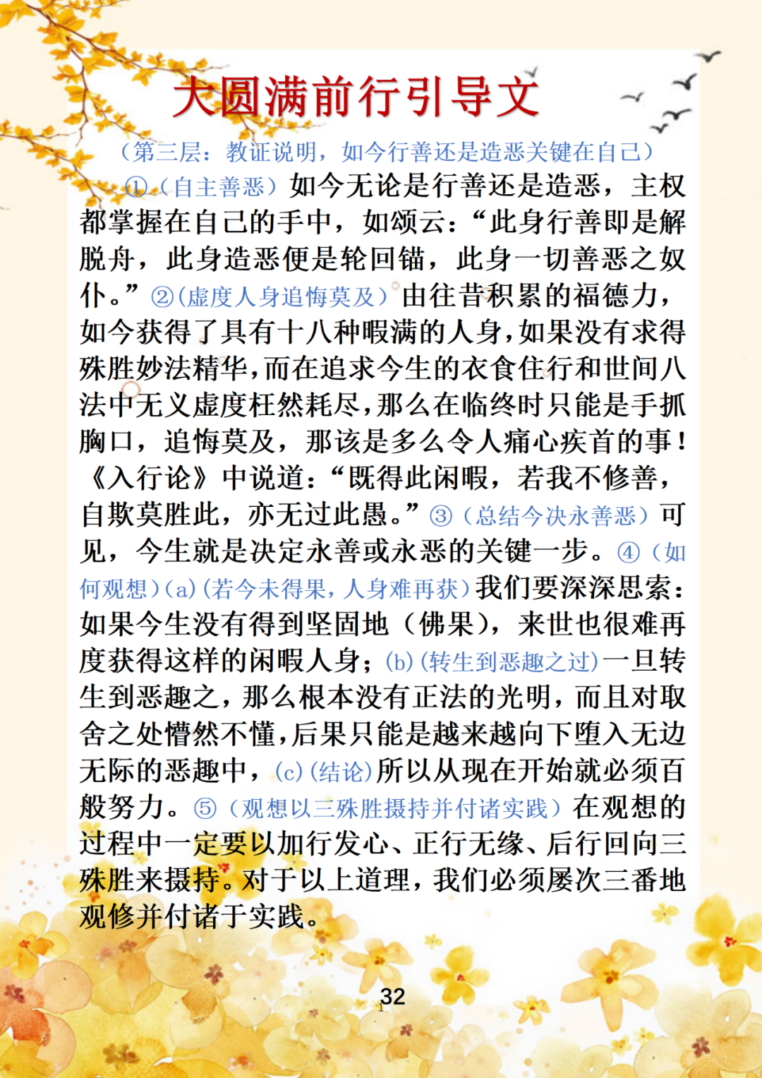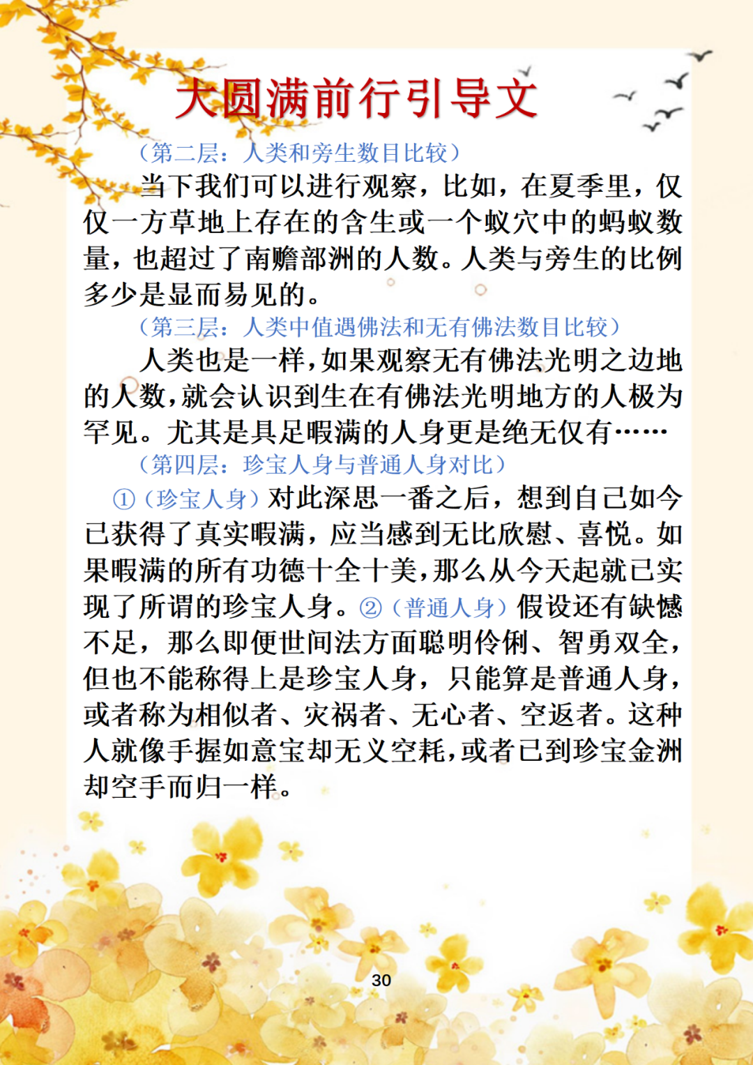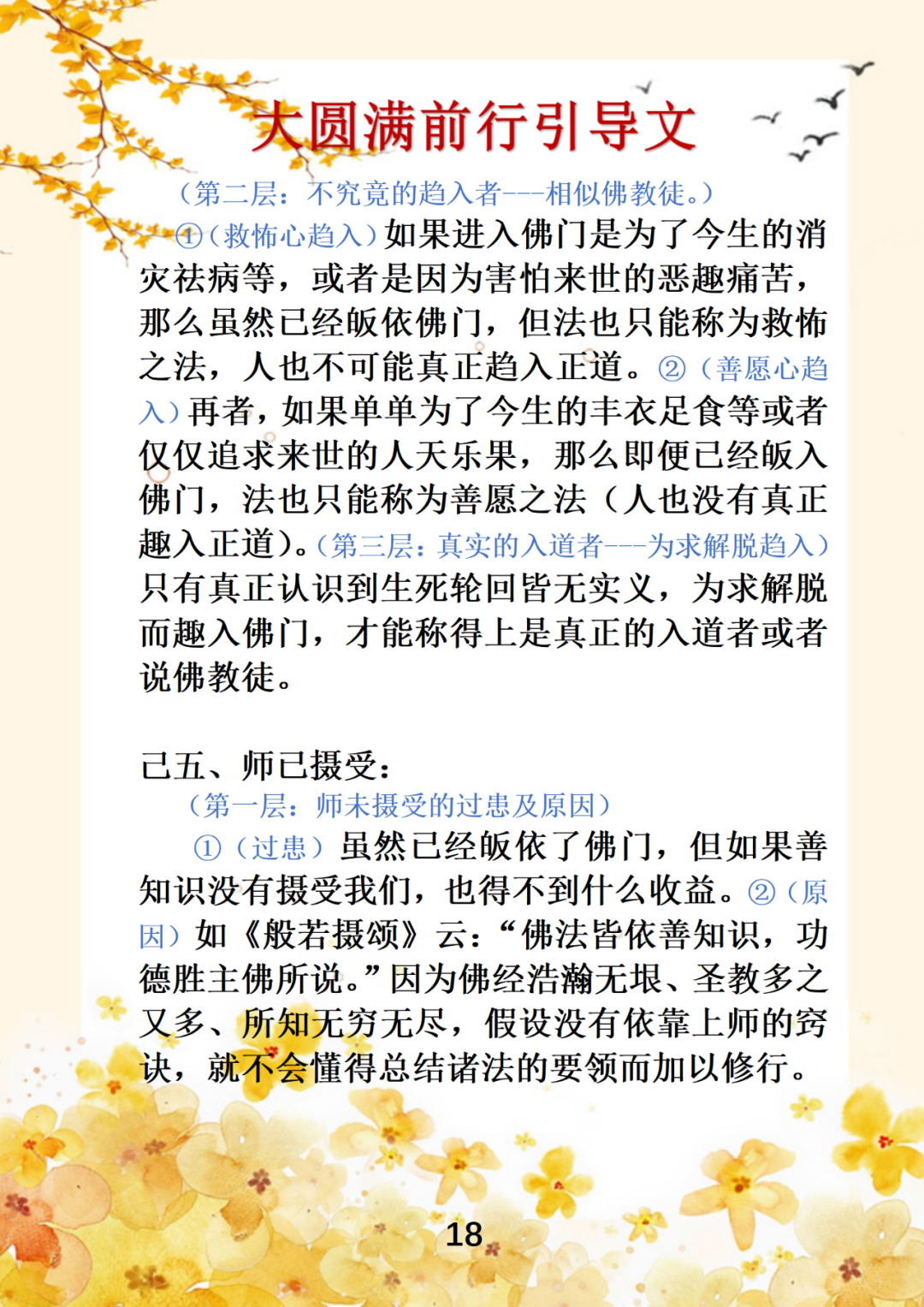 师言:藏chaun佛教有很多修行人,《前行引导文》可一字不漏地背下来。当然,若要做到这样,对《前行》的文字肯定要下功夫,如果下了功夫,那一辈子不会轻易忘记,里面的内容什么时候要用,什么时候即可浮现于心间。华智仁波切的每一句话,希望大家务必要记住。那天学院个别人已发愿背诵《大圆满前行引导文》,希望你们一定要善始善终,如果真能背下来,我敢保证你会变成很好的修行人。