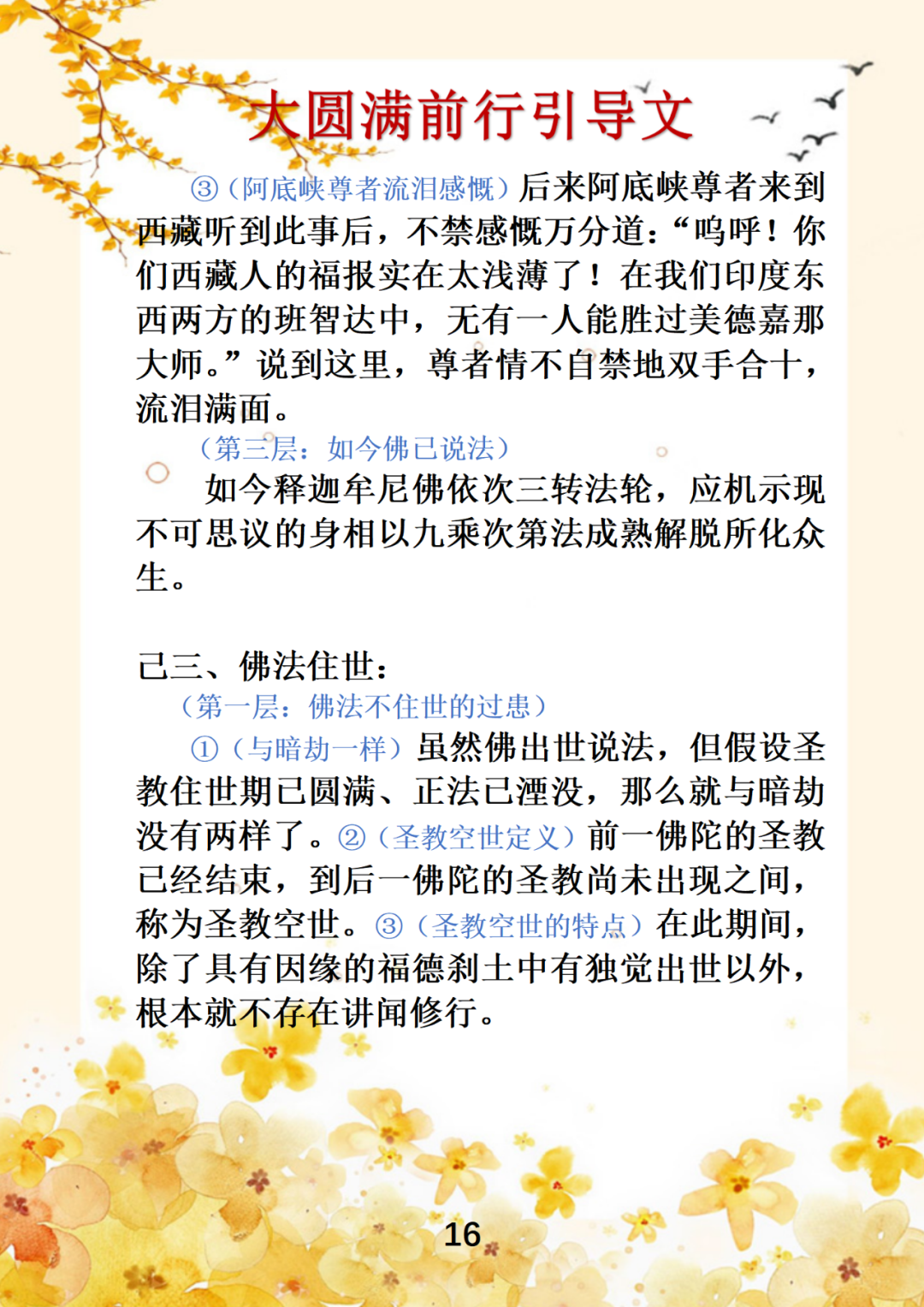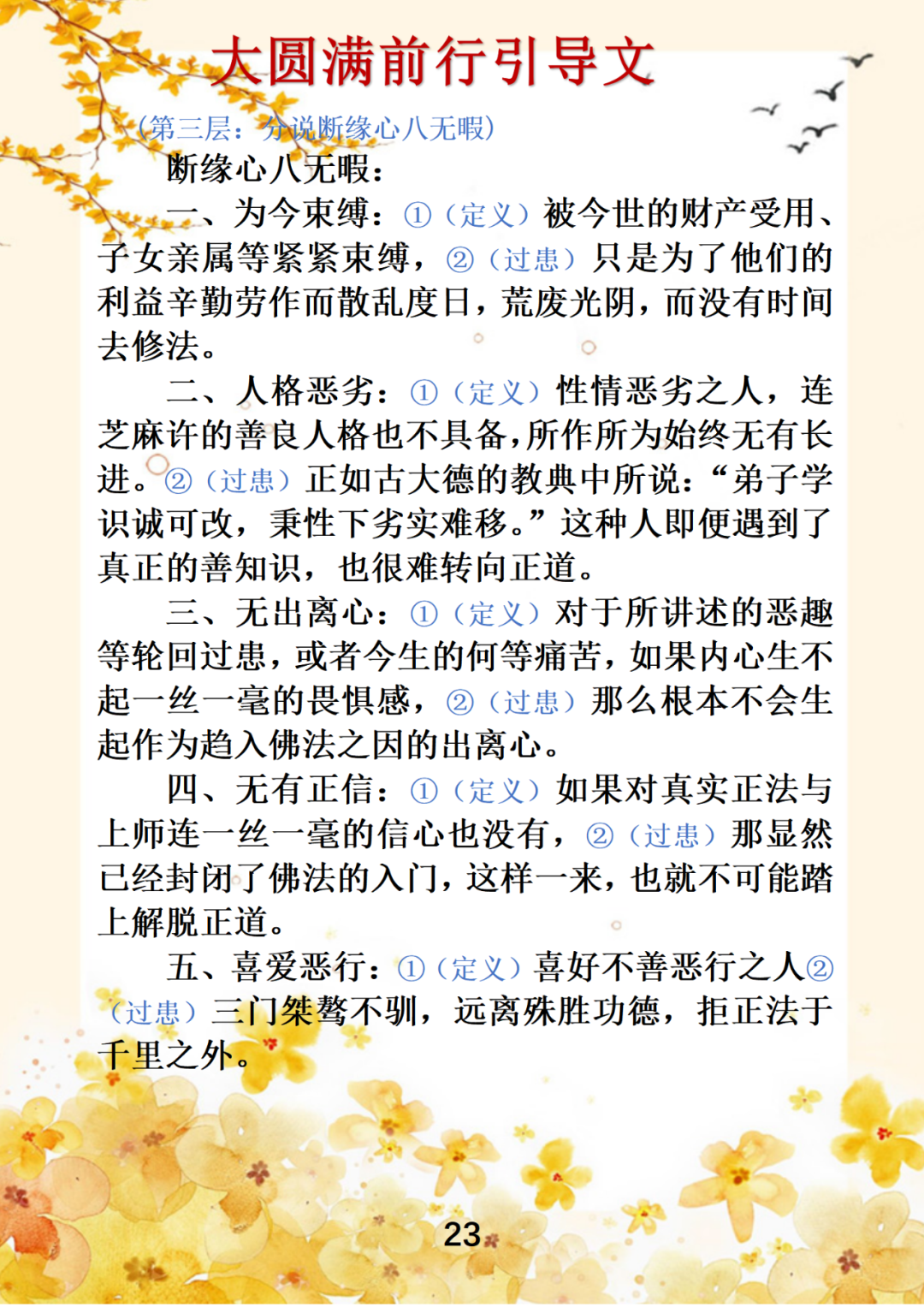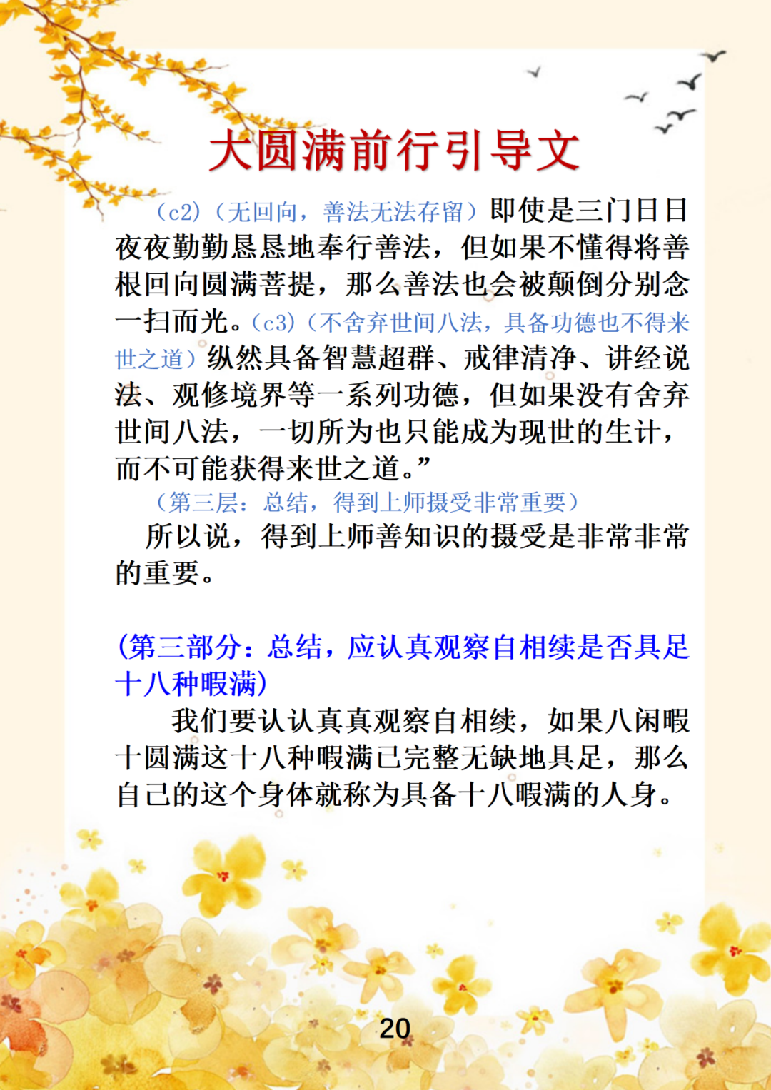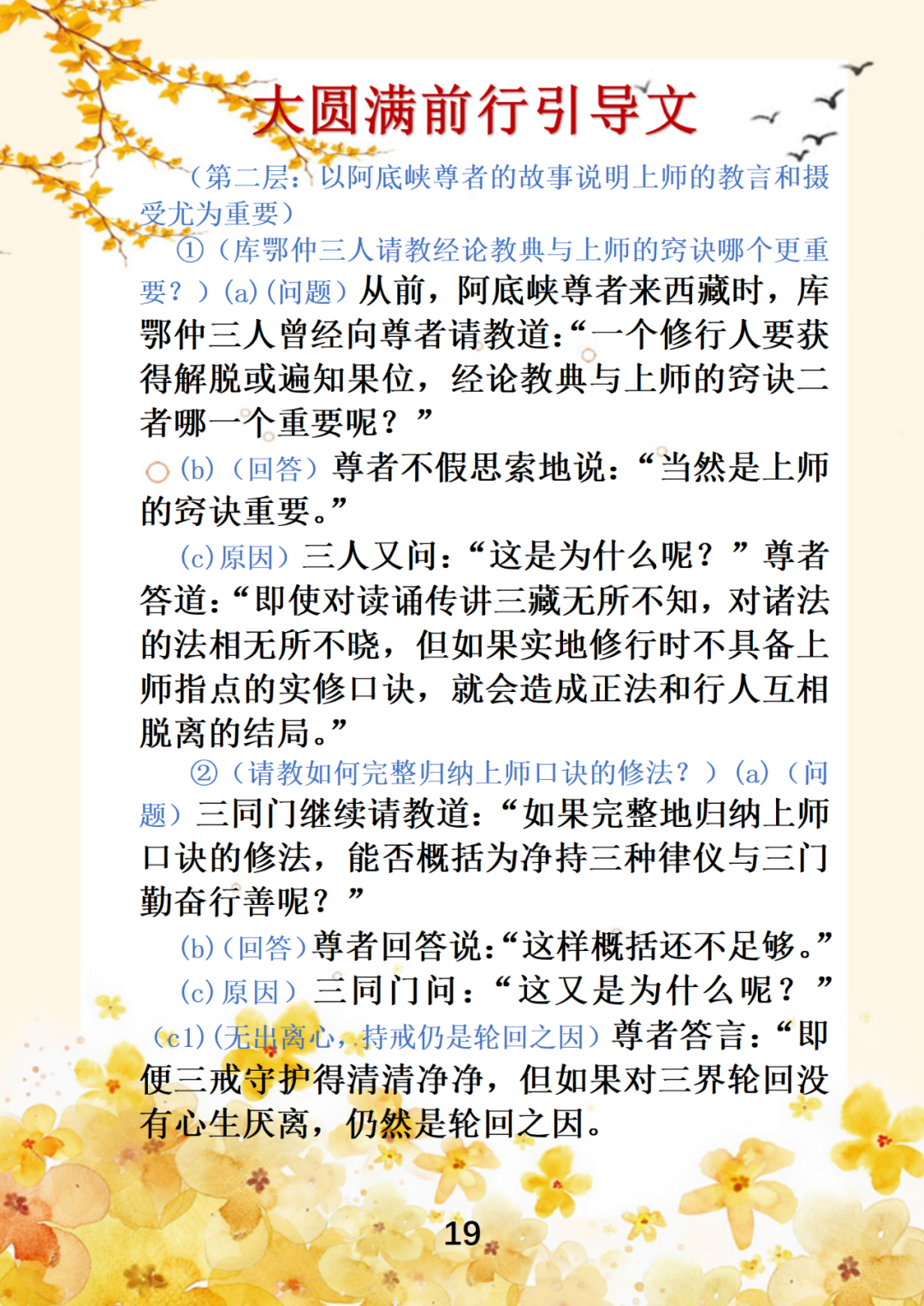 师言:藏chaun佛教有很多修行人,《前行引导文》可一字不漏地背下来。当然,若要做到这样,对《前行》的文字肯定要下功夫,如果下了功夫,那一辈子不会轻易忘记,里面的内容什么时候要用,什么时候即可浮现于心间。华智仁波切的每一句话,希望大家务必要记住。那天学院个别人已发愿背诵《大圆满前行引导文》,希望你们一定要善始善终,如果真能背下来,我敢保证你会变成很好的修行人。