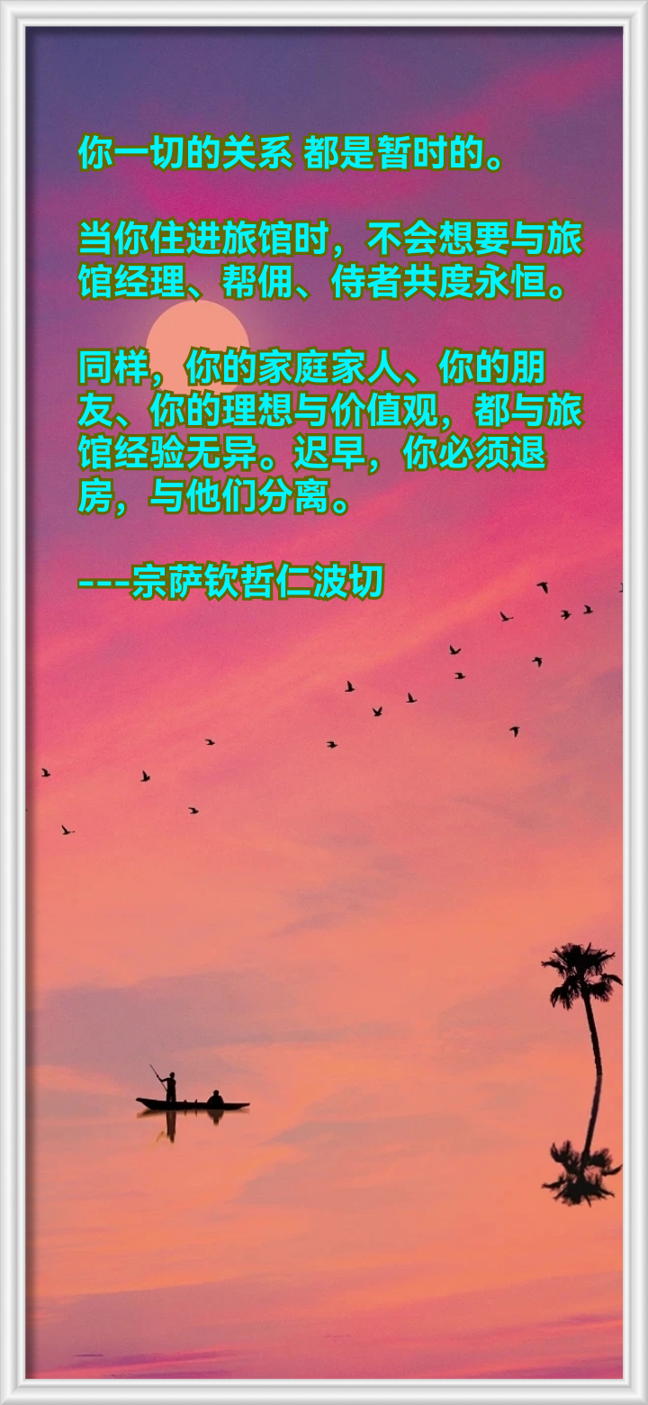 对每个人来讲,身体、受用、亲人只是暂时的,唯有自己的心才是永远的。佛经中有一个比喻说:从前有个商人娶了四个妻子:四夫人最得丈夫宠爱,丈夫对她言听计从;三夫人是经过一番辛苦才得到的,所以丈夫常带在身边,甜言蜜语;二夫人与丈夫天天见面,犹如一个推心置腹的朋友;大夫人像个女仆,毫无怨言地任由使唤,但在丈夫心目中没有地位。一天,丈夫要远行,必须离开故乡,他问四个妻子谁愿意跟他去。三夫人回答:“连你最爱的四夫人都不愿去,我为什么陪你去?”二夫人说:“我可以送你到城外,但不想陪你去那么远的地方。”只有大夫人说:“不管你去哪里、走多远,我一定陪着你!”最宠爱的四夫人,代表我们的身体,人活着的时候,对身体最为执著,可是死了以后,肉体轰然倒地,没有办法跟随自己;三夫人是我们的财富,不论多么辛苦积累起来,死时也不能带走一分一厘;二夫人是世间的亲朋好友,他们最多在我们死时哭哭啼啼,把我们尸体埋到城外的坟墓里;大夫人则是人的心,它和我们的关系最密切,跟我们一起漂泊于轮回,但我们也最容易忽略它,反而将全部精力贯注于虚幻的色身上。此处主要讲看破今世。通过观修无常,我们知道长期相伴的亲朋好友,最终都会彼此分离;辛辛苦苦积累的财产,死时要统统留在人间;意识也会舍弃身体,孤独无依地前往后世。思维这三种原因以后,我们理当看破对今世的贪执与牵挂,只有看得破,才能放得下,只有放得下,才能获得自在,只有获得自在,才能得到解脱,这也是禅宗和净土宗大德口口声声宣扬的教言。《开启修心门扉》的第一个教言,就广泛阐述了看破今世的利益和功德。有些人可能想:“看破今世很困难啊,我怎么舍得亲友、财产乃至身体?”其实若从道理上分析,这些没什么值得贪恋的。父母亲眷、兄弟姊妹等关系密切之人,虽与自己相依相伴,但到了最后也是各奔前程,不可能一起前往中阴。有时候是他们先离世而抛弃我们,有时候是我们先离开,把他们留在人间,这是一个必然规律,谁也无法躲避。至于财产,因为是自己披星戴月、早出晚归积累的,好像也舍不得。但就算再依依不舍,离开人世时,也如同从酥油中拔出毛发般,带不走一丝一毫。甚至有些人在还没死之前,依靠种种原因,就没有权力享用财产了。所以,我们不要成为财产的奴仆,这样并没有什么价值。不仅是这些身外之物,就连心识的旅客,也要离开身体的客栈,孤独无助地去往陌生的地方。身体就像一家旅馆,心识犹如一位过客,客人在旅店中呆了一两天,就要离开,同样,我们在六道中不断流转,今生依靠这个身体而留在人道中,一旦离开了身体,身体被火葬或者天葬后,心识又开始转入下一世。通过这几种原因来分析,我们应该知道今生所贪的身体、财产、亲友一定要舍弃,不然就不可能获得殊胜的定解。无常观在修行人的境界中非常重要,假如生起了对无常的感悟,知道生老死病、得失成败等都是正常现象,那么修行很容易成功。佛经也说:“三有无常如秋云,有情生死如观戏。”这个教证以前用过很多次。真的,有情的生死就像看戏一样瞬息万变,今天生、明天死,没有什么可靠的,只要懂得世界的虚幻本质,面对生老死病,很多人就不会特别在意了。但现在的世间人并非如此,有时候看到他们的行为,我们修行人确实有种不同的感受。尽管我自己也修行很差,但是跟长期受世间教育的人相比,某些方面还是有一点差别。以前米拉日巴即将返回家乡时,上师送他一段金玉良言:“如果没有看破尘世,将世间法与胜法混为一谈,修法必将荒废。”也就是说,殊胜的佛法与看破今世是紧密相联的,倘若能够看破今世,那么修行一定会成功,否则是非常困难的。当然,作为世间人,对财产和身体等不贪著是不可能的,但是也应该想一想这些道理,看看每天特别耽著的事物到底有没有意义。现在的世间人,要么对亲友特别执著,经常痛苦万分,要么对财产特别执著,尤其是开放以后,每个人的要求特别高,买房子、买轿车……享受的层次越来越提升,一直盲目地往前追,根本没有修行的机会和时间。但最后得到什么呢?只有劳累、忧愁、沧桑,除此之外有没有其他的?自己应该会明白。所以,到了一定的时候,应该要观观无常,学会知足少欲。北京有个修行很好的知识分子,现在已经退休了,他以前是我国著名的科学家,对新事物的判断和研究非常深,关于科学方面写过十几本书。他对佛教也有虔诚的信心,白天不断地探索科学知识,晚上一直修颇瓦法。他的生活相当简朴,整个屋子里,家具是古式的桌子椅子,除了一个电风扇和电话以外,什么现代化的东西都没有。电话是为了方便国外的孩子跟他问候,看他的身体怎么样了;北京比较热,夏天没有电风扇也不行,而其他的钱财,他全部用于慈善方面,自己没有被新时代所转变。可我们不是这样,今天看到一个新产品---“啊,这个东西很好!是MP3、MP4、MP5、MP6……”就开始不断地求啊求啊,最后也不知道到了什么地步,反正是永无止境地往前追,拼命追。其实这是很累的,一切全都是幻化,没有多大意义,所以到了一定的时候,自己应该有控制能力,生活知足少欲,才不会很痛苦。但现在的人恰恰相反,一生中疯狂地往前冲,最终一无所得、空空归回,非常可怜!不管是怨恨的敌人还是亲戚朋友,甚至包括自己的生命,在死亡来临时,都会化为空无。所以,活着的时候,我们不应为
