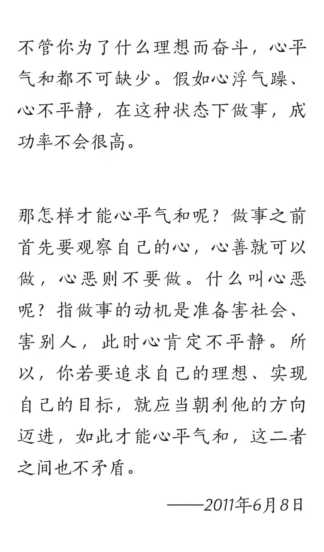 那怎样才能心平气和呢?做事之前首先要观察自己的心,心善就可以做,心恶则不要做。什么叫心恶呢?指做事的动机是准备害社会、害别人,此时心肯定不平静。所以,你若要追求自己的理想、实现自己的目标,就应当朝利他的方向迈进,如此才能心平气和,这二者之间也不矛盾。