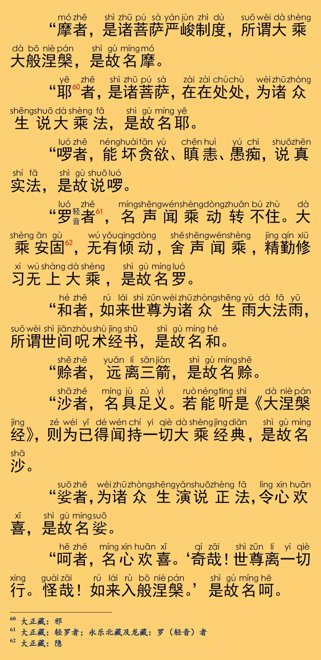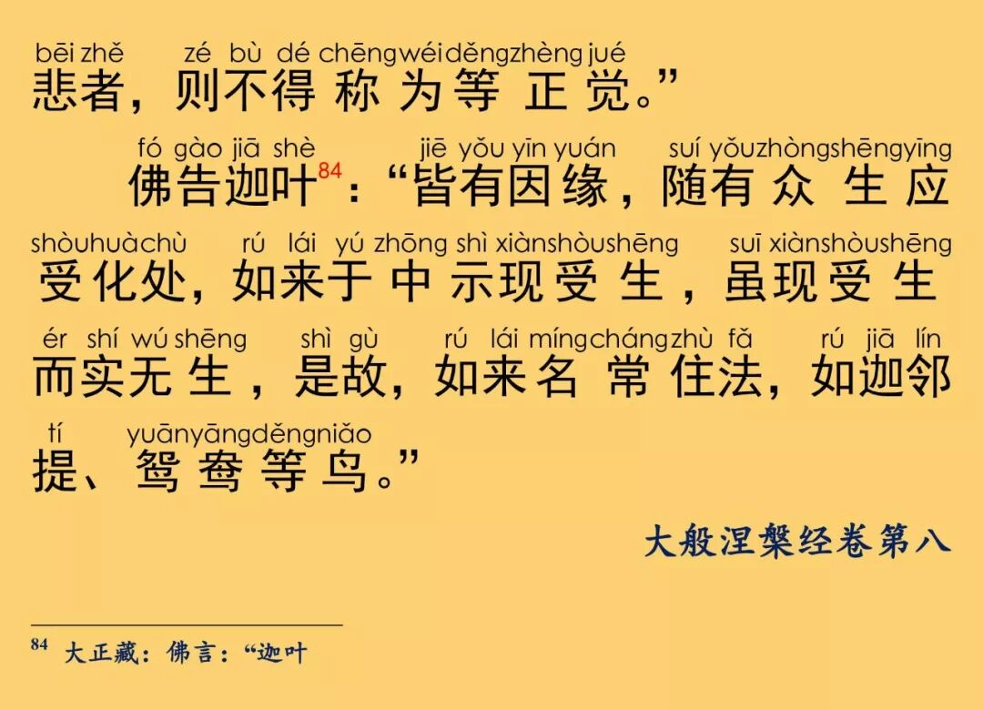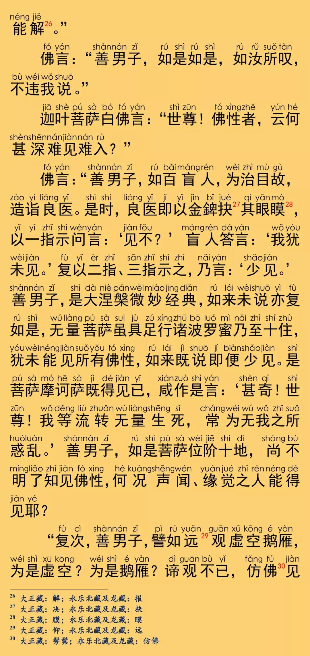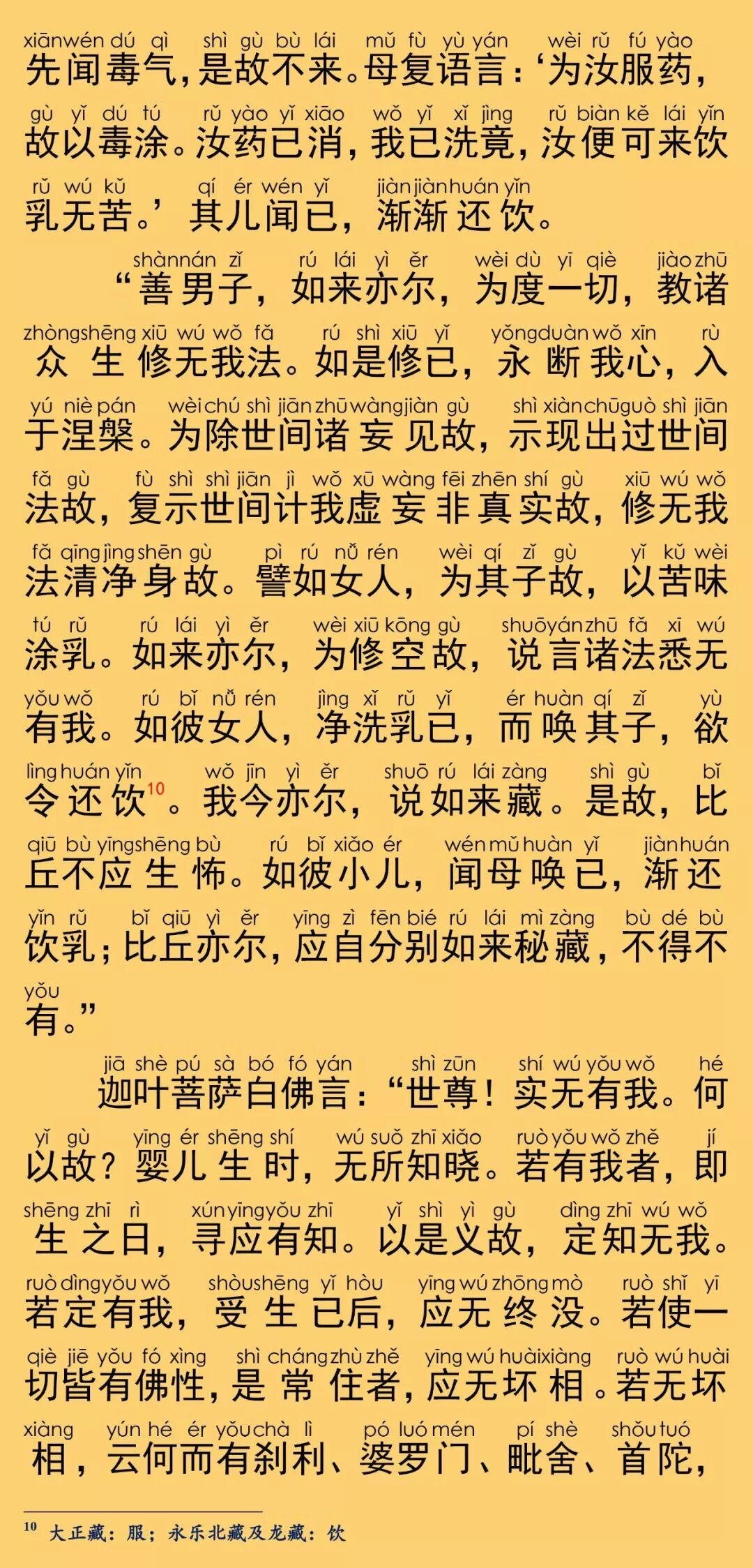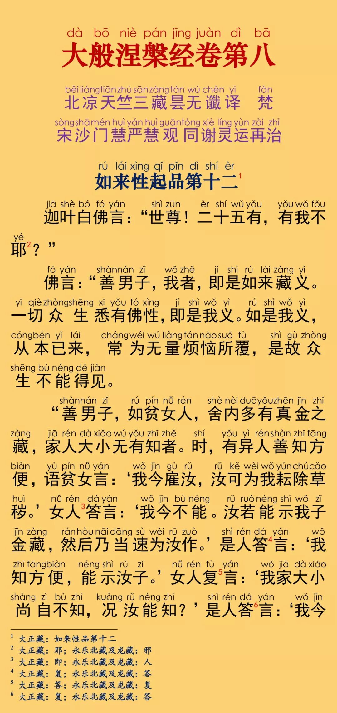 根据《乾隆大藏经》大乘涅槃部,第0110部,北凉天竺三藏昙无谶译梵、宋沙门慧严慧观同谢灵运再治《南本大般涅槃经》(36卷)原藏影印本校正注音。句读及注音仅供参考。设计排版说明:本注音佛经内容,由仁慧草堂编辑设计制作,如需转载请联系作者公众号,特此说明。