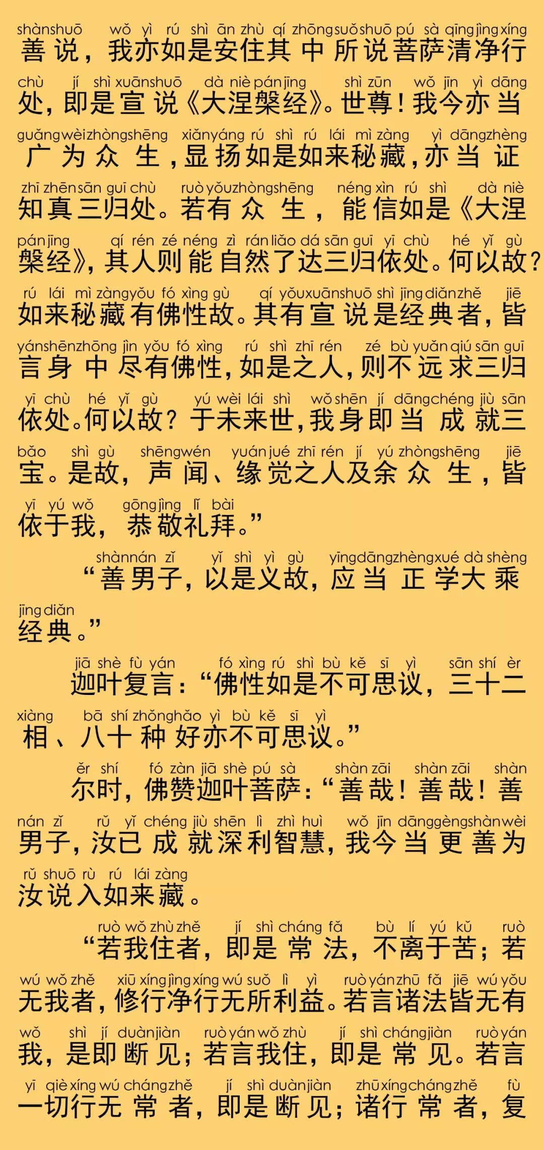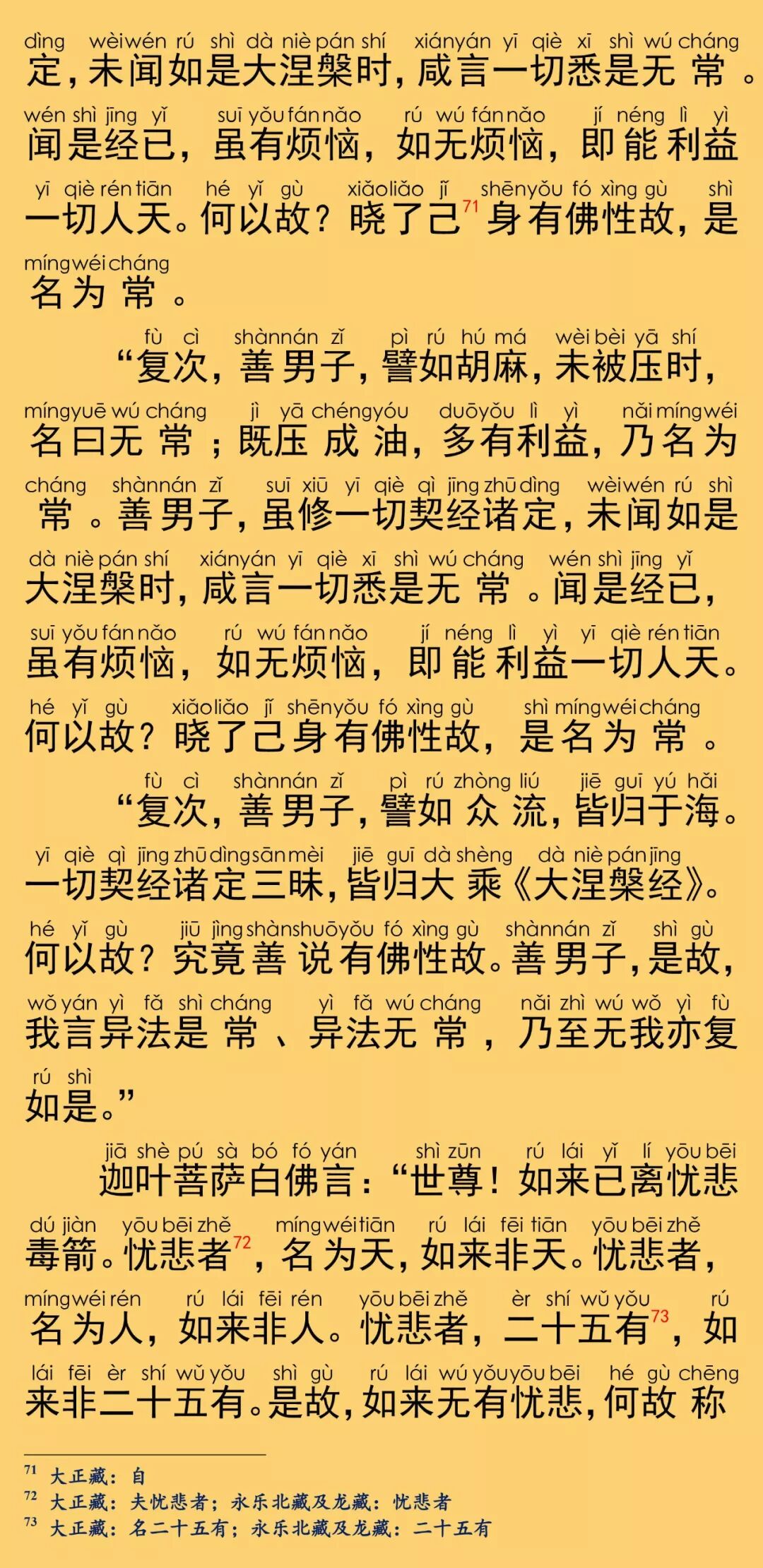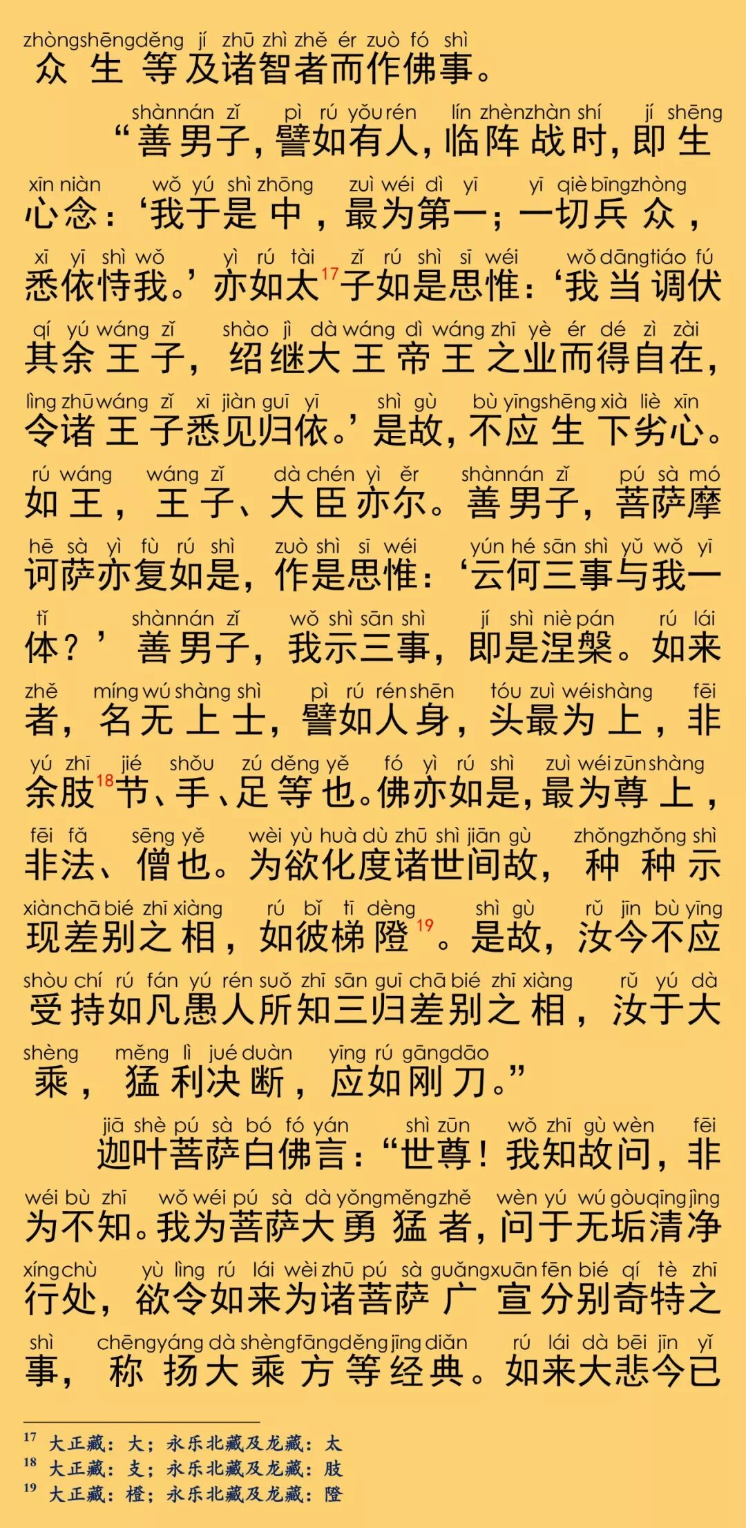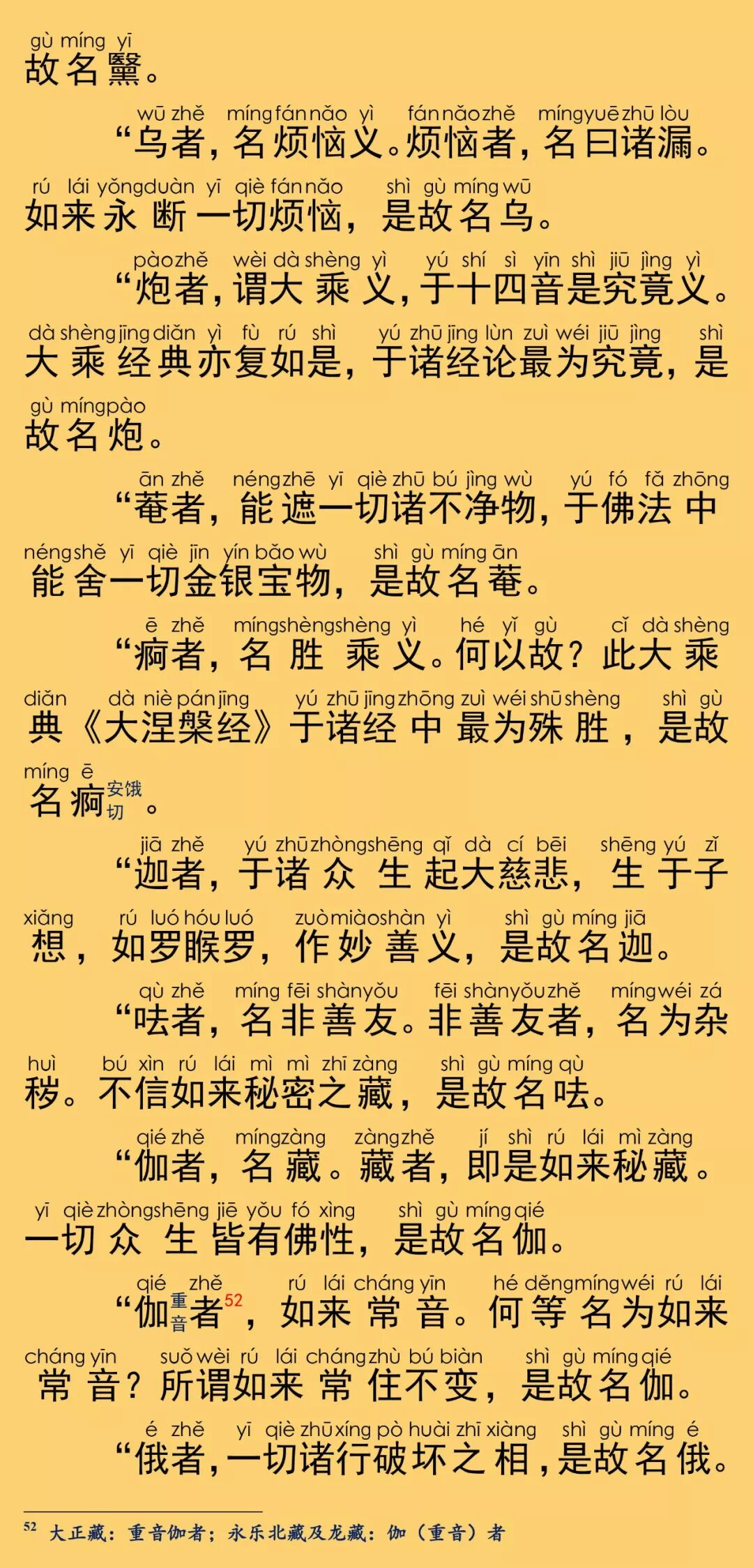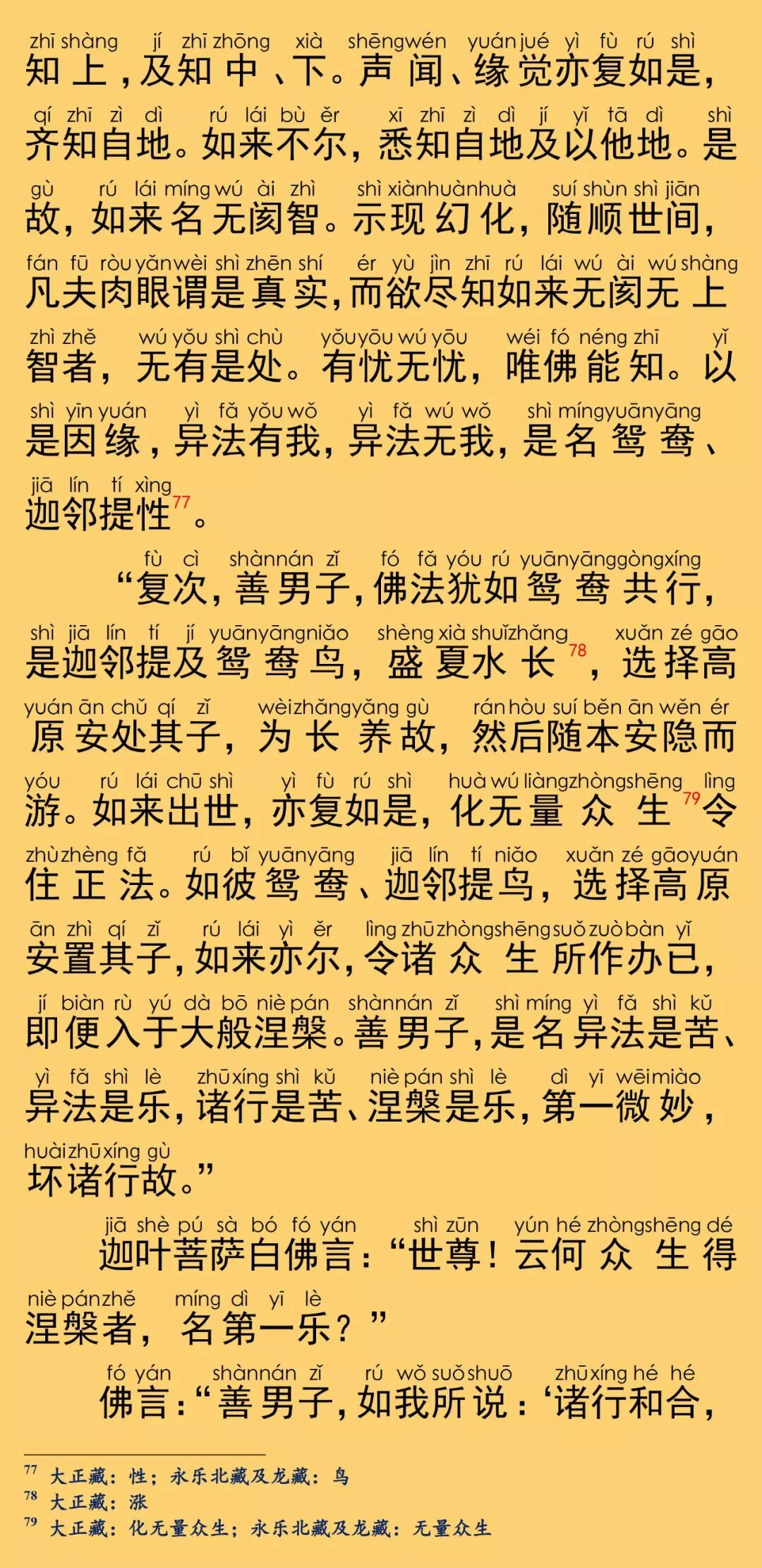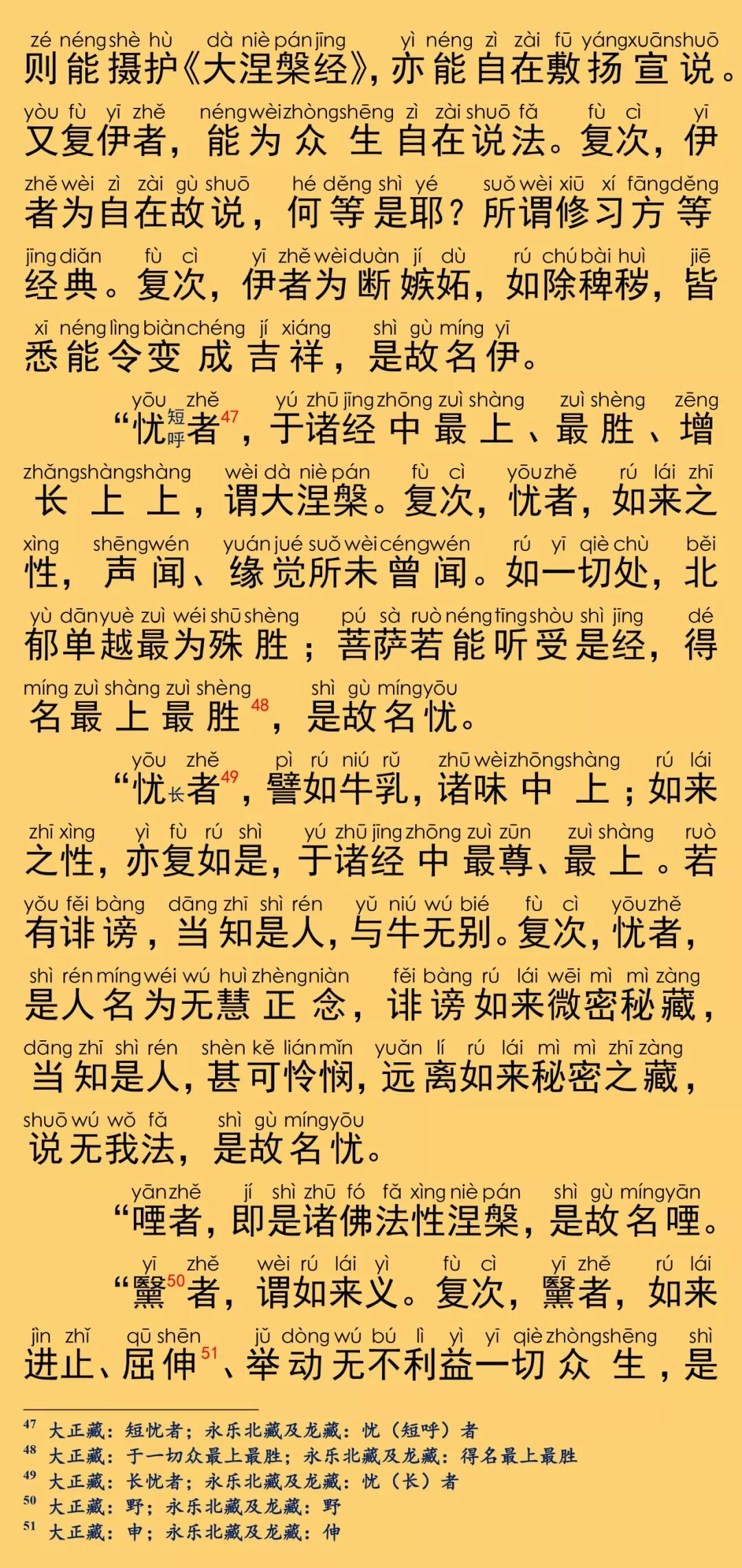 根据《乾隆大藏经》大乘涅槃部,第0110部,北凉天竺三藏昙无谶译梵、宋沙门慧严慧观同谢灵运再治《南本大般涅槃经》(36卷)原藏影印本校正注音。句读及注音仅供参考。设计排版说明:本注音佛经内容,由仁慧草堂编辑设计制作,如需转载请联系作者公众号,特此说明。