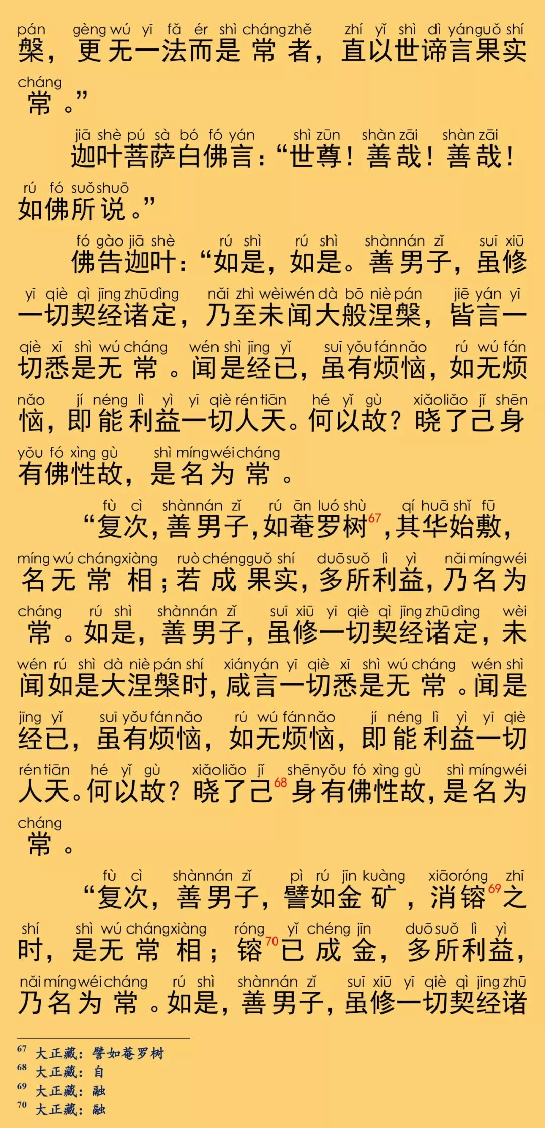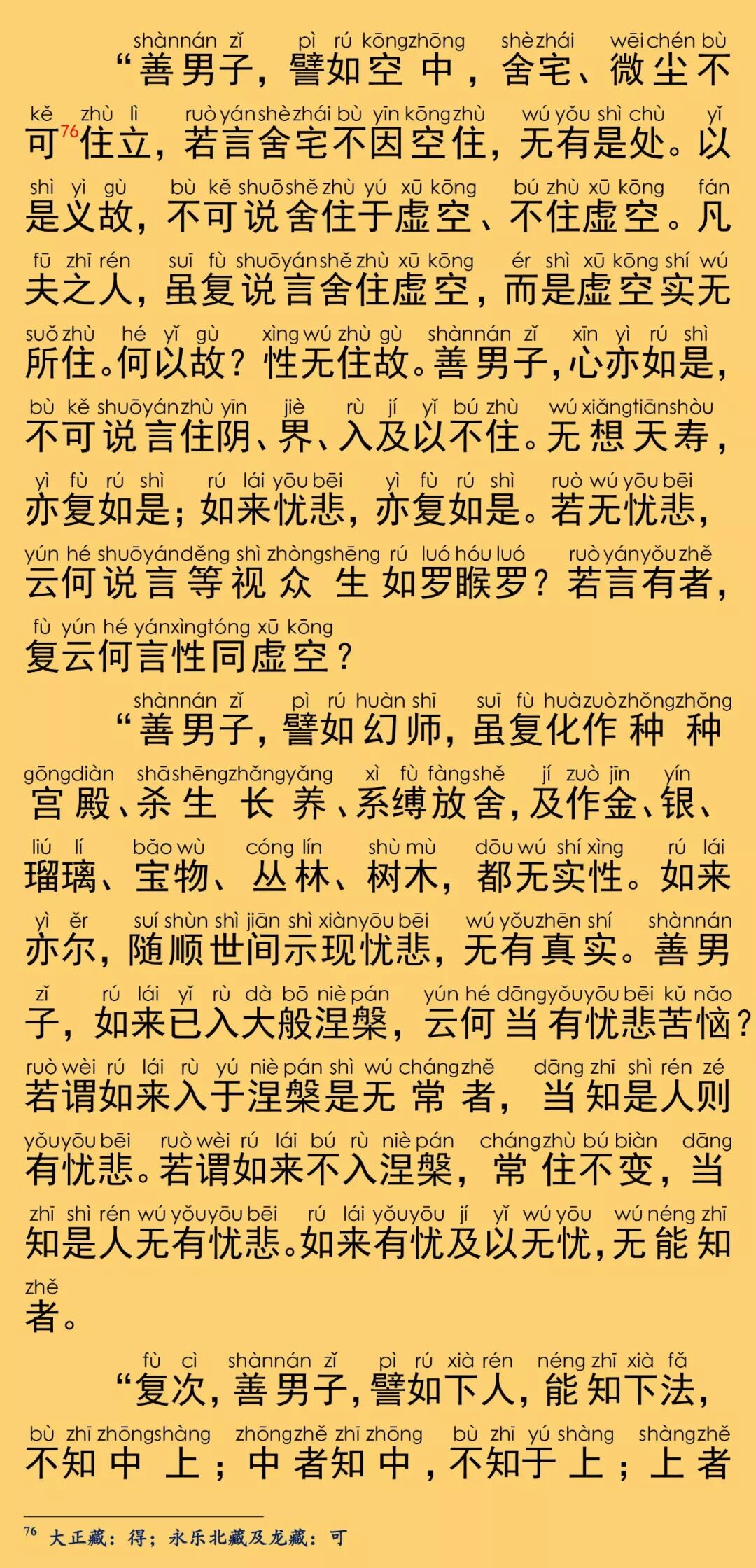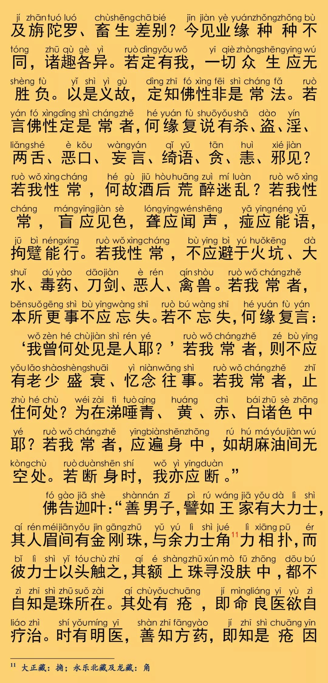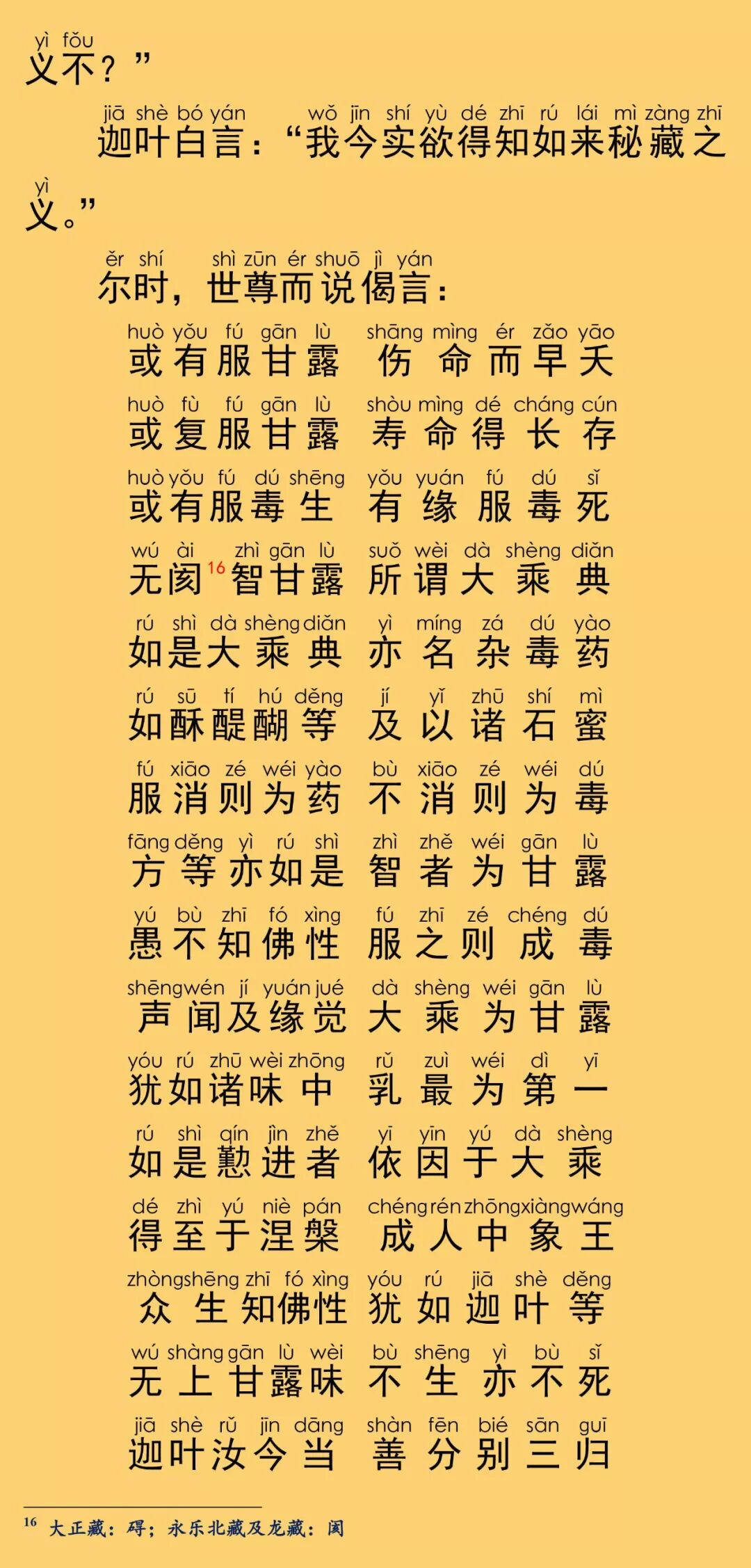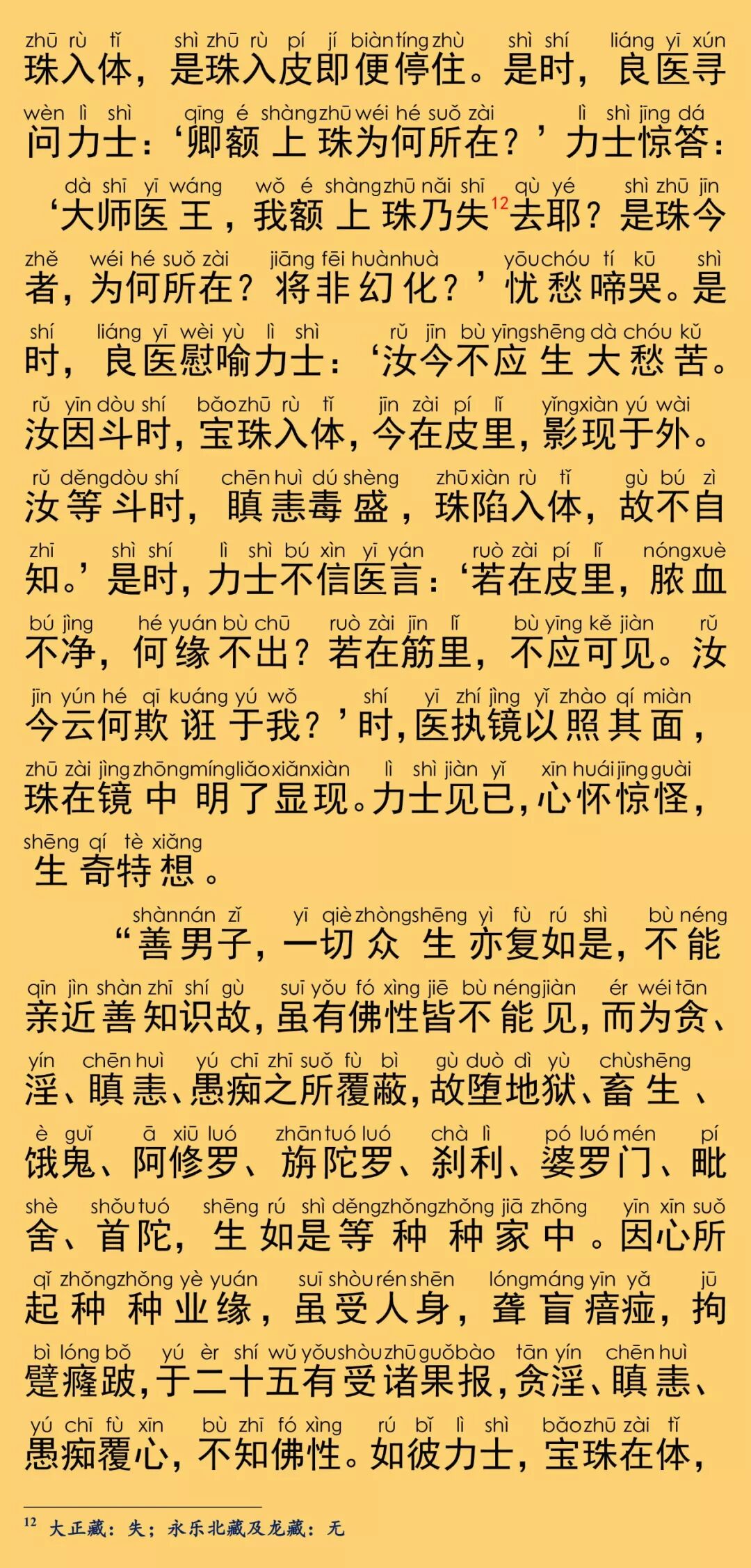 根据《乾隆大藏经》大乘涅槃部,第0110部,北凉天竺三藏昙无谶译梵、宋沙门慧严慧观同谢灵运再治《南本大般涅槃经》(36卷)原藏影印本校正注音。句读及注音仅供参考。设计排版说明:本注音佛经内容,由仁慧草堂编辑设计制作,如需转载请联系作者公众号,特此说明。