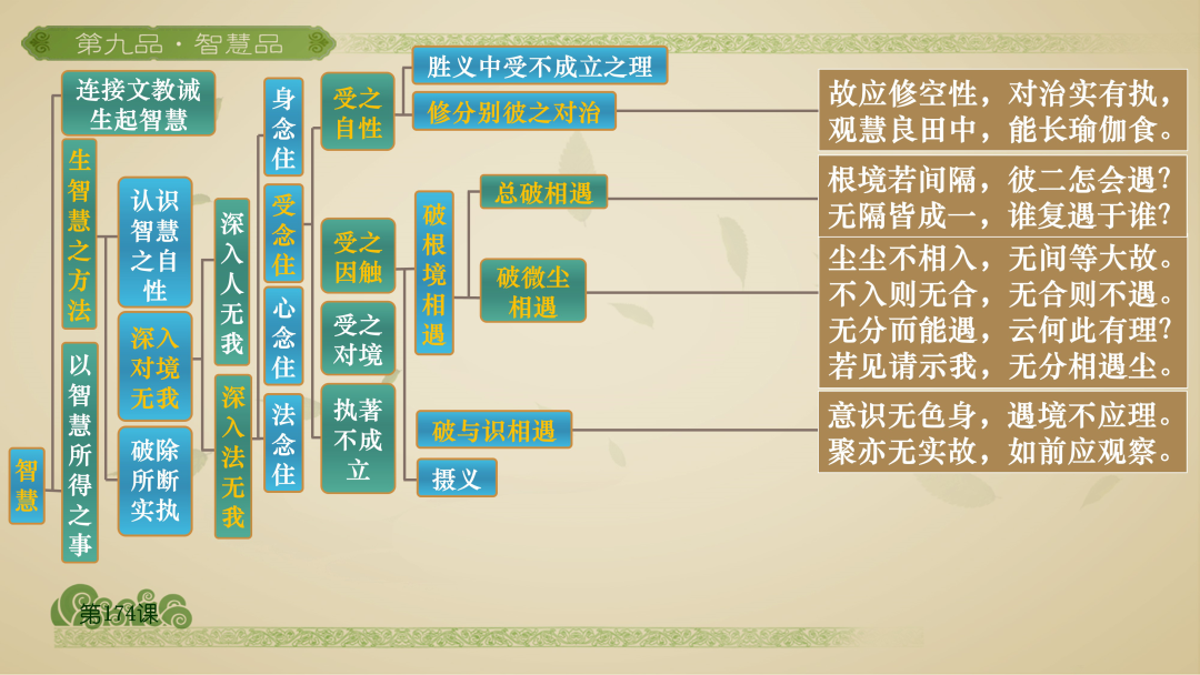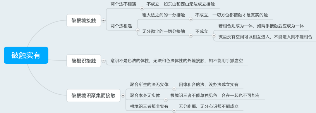C. 根、境、识并非实有:前面在身念处部分,遮破了无分微尘这个组成色法最小单元的存在。在后面的心念处也会学到心识并非实有。如果根、境、识都非实有,那三者聚合如何能产生实有的触呢?(详见颂词5)